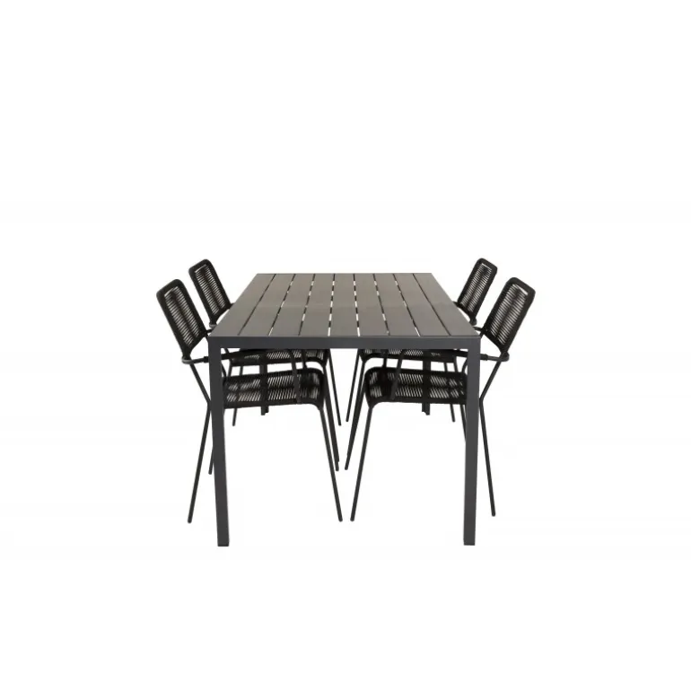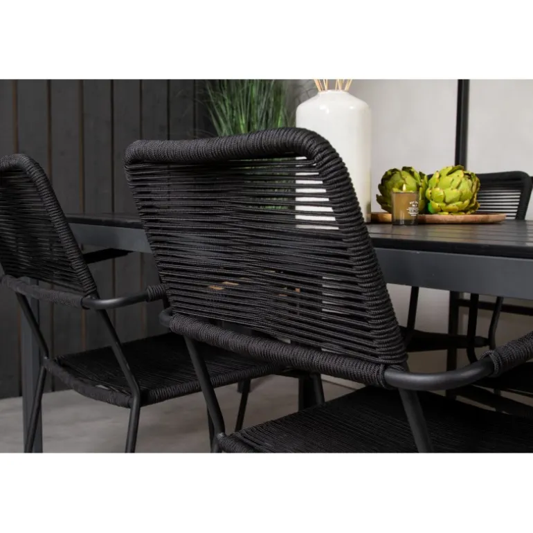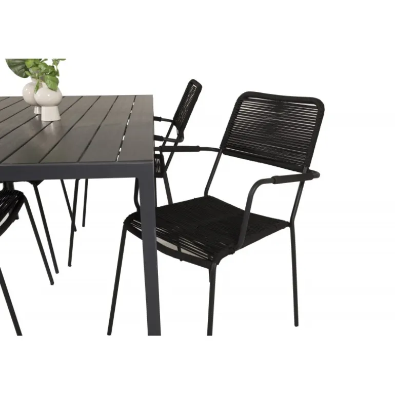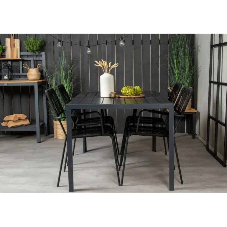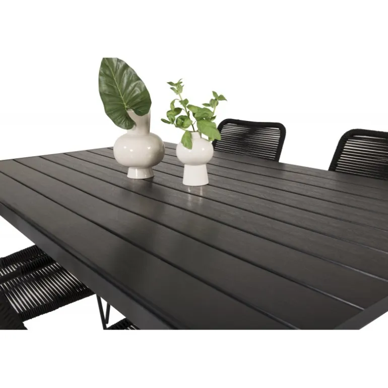Et trendy Loungesæt – Havemøbelsæt perfekt til terrassen! Det klassiske spisbord har en lækker polywood bordplade. Her sammen med vores moderne spisebordsstole Lindos med sæde i sort flettet reb. Lad din terrasse blive prydet af dette iøjnefaldende Loungesæt – Havemøbelsæt og nyd sene sommeraftener!