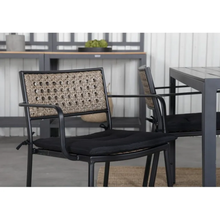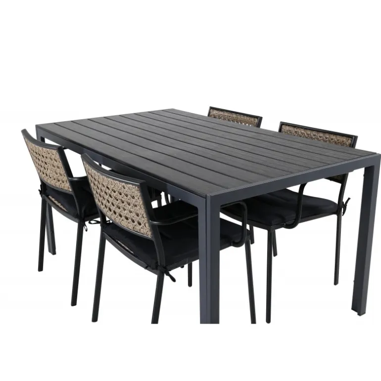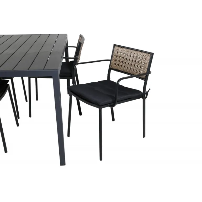 En harmonisk Loungesæt – Havemøbelsæt til sommermåltider! Paola spisebordsstol er en perfekt blanding af dekorativt træ og stilfuld sort farve. De fine kontraster mellem farverne skaber en harmonisk følelse i udendørsområdet! Her i perfekt kombination med vores rektangulære spisebord Break i sort aluminium og bordplade i aintwood. Simpelthen en gennemtænkt Loungesæt – Havemøbelsæt, som du nemt kan skabe charmerende udendørsmiljøer med!