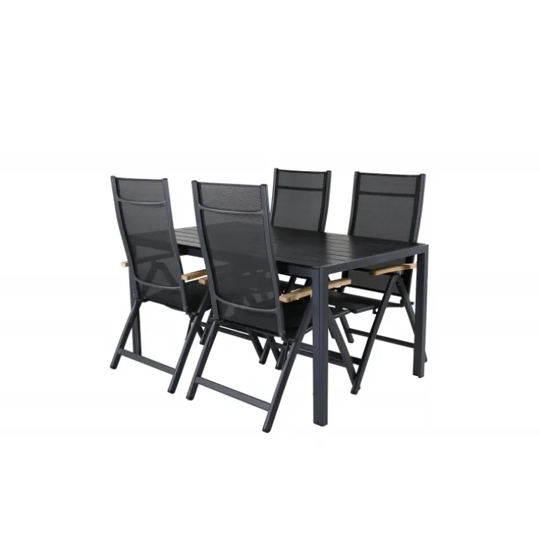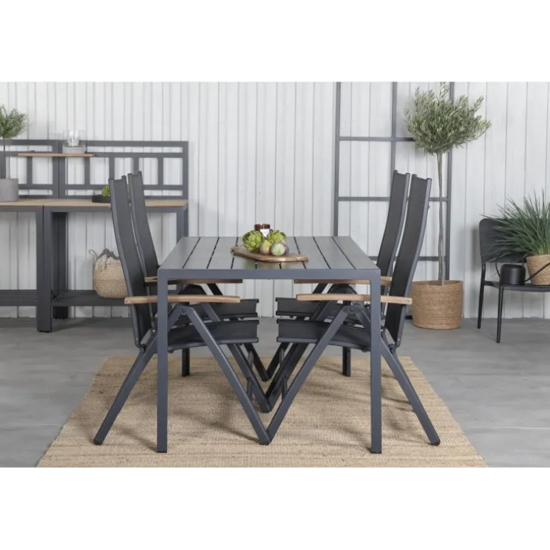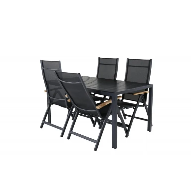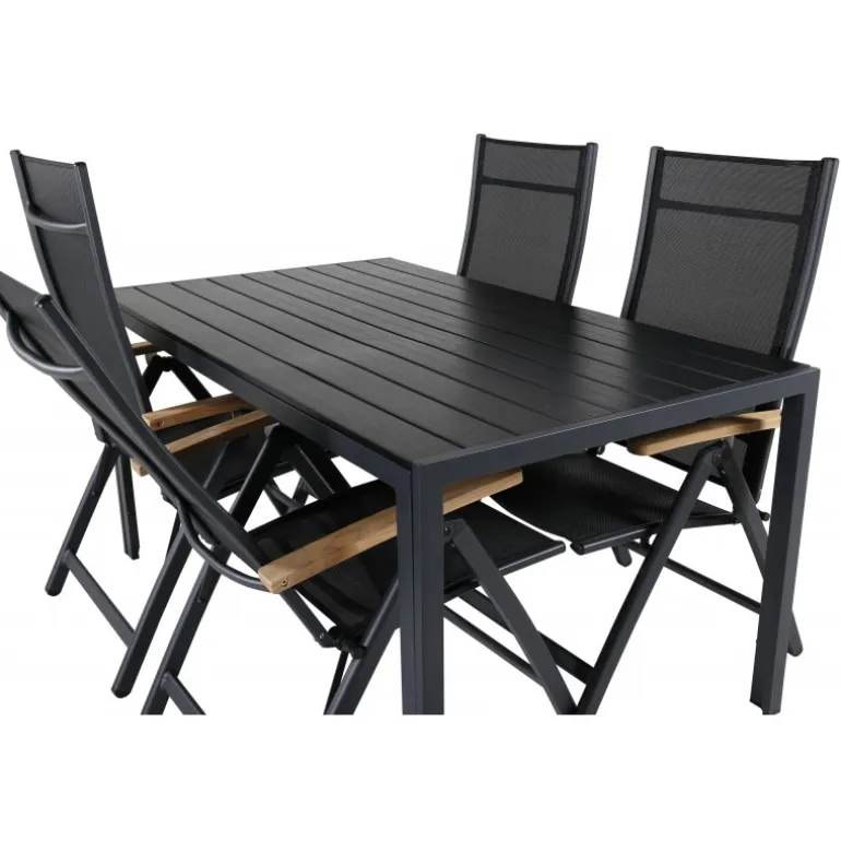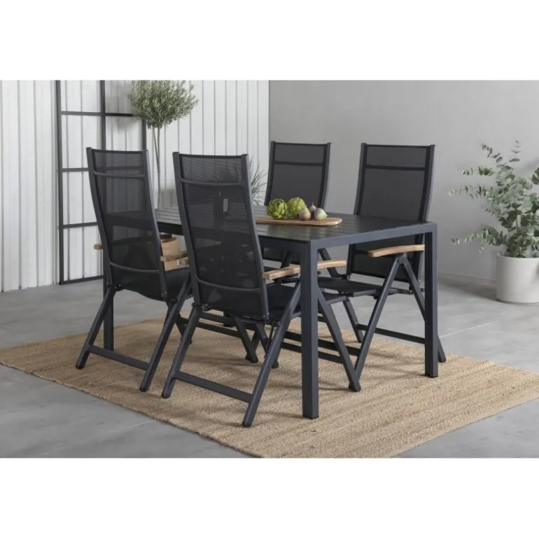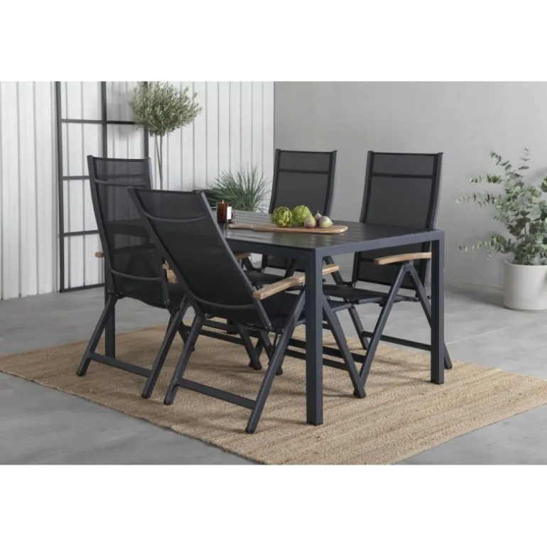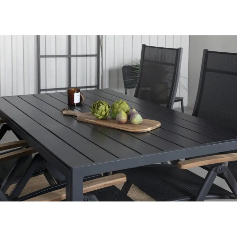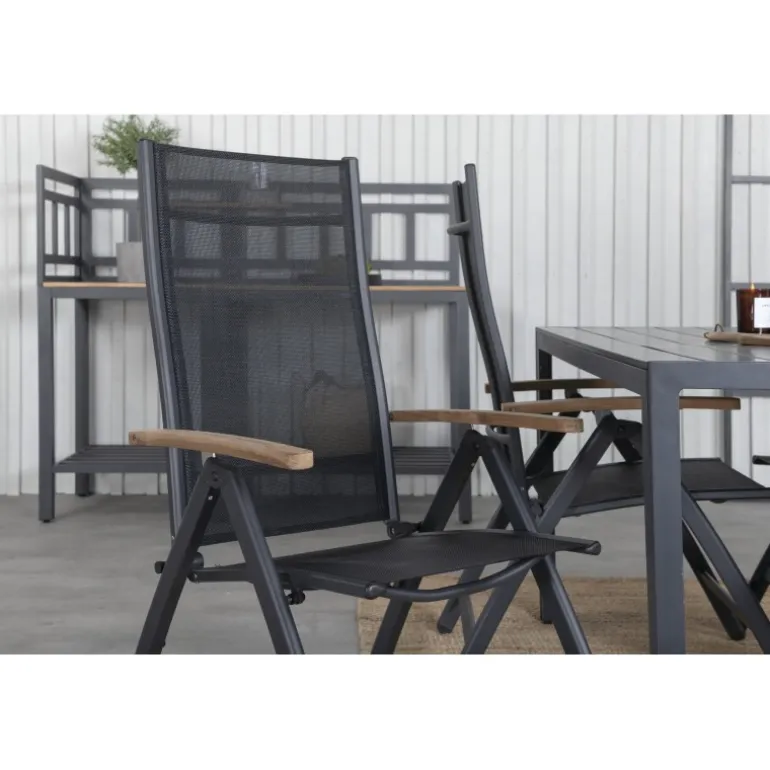 Sid komfortabelt denne sommer og synk ned i disse lækre spisebordsstole fra Panama-serien. Disse foldestole har et stilfuldt design i holdbart materiale af sort tekstil og lækre detaljer i teak. Her sammen med vores rektangulære spisebord Break i sort farve. Bordpladen er i aintwood og understellet i sort aluminium. Her sidder du og dine gæster komfortabelt og kan nyde lange, hyggelige måltider på terrassen!