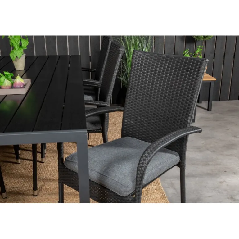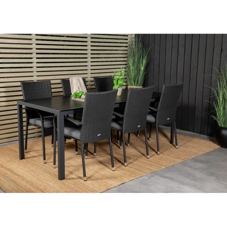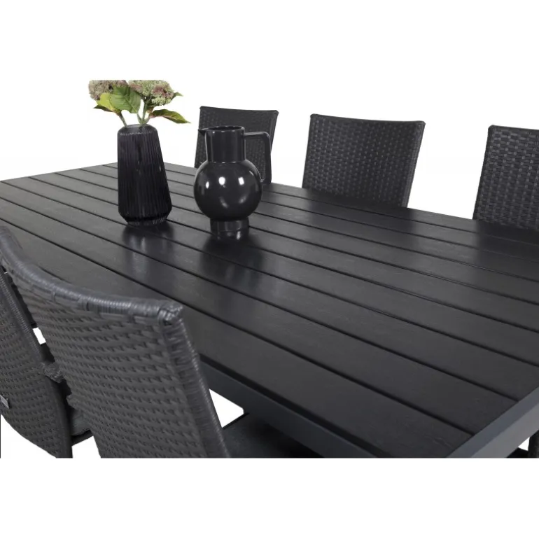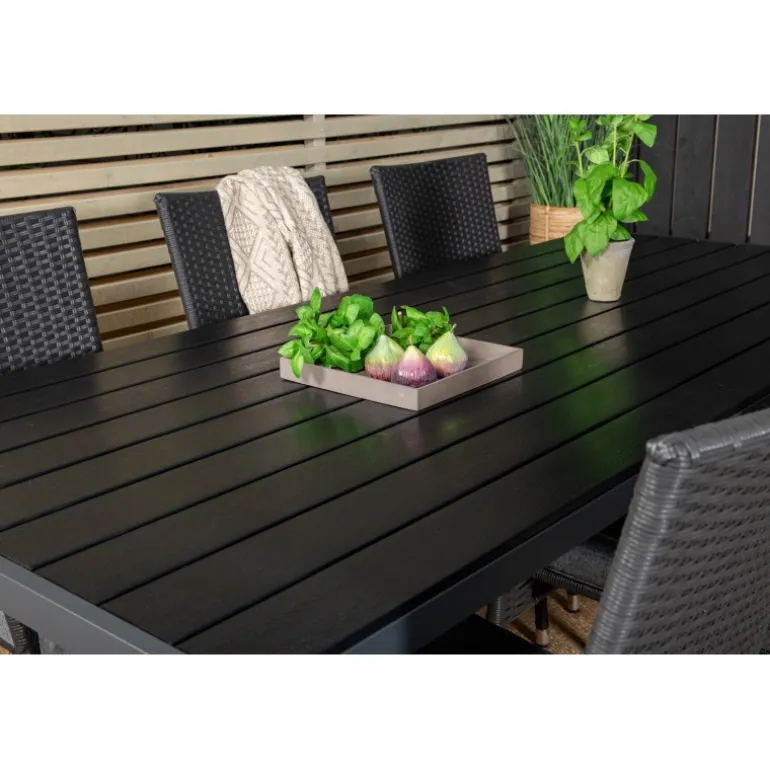 I et konsekvent sort og elegant design får du et Loungesæt – Havemøbelsæt, der står tidens prøve. Spisebordet Break med vores sorte, stilfulde spisebordsstole Anna i kunstig rattan.