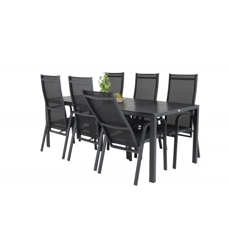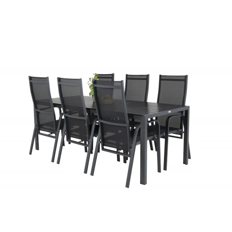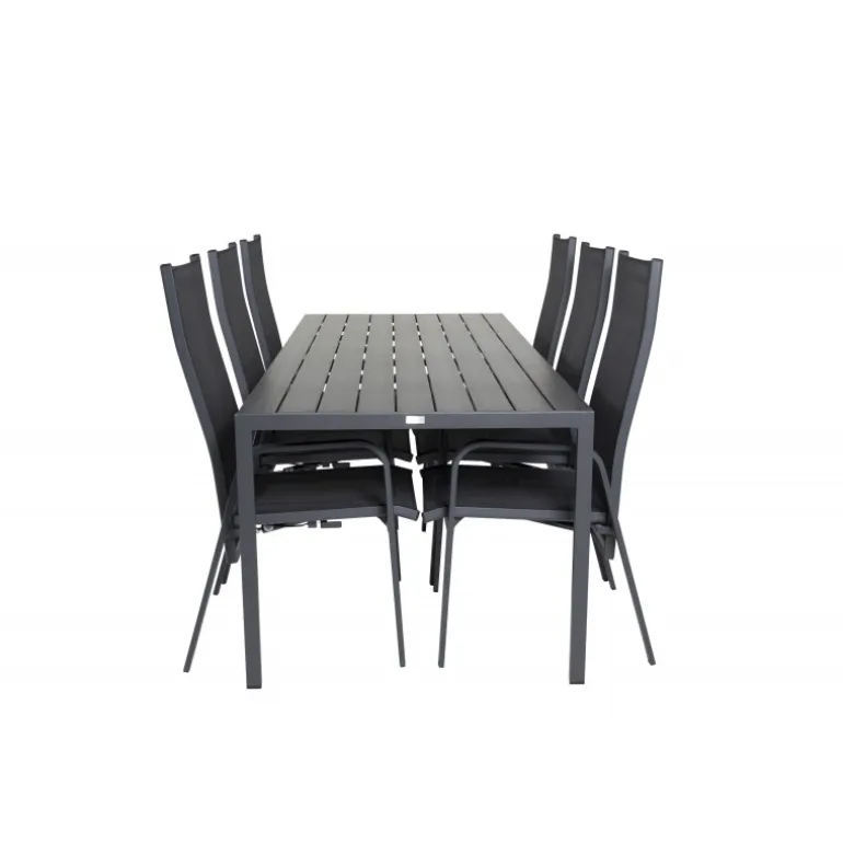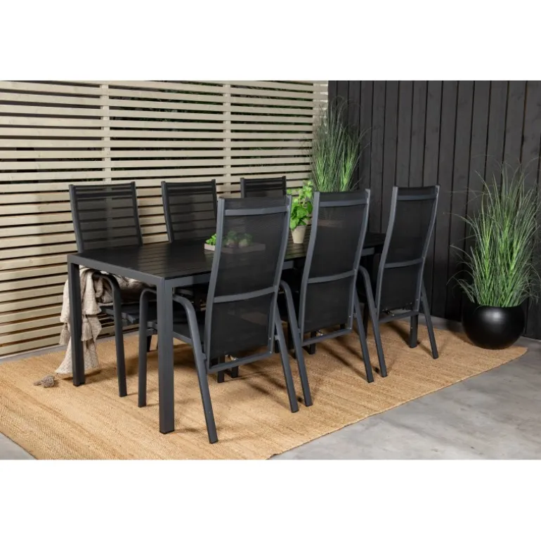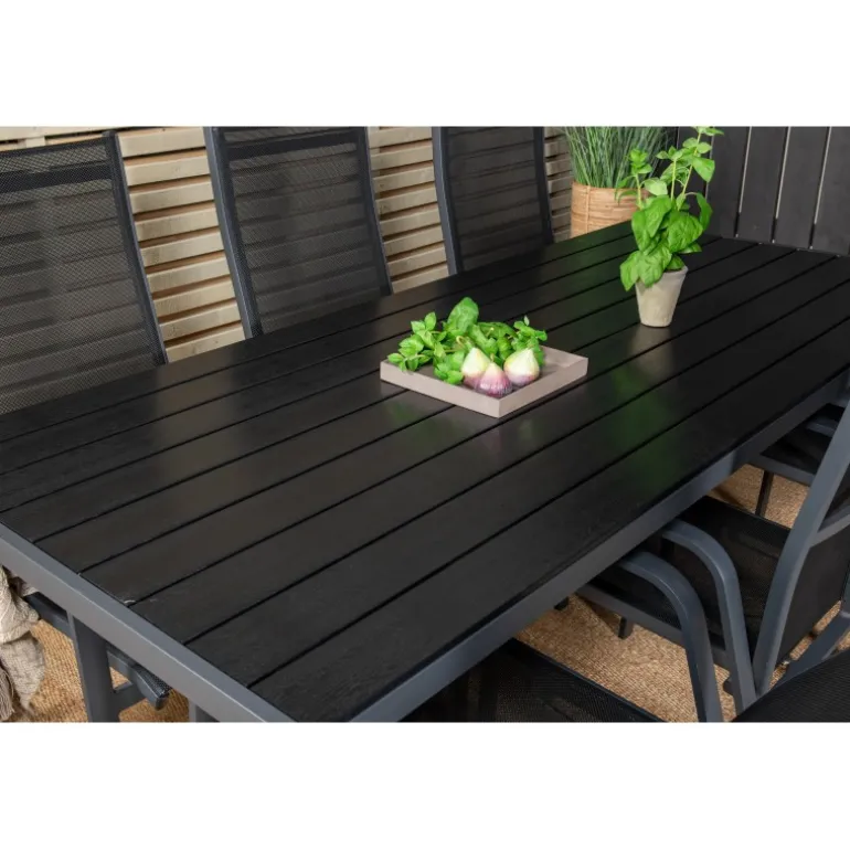 Vores stilfulde dining table Break er kombineret med de siddevenlige og foldbare stole Copacabana. Madgruppen er elegant matchet i sort. Inviter til mange sociale øjeblikke fremover!