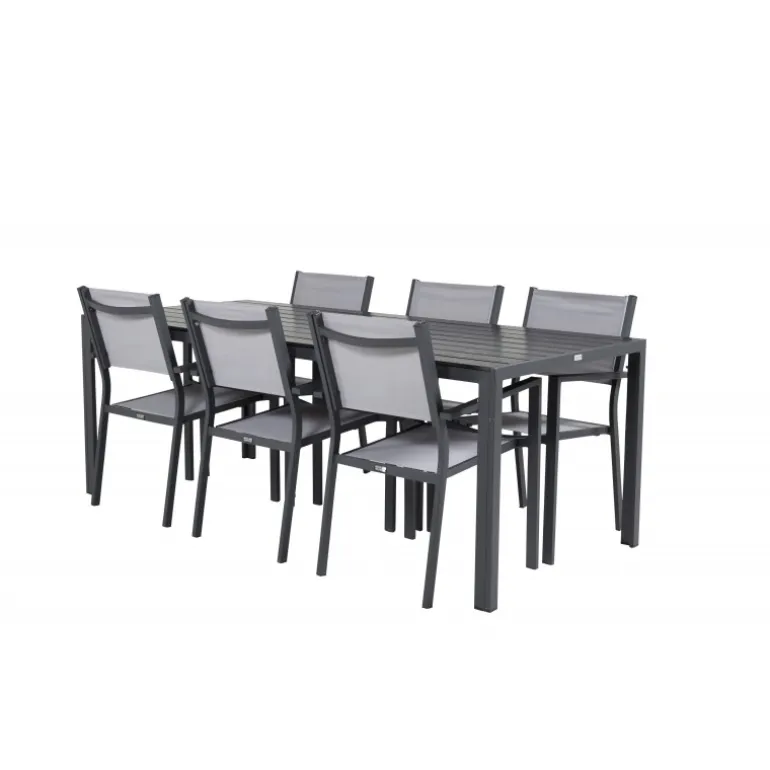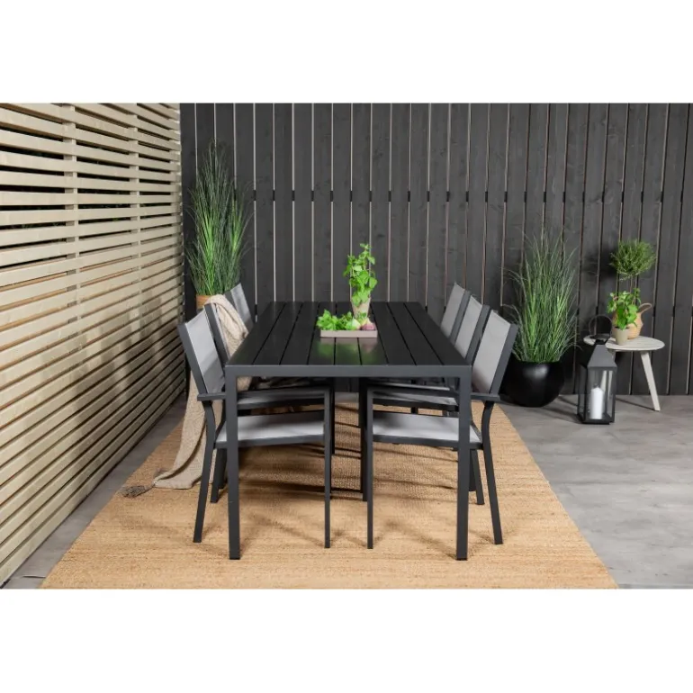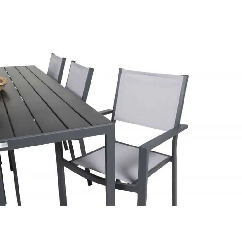 Det klassiske Break rektangulære Loungesæt – Havemøbelsæt passer perfekt ind i de fleste husholdninger! Spisebordet Break, sammen med stolene fra Copacabana-serien, er skabt til dem, der ønsker at skabe en hyggelig og moderne atmosfære i hjemmet. Lavet af aintwood og aluminium, kommer dette sæt i stilfulde sorte og grå nuancer. Bemærk, at samling kræves.