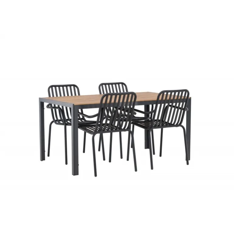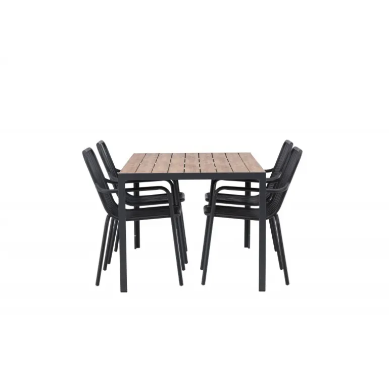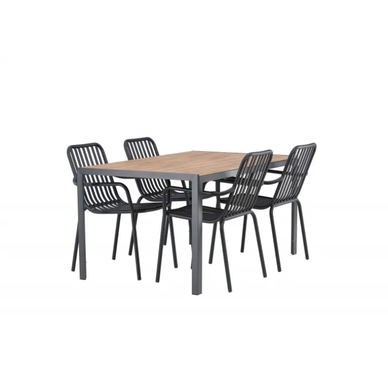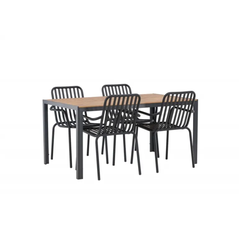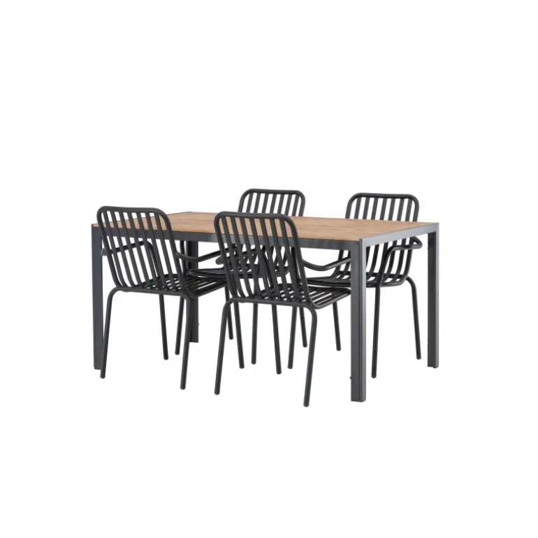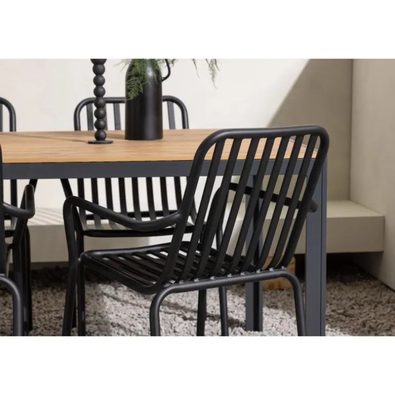 Skab en trendy stemning på din terrasse med et Loungesæt – Havemøbelsæt, der virkelig matcher! Vores rektangulære spisebord Break har lige linjer i klassisk nordisk design med en bordplade i krydsfiner og bordben i sort aluminium. Her i en stilfuld kombination med 4 spiseborde fra serien Beijing. Stolens ribbede design og sodsorte farve gør den både moderne og tidløs. Lavet af aluminium, der gør den let at flytte rundt på, og som også har integrerede armlæn for ekstra komfort. Her kan du sidde længe og nyde din terrasse! Bordmål: 150×90 cm.