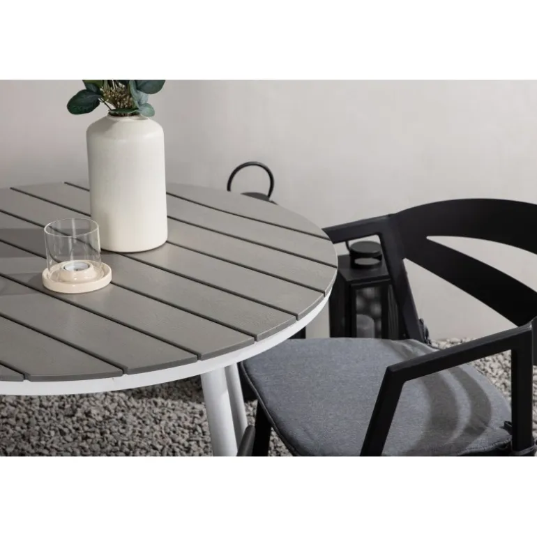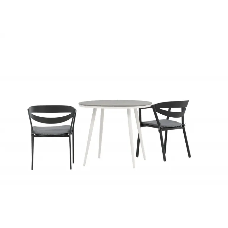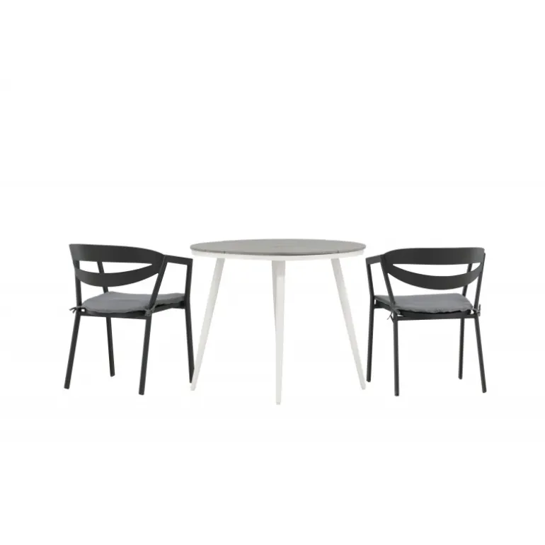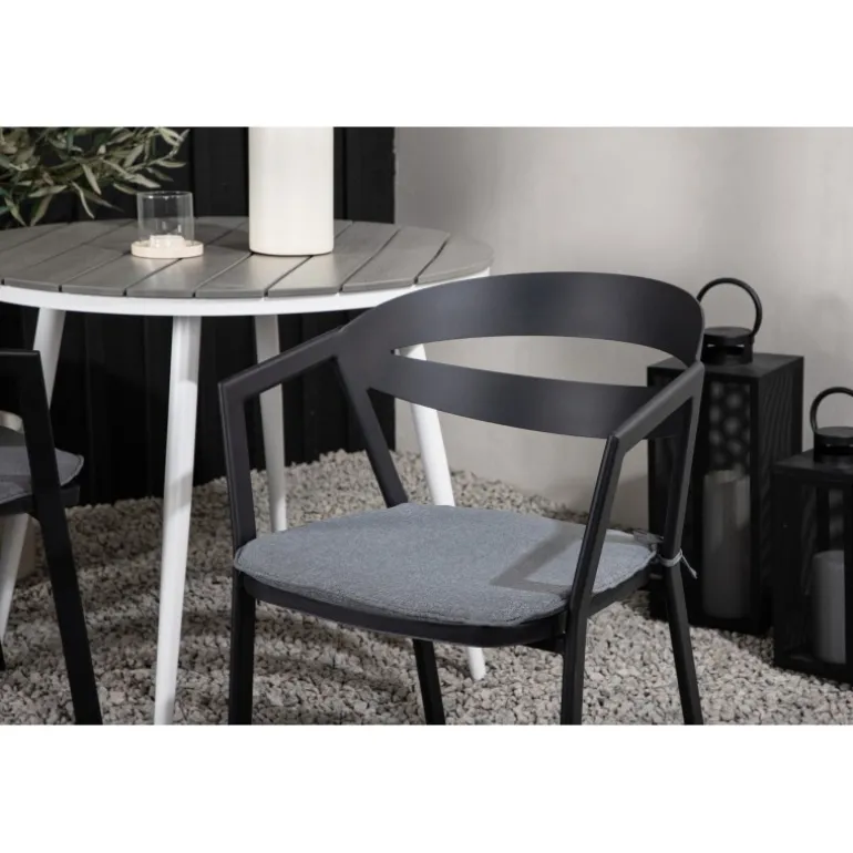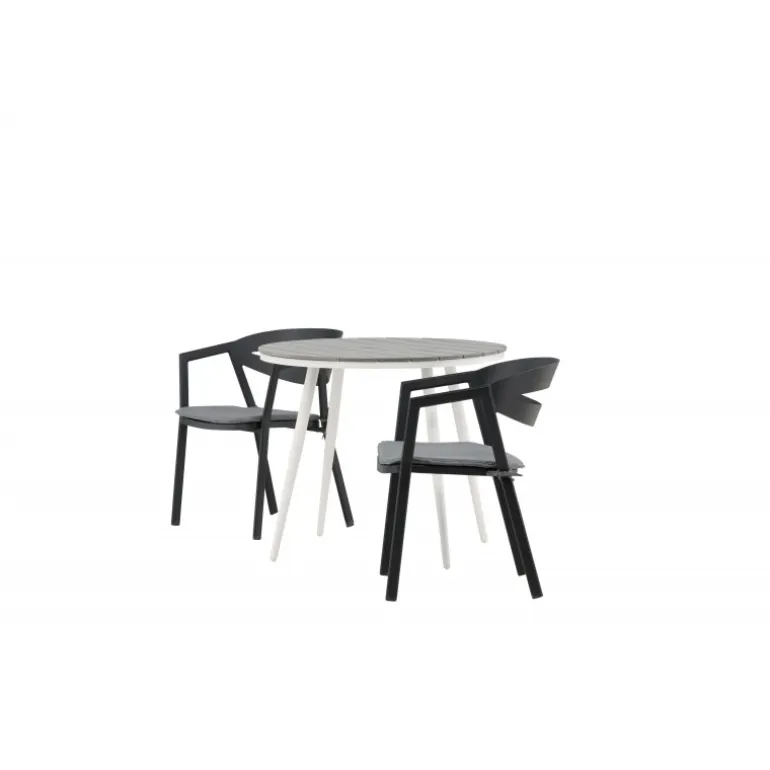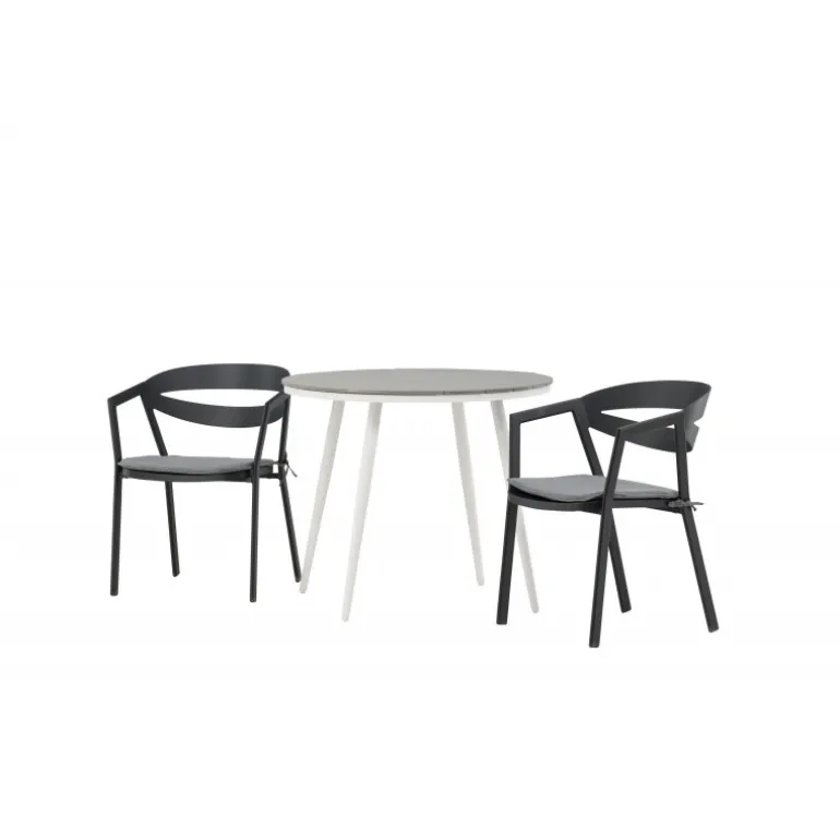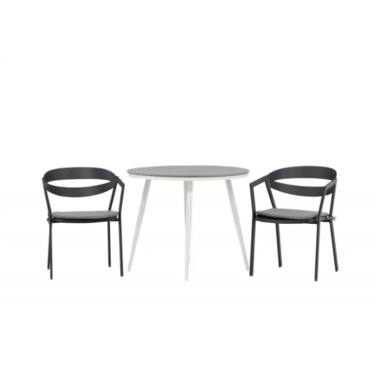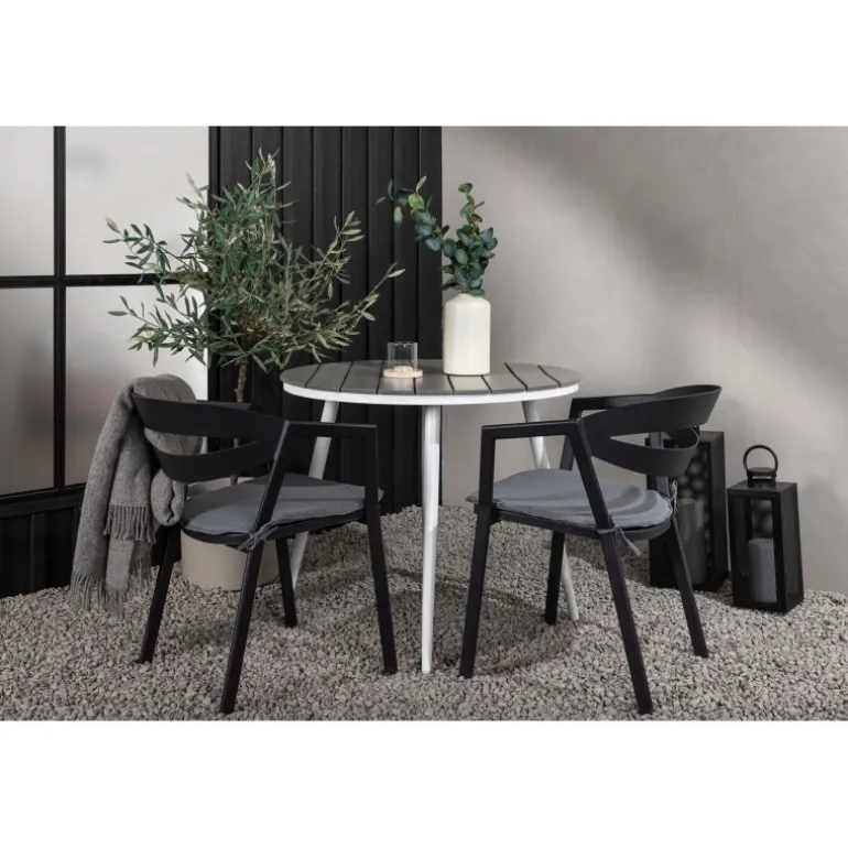 Et indbydende madområde til to, der er garanteret at forlænge hyggelige øjeblikke denne sommer! Break cafébord er det perfekte bord til alle sommerens udendørs morgenmad og eftermiddagskaffe. Bordpladen er i grå Aintwood og de let udadgående ben i hvidt aluminium. Sammen med de trend-sikre spisestole fra serien WORD, der er lige så komfortable som moderne. Stolene har integrerede armlæn i sort aluminium og en grå pude for ekstra komfort. Sid behageligt og nyd hyggelige måltider!