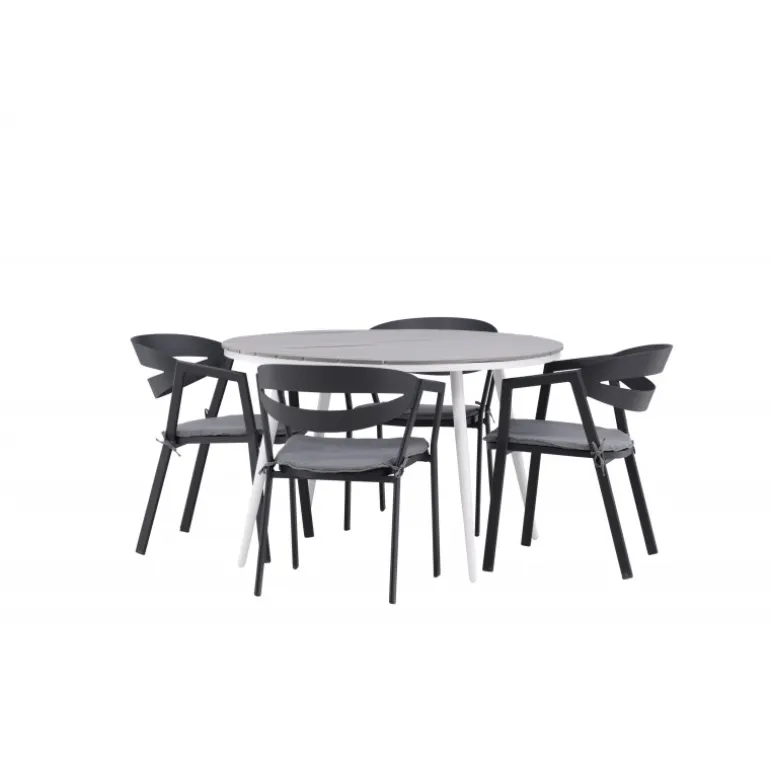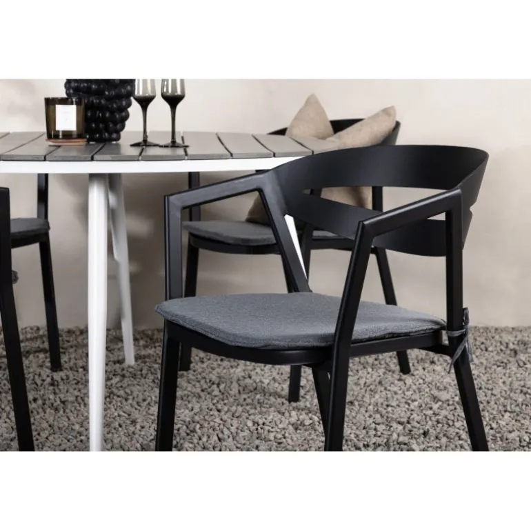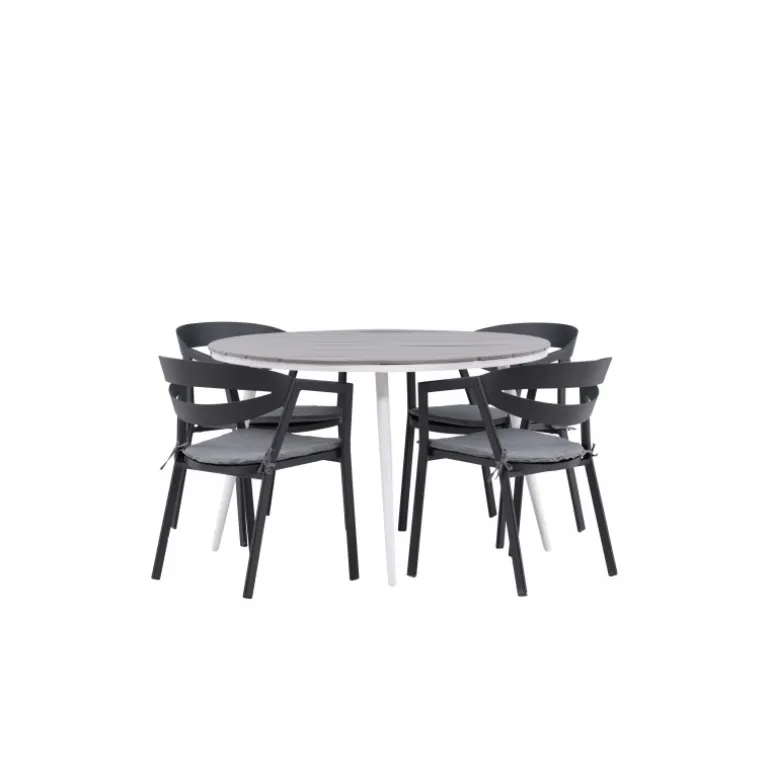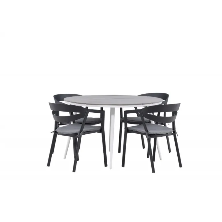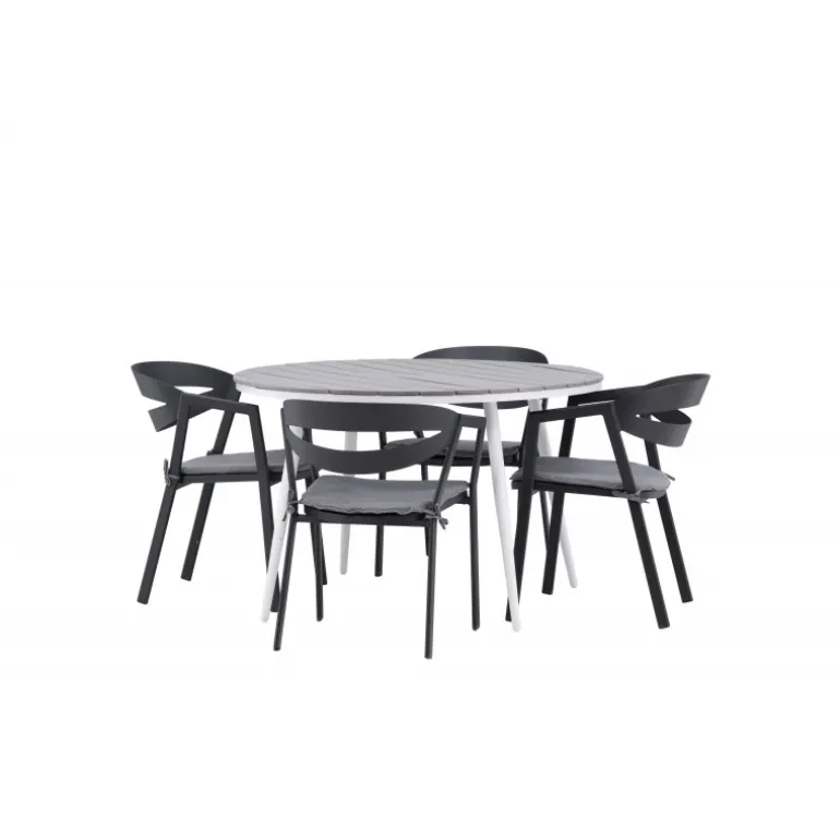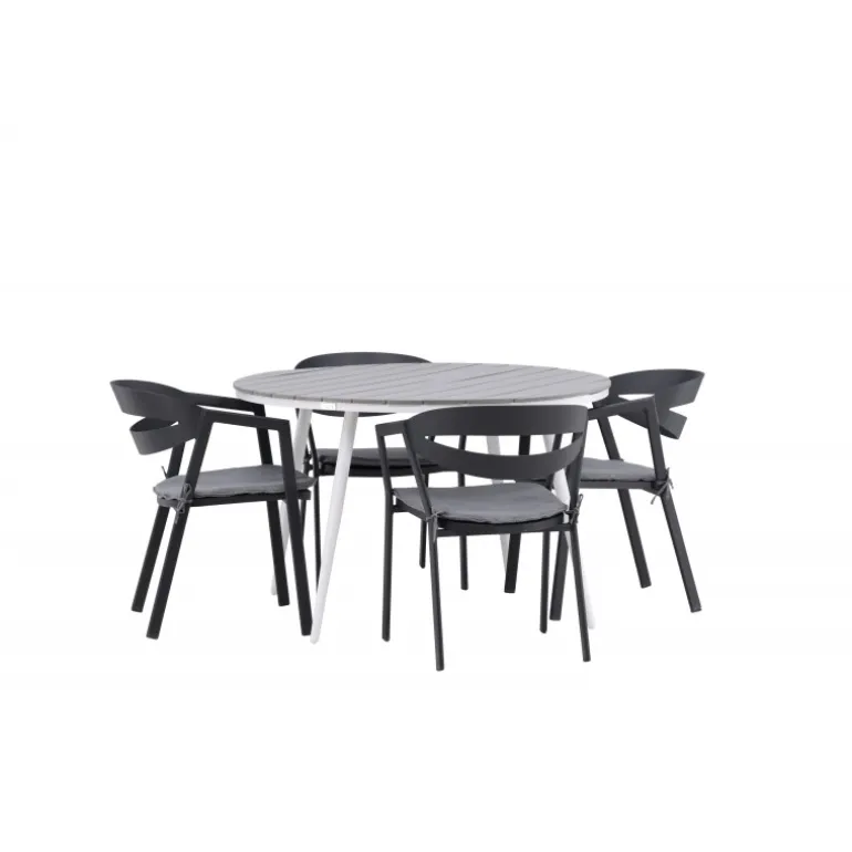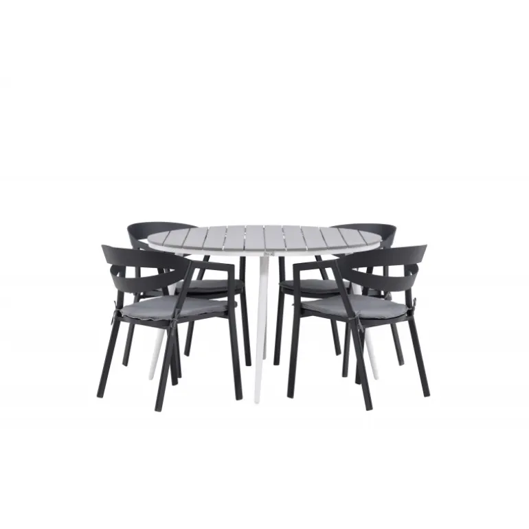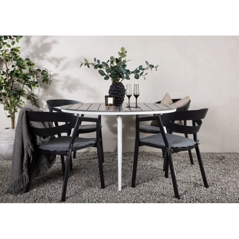 Et rundt Loungesæt – Havemøbelsæt, der kombinerer tidløst design med indbydende former! Spisebordet Break har et klassisk design med en rund bordplade i grå Aintwood og let udadbuede ben i hvid aluminium. Her i perfekt kombination med komfortable spisebordsstole fra serien Slit. Stolene har integrerede armlæn i sort aluminium og en grå pude for ekstra komfort. Skab det perfekte kaffested på din terrasse!