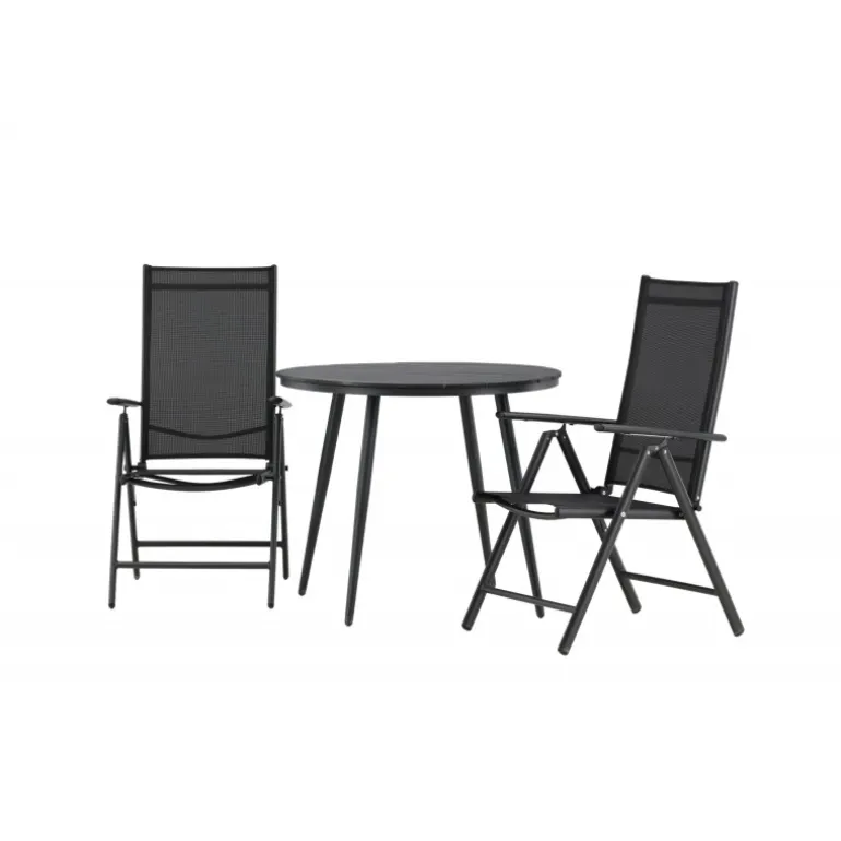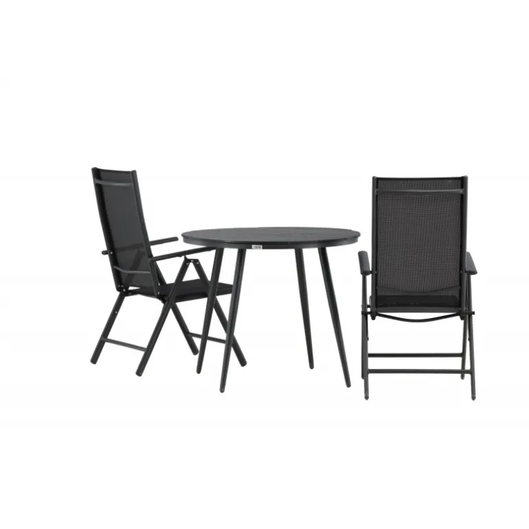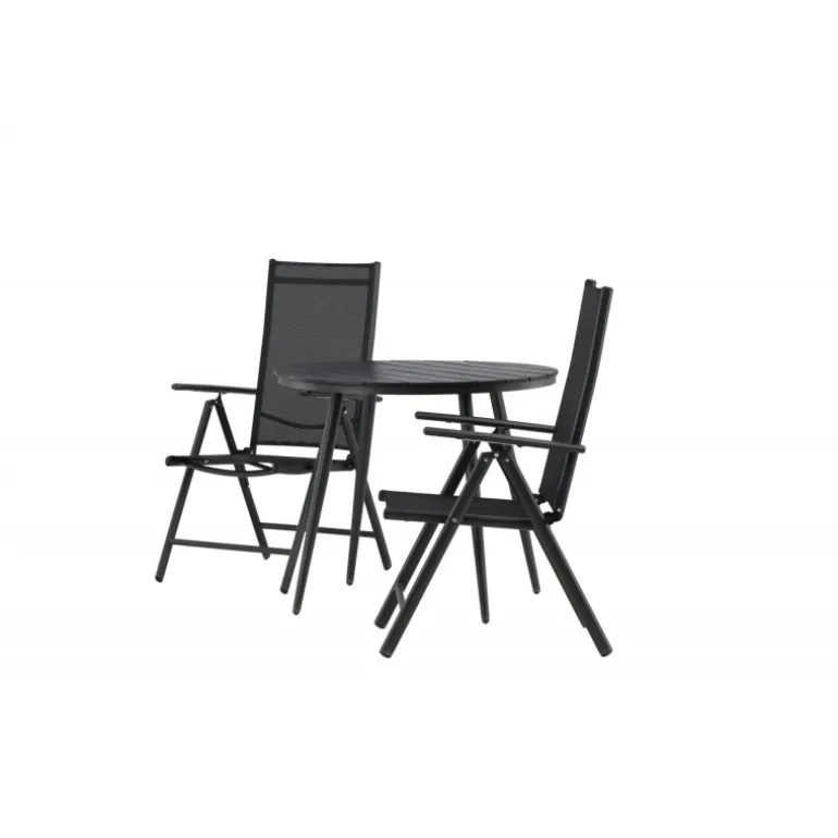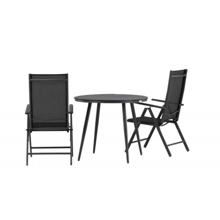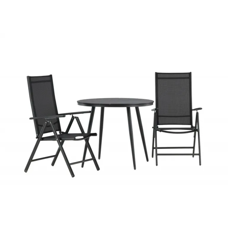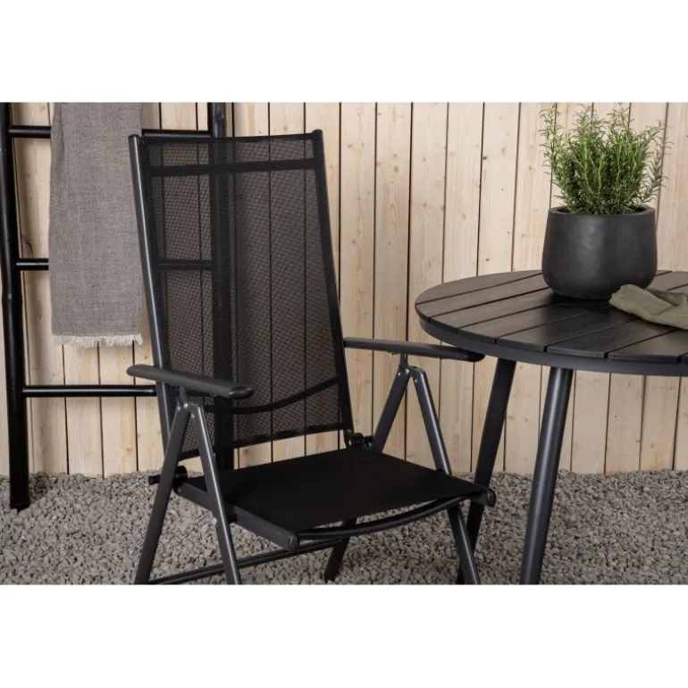 Komfortabelt, indbydende og smukt café-sæt i sort farve fra Break-serien – let at kombinere og tidløst i sit design! Break-bordet har en rund bordplade i Aintwood og et klassisk understel i sort aluminium. Her i perfekt kombination med foldbare spisestole fra samme serie. Ryglænene på stolene i sort tekstil kan justeres for optimal komfort og afslapning omkring spisebordet. Skab det perfekte kaffested på din terrasse!