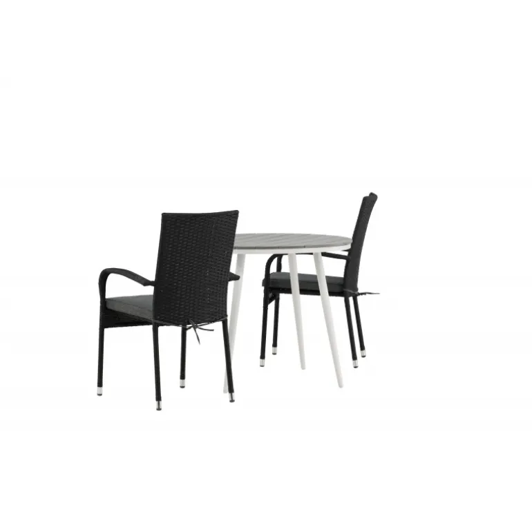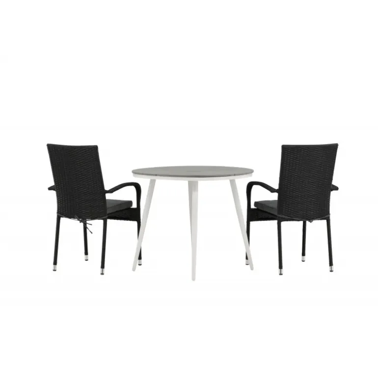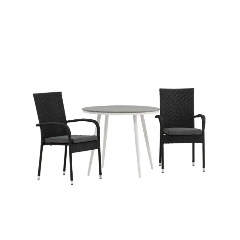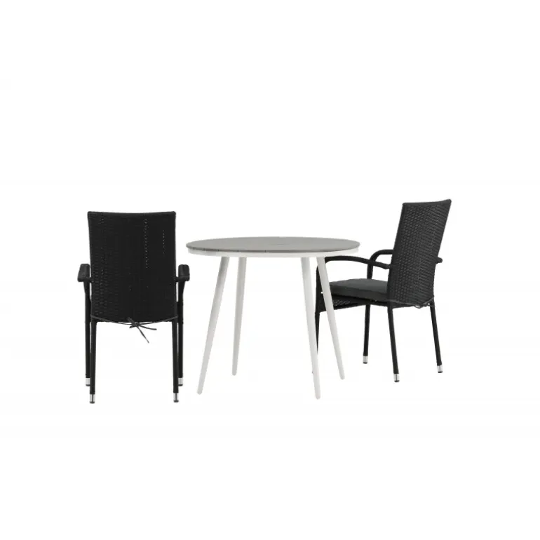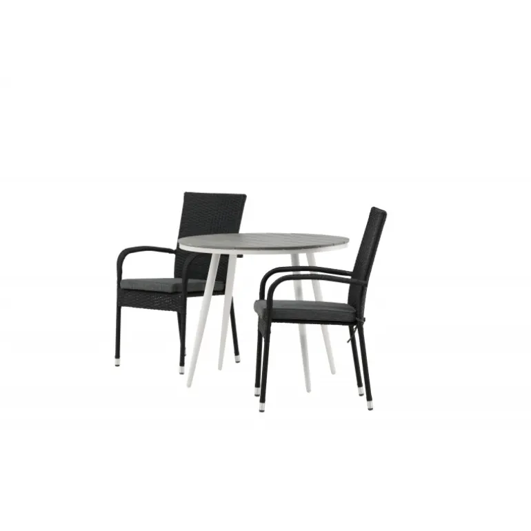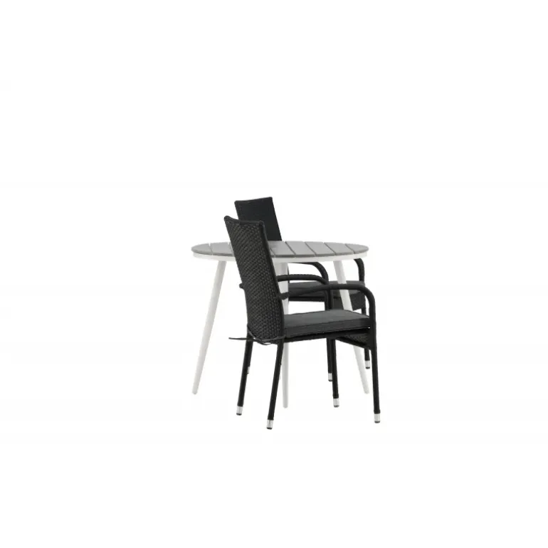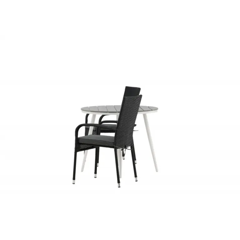 Komfortabelt, indbydende og smukt café-sæt i behagelige farver – let at matche og tidløst i design! Break bordet har en rund bordplade i grå Aintwood og et klassisk hvidt aluminiumsstel. Dimensioner: 90ø cm. Her i perfekt kombination med komfortable spisestole fra Anna serien. Stolen er lavet af kunstig rattan, har integrerede armlæn, er stabelbar og kommer i en lækker sort farve, der er nem at matche med andet møblement. Skab det perfekte kaffested på din terrasse!