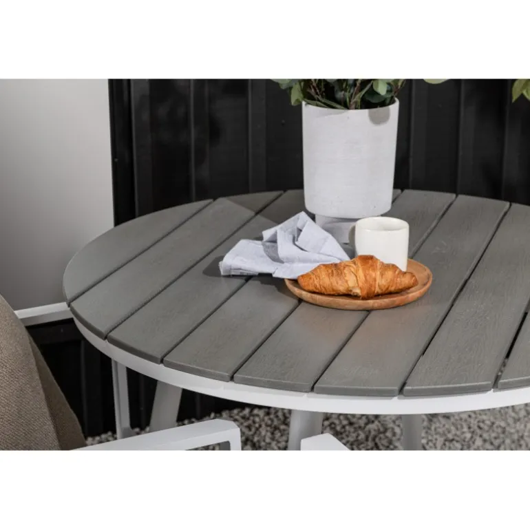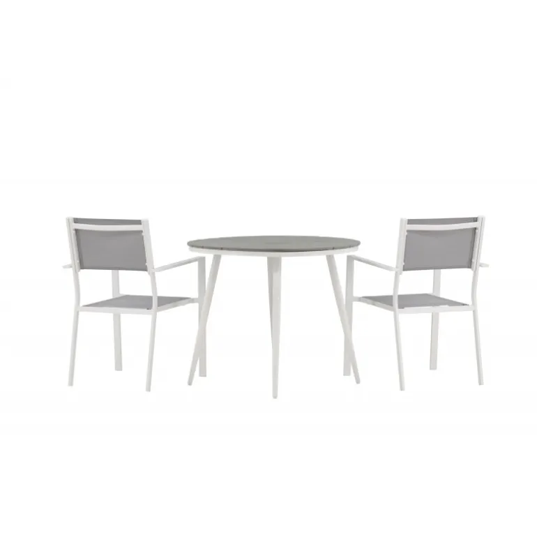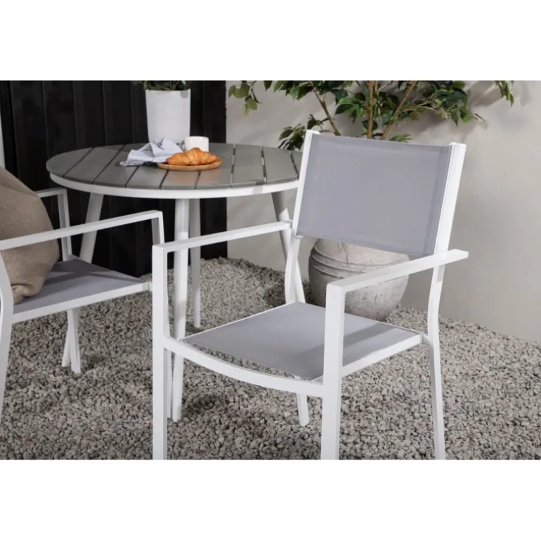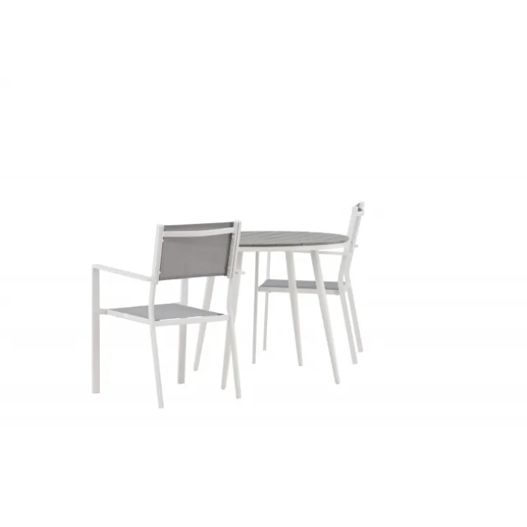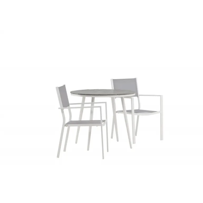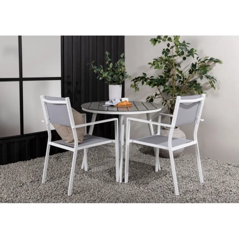 Inviter til hyggelige stunder med vores Break Rundt Loungesæt – Havemøbelsæt! Perfekt til to personer, dette sæt garanterer forlængede, behagelige øjeblikke denne sommer. Break-bordet har en rund bordplade i grå Aintwood og en klassisk hvid aluminiumsramme. Bordets diameter er 90 cm. Sammen med moderne spisebordsstole fra Copacabana-serien, der er både stilfulde og praktiske. Stolene er stabelbare med sæde i tekstil og ramme i aluminium. Skab en charmerende plads til alle sommerens anledninger!