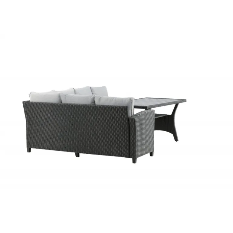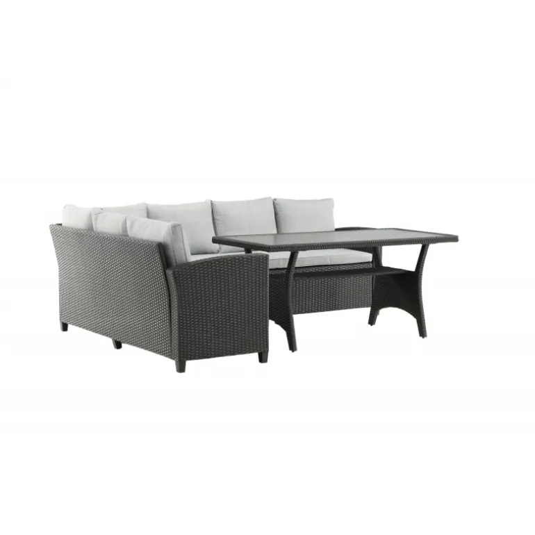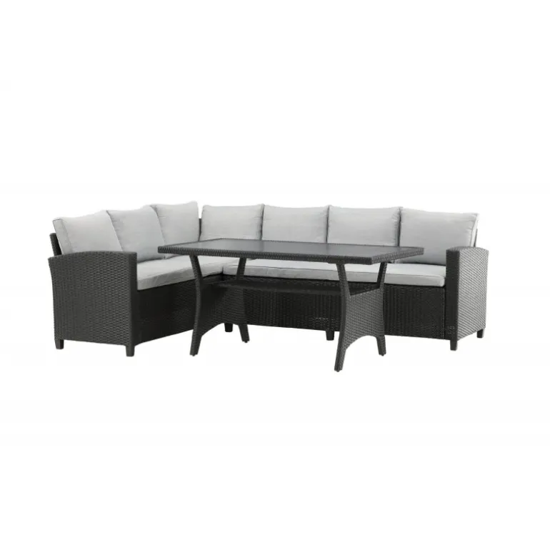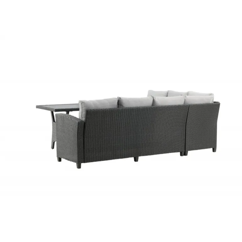 Nyd sommeren på terrassen eller altanen med vores Brentwood hjørnesofa sæt fra Bentwood-serien! Det velovervejede design skaber en hyggelig og indbydende atmosfære, der gør det til en fornøjelse at slappe af og nyde dejligt selskab. Sofaen er lavet af grå/sort kunstig rattan, mens bordet er i sort kunstig rattan med en bordplade i Aintwood. Let montering kræves. Gør dig klar til en fantastisk aften! Plejeråd: Kunstig rattan er et plastmateriale, der er perfekt til det skandinaviske klima. Materialet er UV-bestandigt og kan tåle både vejr og vind. Vi anbefaler dog altid at opbevare møblerne under en møbelbeskyttelse eller et tørt sted for at forlænge deres levetid.