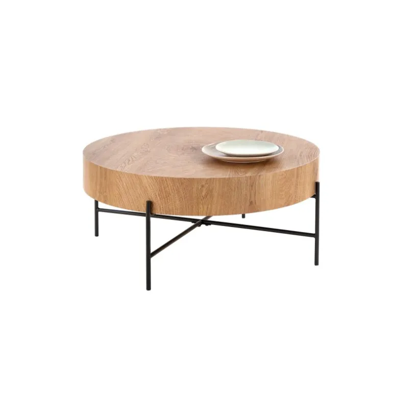 Oplev den tidløse elegance med BROKLYN sofabord natur eg / Sort. Dette sofabord kombinerer et moderne design med holdbare materialer, perfekt til enhver stue. Med en diameter på 80 cm og en højde på 37 cm, passer det ideelt i både store og små rum. Bordets overflade er lavet af lamineret MDF i en smuk natur eg finish, mens stellet er fremstillet af pulverlakeret stål i Sort, hvilket giver en robust og stilfuld struktur.