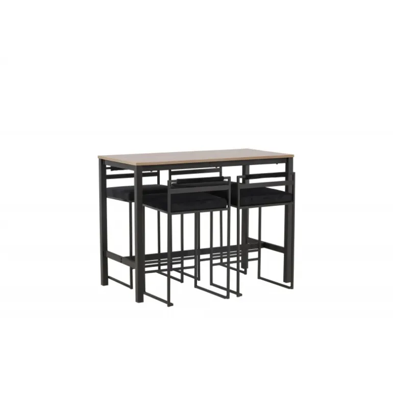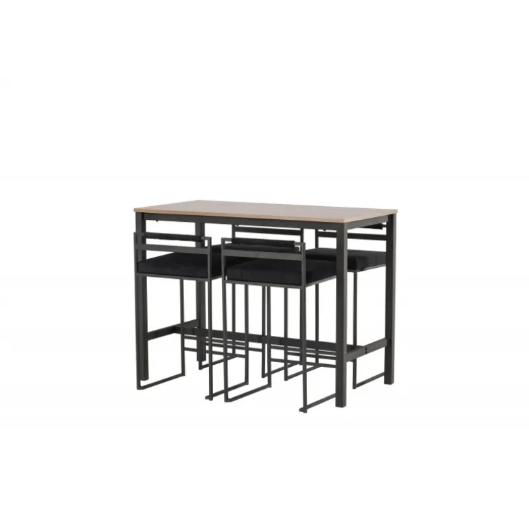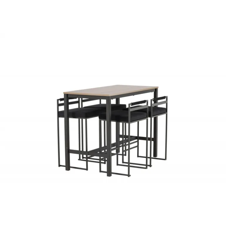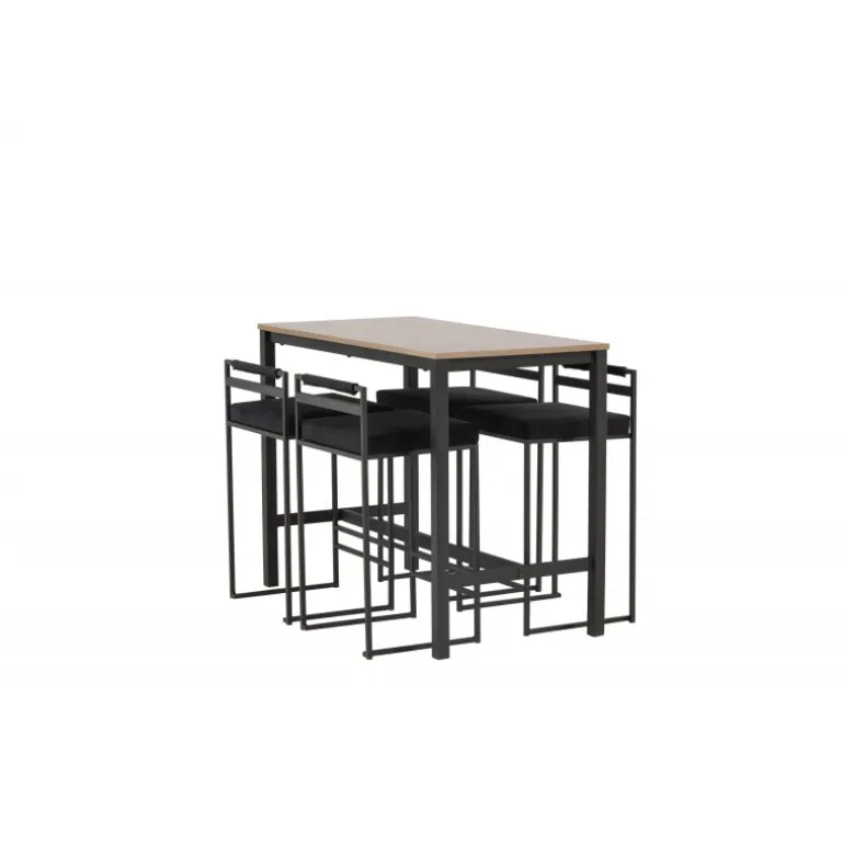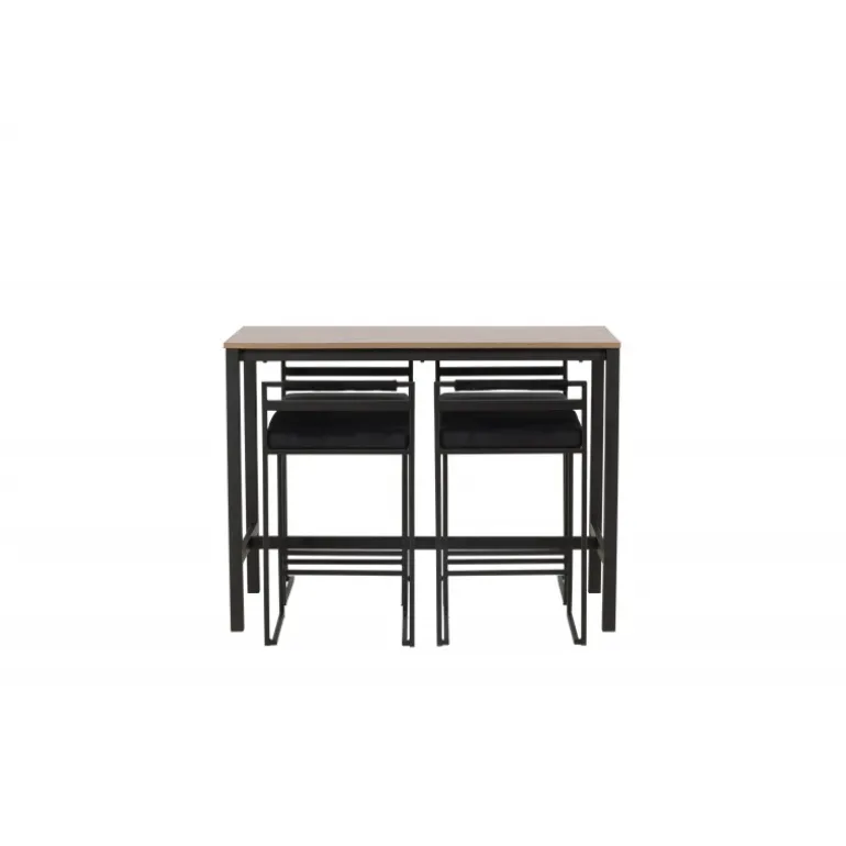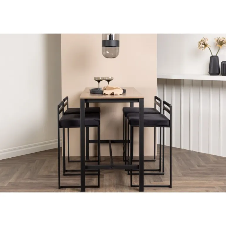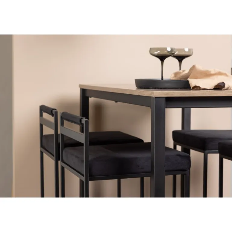 Den perfekte kombination af minimalistisk og industrielt design! Camden barbordet har lige nordiske former med en rektangulær, valnøddefarvet bordplade i MDF og lige bordben i sort stål med en ramme til fodstøtte. Her i matchende kombination med sorte barstole fra Opelika-serien. Sædet er blødt polstret og har en elegant polstring i sort velourstof, og benstrukturen er stilfuldt minimalistisk i sort stål med en lav ryglæn og integreret fodstøtte for ekstra komfort. Tag interiøret til nye højder! Bordets dimensioner: 120×60 cm.
