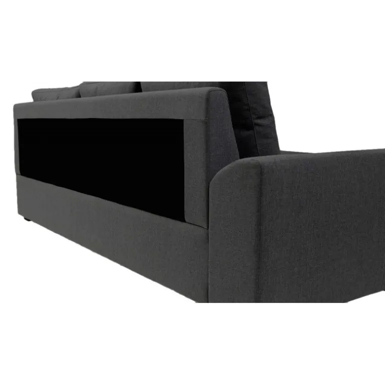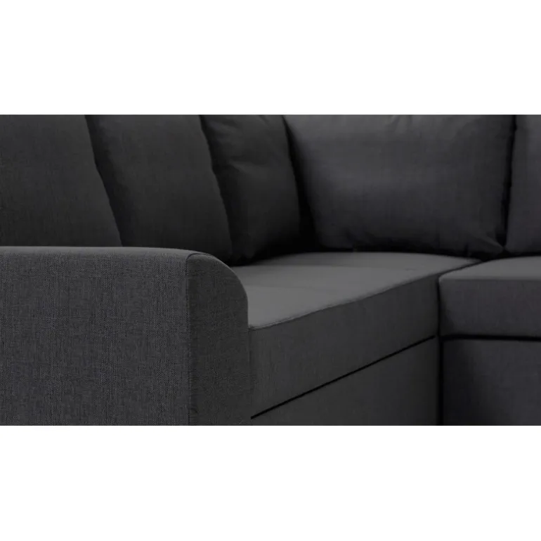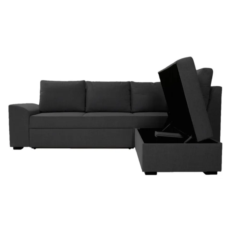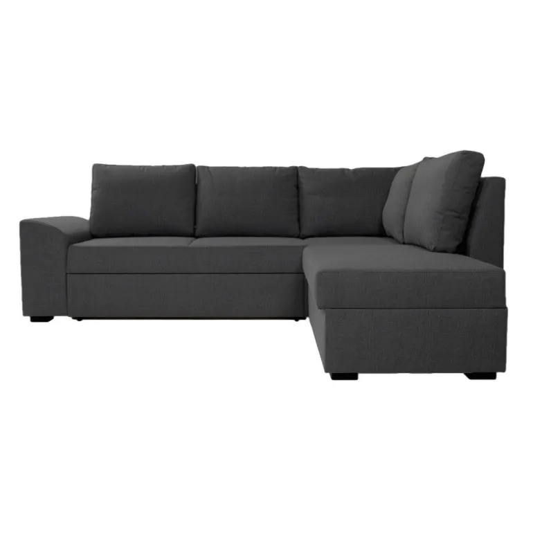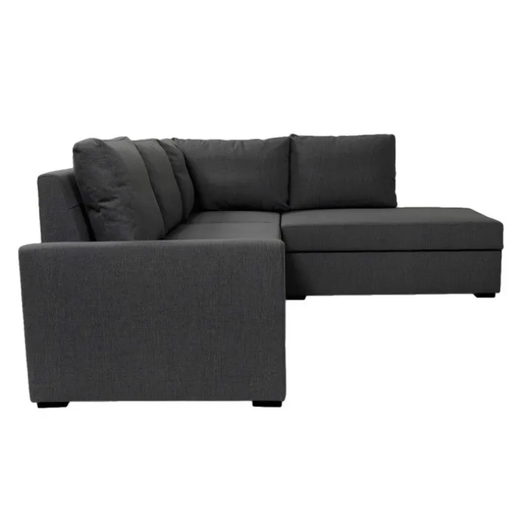 Canapé Deluxe højrevendt hjørnesovesofa med open-end og og posefjedring for optimal komfort. Denne sovesofa er yderst velegnet til dagligt brug da sofaens madrasopbygning er på højde med en god boxmadras, hvilket giver en optimal liggekomfort. Sofaen har et smart opbevaringsrum i chaiselongdelen til sengetøj og et sove udtræk på metalstel. En pladsbesparende lille hjørnesovesofa med open-end til dig som ønsker funktionalitet uden at gå på kompromis med designe og kvalitet. Canapé sofaen har løse ryghynder og en fast siddekomfort. Sofaen er betrukket et slidstærkt strukturvævet antracit møbeltekstil.