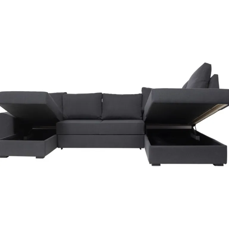 Canapé Deluxe venstrevendt U-sofa med sovefunktion og kæmpe magasiner i begge sider og posefjedring for optimal komfort. Denne sovesofa er yderst velegnet til dagligt brug da sofaens madrasopbygning er på højde med en god boxmadras, hvilket giver en optimal liggekomfort. Canapé sofaen er en kæmpe familie sofa med massere af plads til overnattende gæster. Canapé sofaen har løse ryghynder og en fast siddekomfort. Sofaen er betrukket med strukturvævet antracit tekstil.