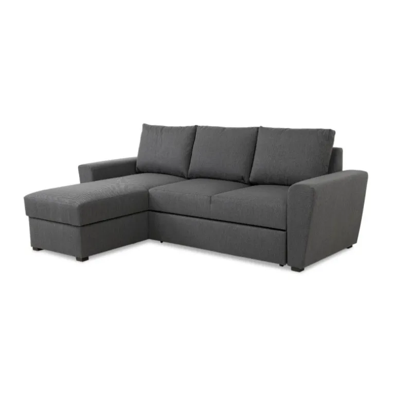 Denne sofa er udført med et rummeligt magasin i chaiselongdelen og udtræksfunktion, så du nemt og hurtigt kan omdanne sofaen til en bekvemmelig soveplads for 2 pers. Udført med skråne armlæn og i enkelt design egner sofaen sig særlig godt til mindre lejligheder hvor pladsen er trang. Studio sovesofaen har løse ryghynder og en medium/hård siddekomfort. Sofaen er betrukket med slidstærkt strukturvævet mørkegråt møbeltekstil.
