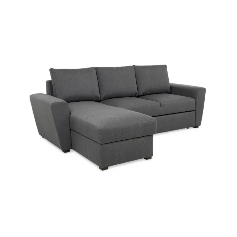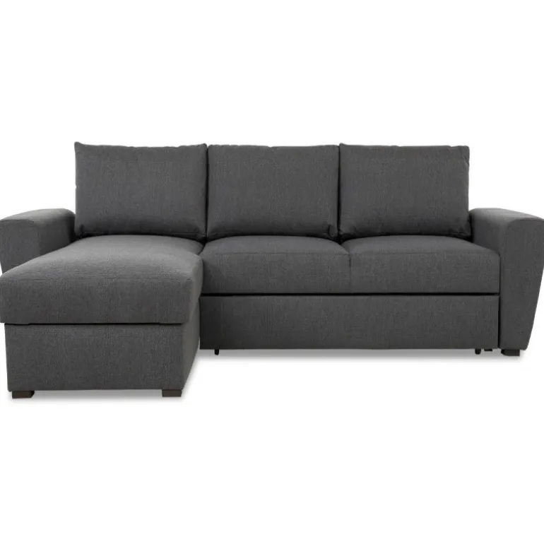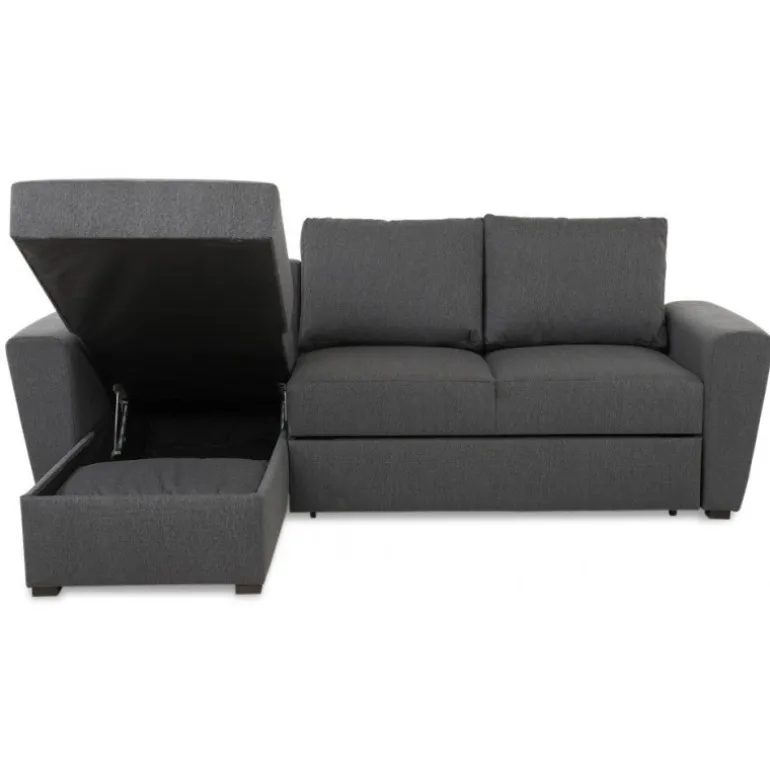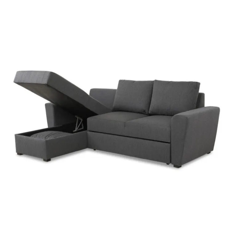Denne sofa er udført med et rummeligt magasin i chaiselongdelen og udtræksfunktion, så du nemt og hurtigt kan omdanne sofaen til en bekvemmelig soveplads for 2 pers. Udført med skråne armlæn og i enkelt design egner sofaen sig særlig godt til mindre lejligheder hvor pladsen er trang. Studio sovesofaen har løse ryghynder og en medium/hård siddekomfort. Sofaen er betrukket med slidstærkt strukturvævet mørkegråt møbeltekstil.