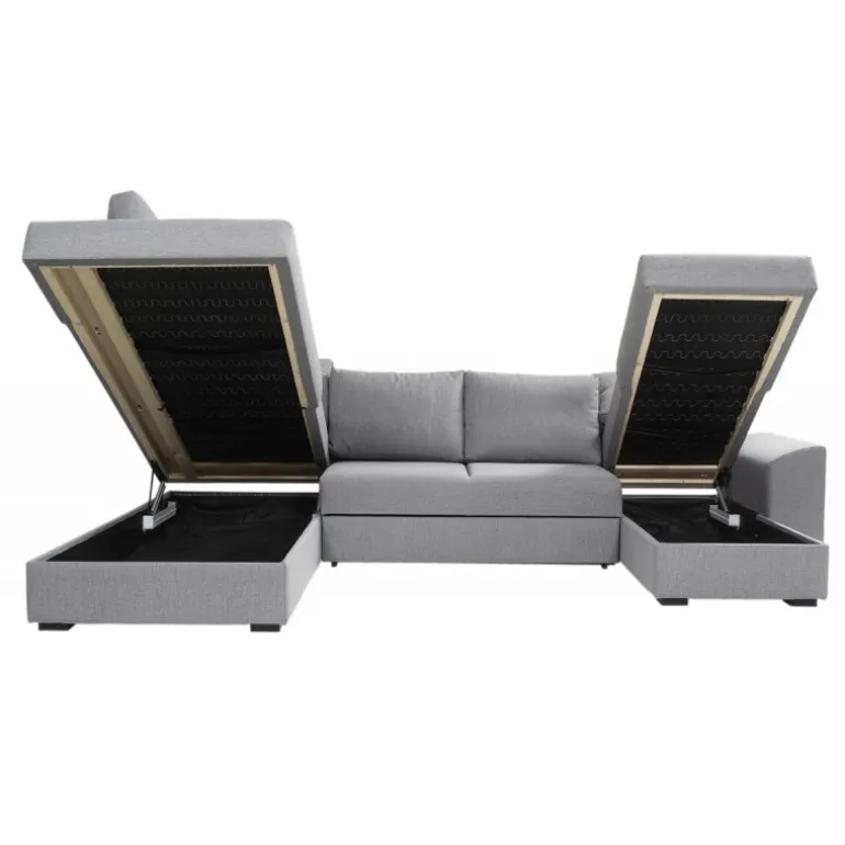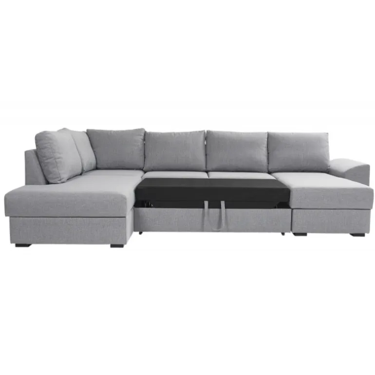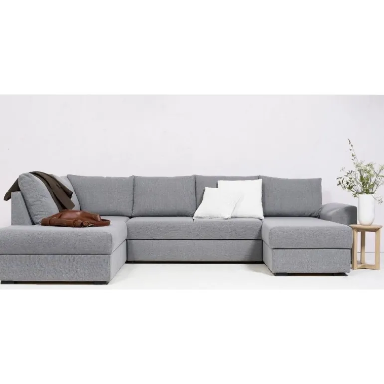 Canapé højrevendt U-sofa med sovefunktion og kæmpe magasiner i begge sider. En stor familie Sovesofa med massere plads til overnattende gæster. Canapé sofaen har løse ryghynder og en fast siddekomfort. Sofaen er betrukket et slidstærkt strukturvævet gråt møbeltekstil.