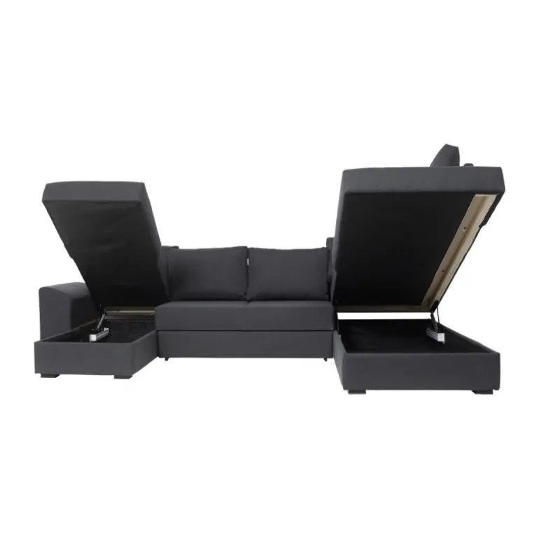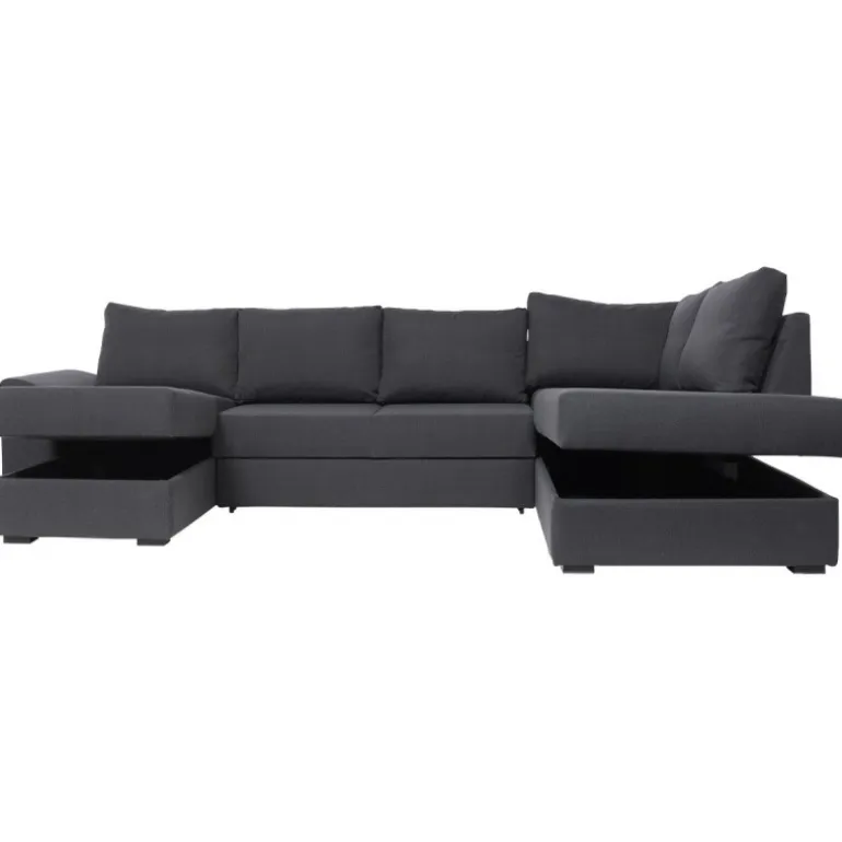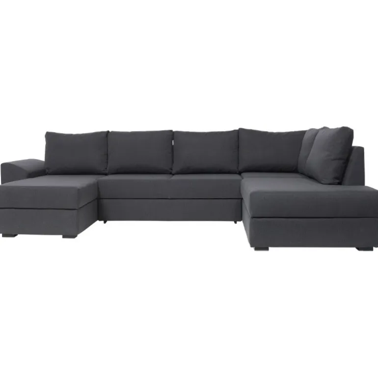 Canapé venstrevendt U-sofa med sovefunktion og kæmpe magasiner i begge sider. En stor familie sofa med massere plads til overnattende gæster. Canapé sofaen har løse ryghynder og en fast siddekomfort. Sofaen er betrukket med strukturvævet antracit tekstil.