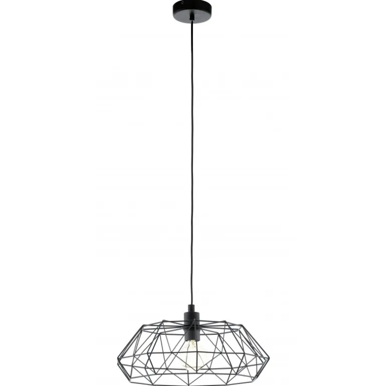 Sort pendellampe i et råt industrielt look. Lampeskærmen er udformet som et bur af geometriske figurer, hvilket giver pendlen et spændende og ekstraordinært æstetisk udtryk.