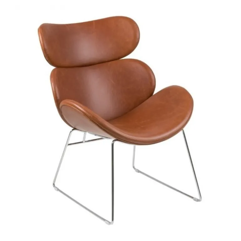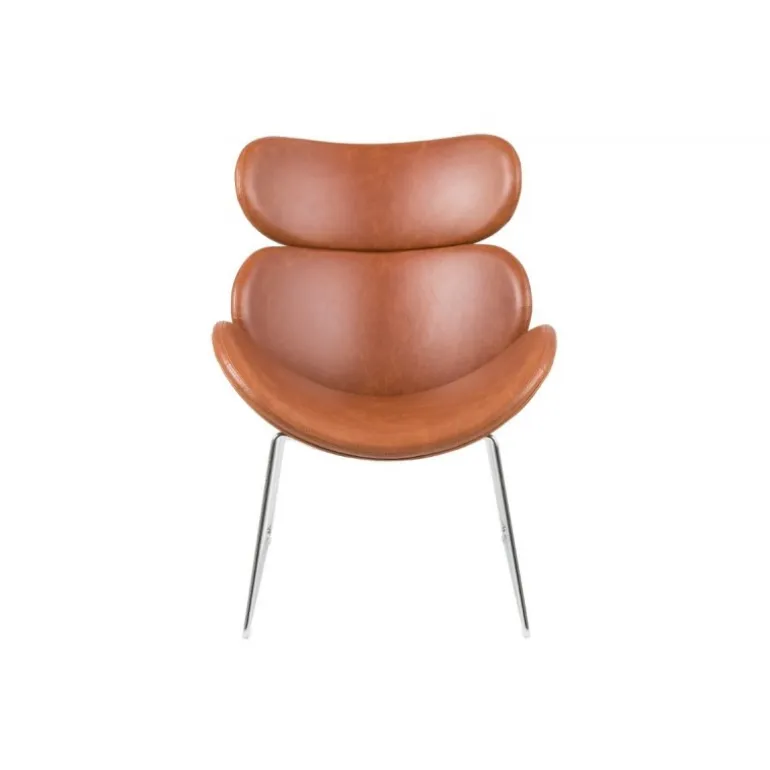 Komfortabel og smart lænestol i morderne design. Sædet er betrukket med brunt tekstillæder og stellet er udført i krom. De afrundede, bløde former kombineret med det lette og luftige stel giver denne stol en særdeles indbydende udstråling.