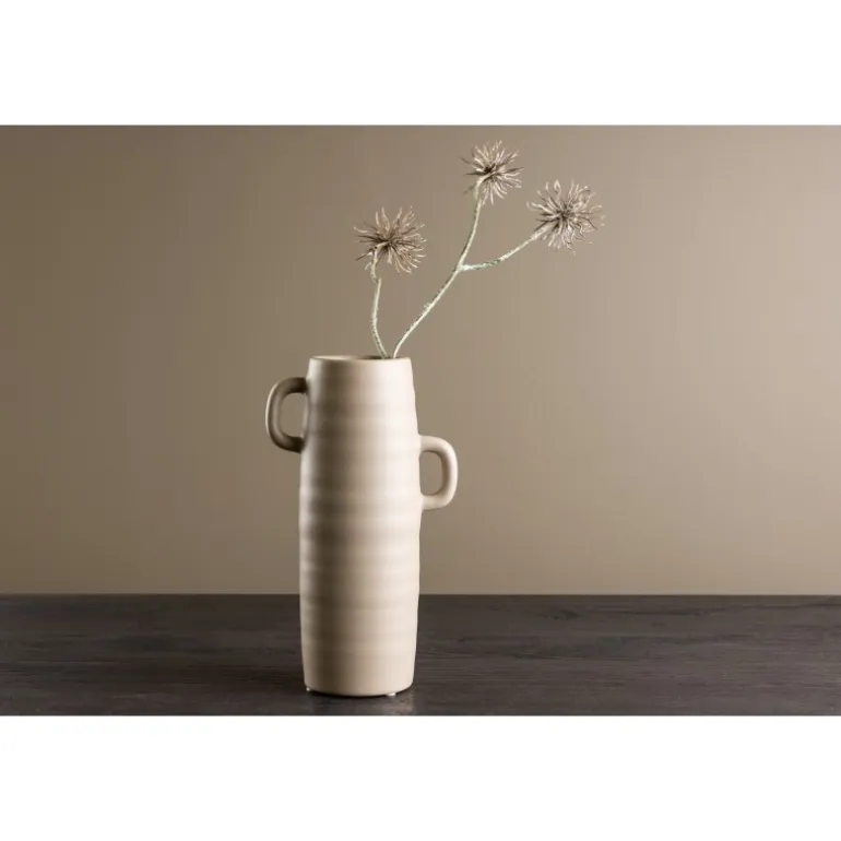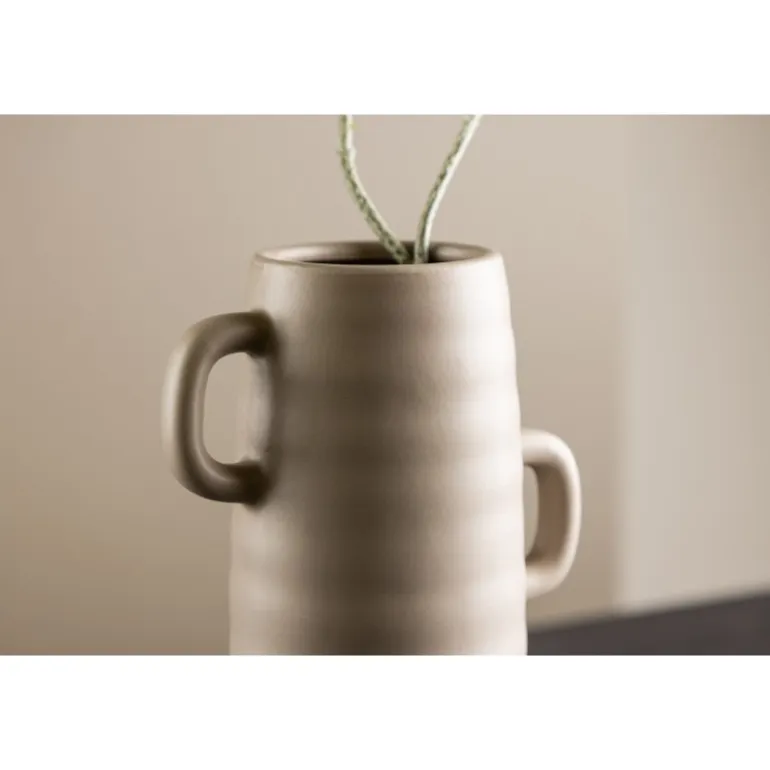 Stolt præsenterer vi – Cent. En sofistikeret og moderne vase, der vil forbedre dit interiør på en unik måde. Med en højde på 22 centimeter er Cent fremstillet af stentøj, hvilket giver den en solid og elegant følelse. Den varme lysebrune farve gør vasen til et alsidigt stykke, der passer perfekt ind i ethvert hjem og stil. Dens unikke design inkluderer to håndtag på siderne, placeret i forskellige højder for at skabe kunstnerisk asymmetri. Disse håndtag gør det nemt at flytte vasen, samtidig med at de tilføjer en interessant visuel dimension. Vasen har en let bølget struktur, som giver den et distinkt og moderne udtryk. Denne detalje skaber et visuelt fokuspunkt og giver vasen en unik karakter, der vil tiltrække opmærksomhed. Uanset om du vælger at placere friske blomster, tørrede arrangementer eller blot lade Cent stå alene, vil denne vase være en imponerende tilføjelse til dit hjem. Giv dit rum et strejf af elegance og modernitet med Cent – den perfekte måde at vise din personlige stil på.