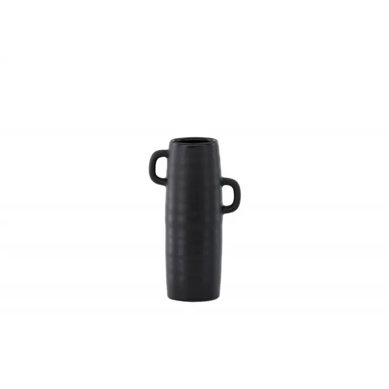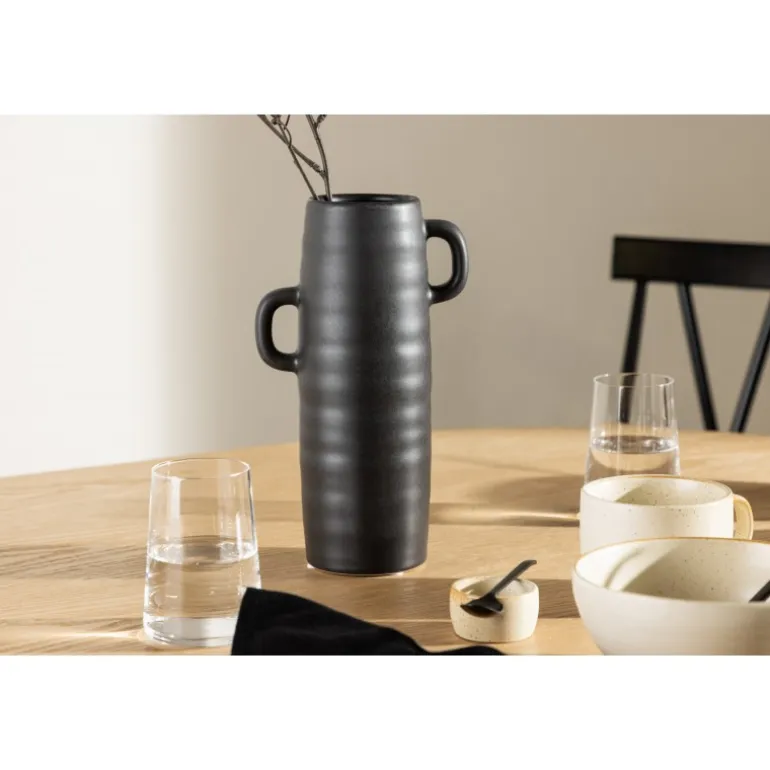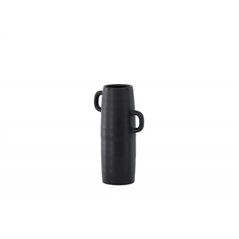Stolt introducerer vi – Cent. En sofistikeret og moderne vase, der vil løfte din indretning på en unik måde. Med en højde på 22 centimeter er Cent fremstillet af stentøj, hvilket giver den en solid og elegant følelse. Den dybe sorte farve gør vasen til et alsidigt stykke, der passer perfekt ind i ethvert hjem og stil. Dens unikke design inkluderer to håndtag på siderne, placeret i forskellige højder for at skabe kunstnerisk asymmetri. Disse håndtag gør det nemt at flytte vasen, samtidig med at de giver en interessant visuel dimension. Vasen har en let bølget struktur, der giver den et distinkt og moderne udseende. Denne detalje skaber et visuelt fokuspunkt og giver vasen en unik karakter, der vil tiltrække opmærksomhed. Uanset om du vælger at placere friske blomster, tørrede arrangementer eller blot lade Cent stå alene, vil denne vase være en imponerende tilføjelse til dit hjem. Giv dit rum et strejf af elegance og modernitet med Cent – den perfekte måde at fremvise din personlige stil på.