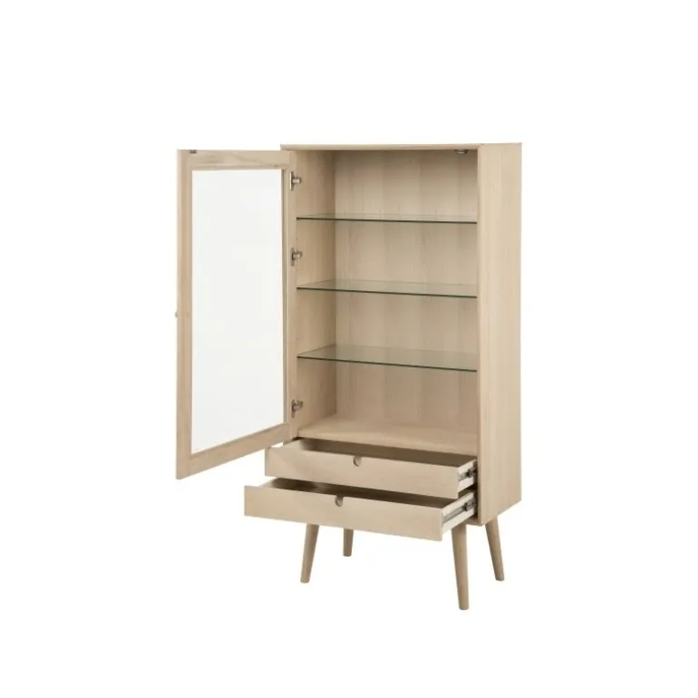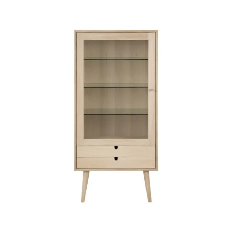Stilrent vitrineskab med 1 glaslåge og 2 skuffer. Vitrinen rammen er udført i massivt egetræ, der er behandlet med hvidpigmenteret olie, hvilket giver træet en lys og lækker finish. Skufferne har fine minimalistiske udskæringer, som understøtter det enkle og tidløse udtryk og lavet af MDF.