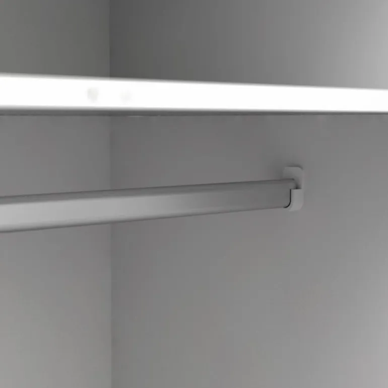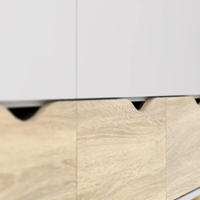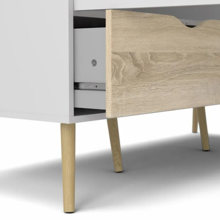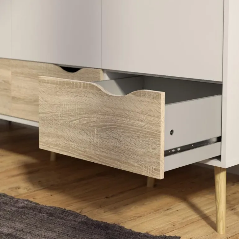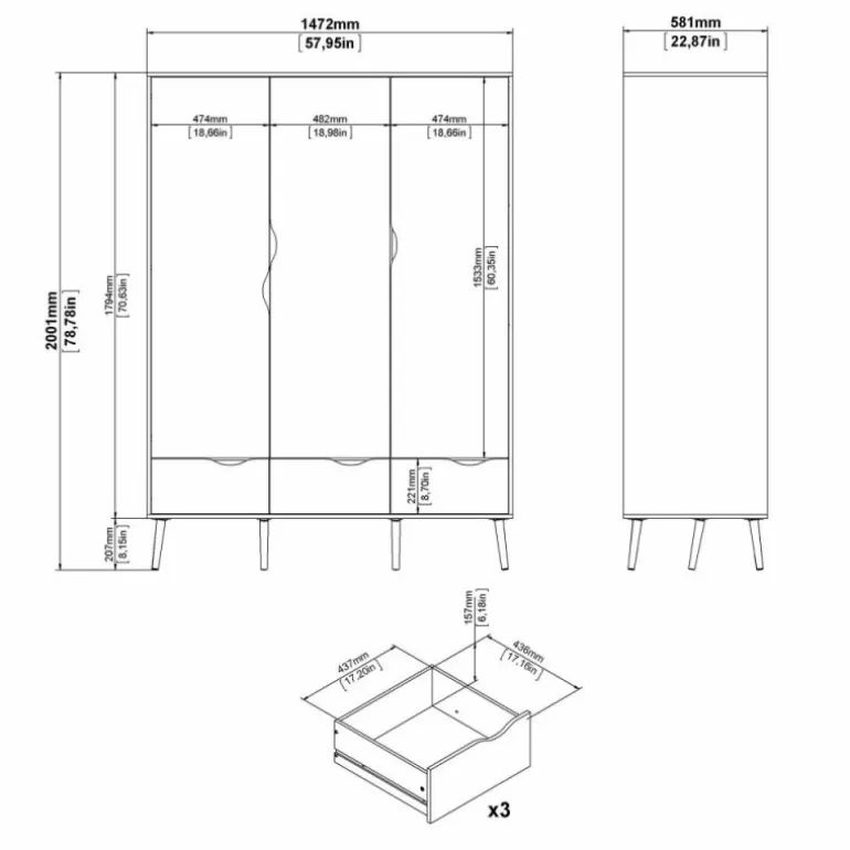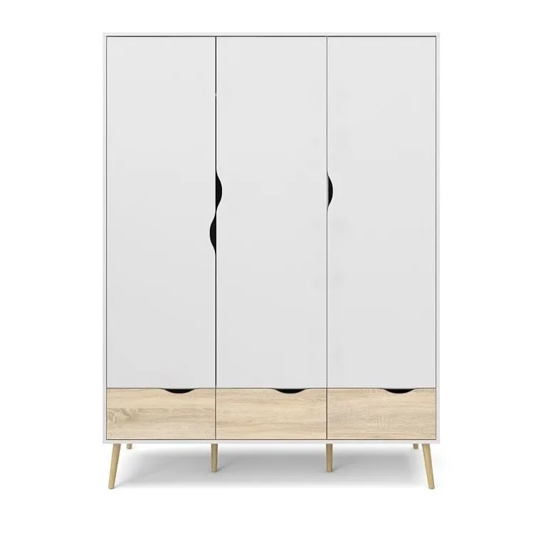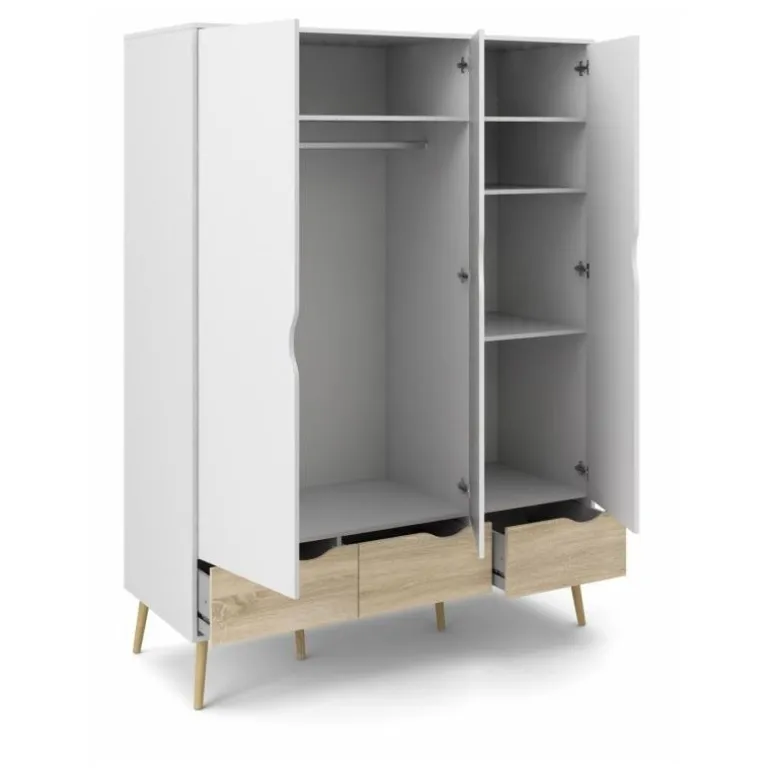 Smart hvidt 3-lågers klædeskab i lækker nordisk retrostil. En funktionel og flot løsning med 3 grebsfri låger, 3 eg struktur skuffer samt 1 bøjlestang og 1 fast hylde indvændig. Skabet er monteret på skrå ben i massivt egetræ.