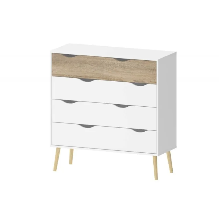 Kommode i hvid/eg struktur fra Charlie-serien med i alt 5 skuffer, heraf 3 store og 2 små. Denne stilrene og rummelige kommode i indbydende lyse materialer udstråler elegance og eksklusivitet. Et rigtig flot solidt opbevaringsmøbel i moderne nordisk design.