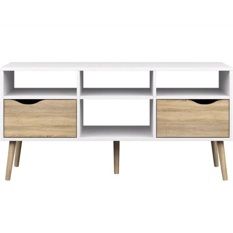 Rummeligt hvidt tv-bord med 2 skuffer i eg struktur og skrå ben i lyst træ. Dette flotte tv-bord er inddelt i 6 rum, så der er god plads til opbevaring af tv-enheder, fladskærm m.m. Kombinationen af hvid og eg struktur giver tv-bordet et elegant nordisk look, der pynter i enhver bolig.