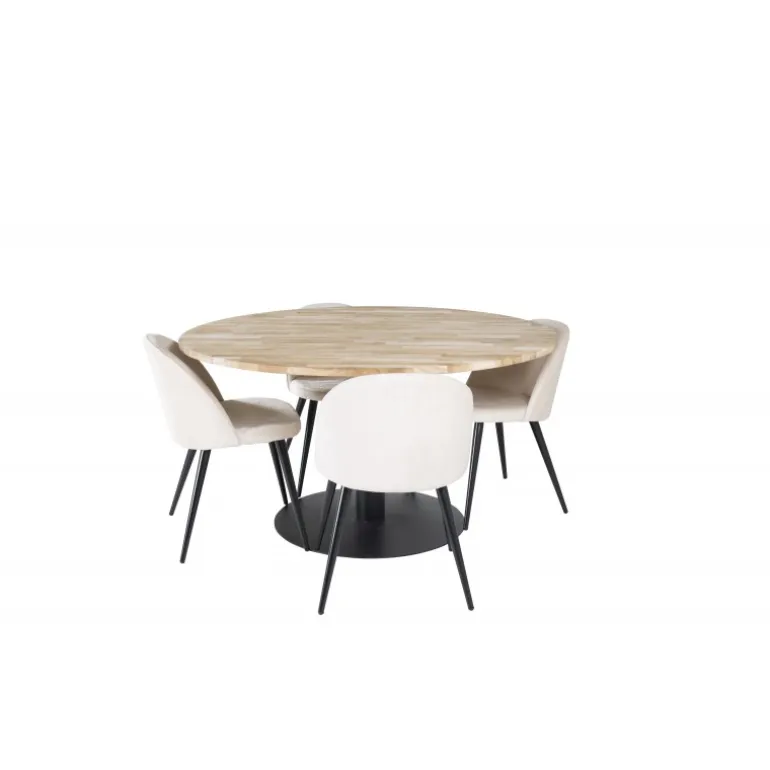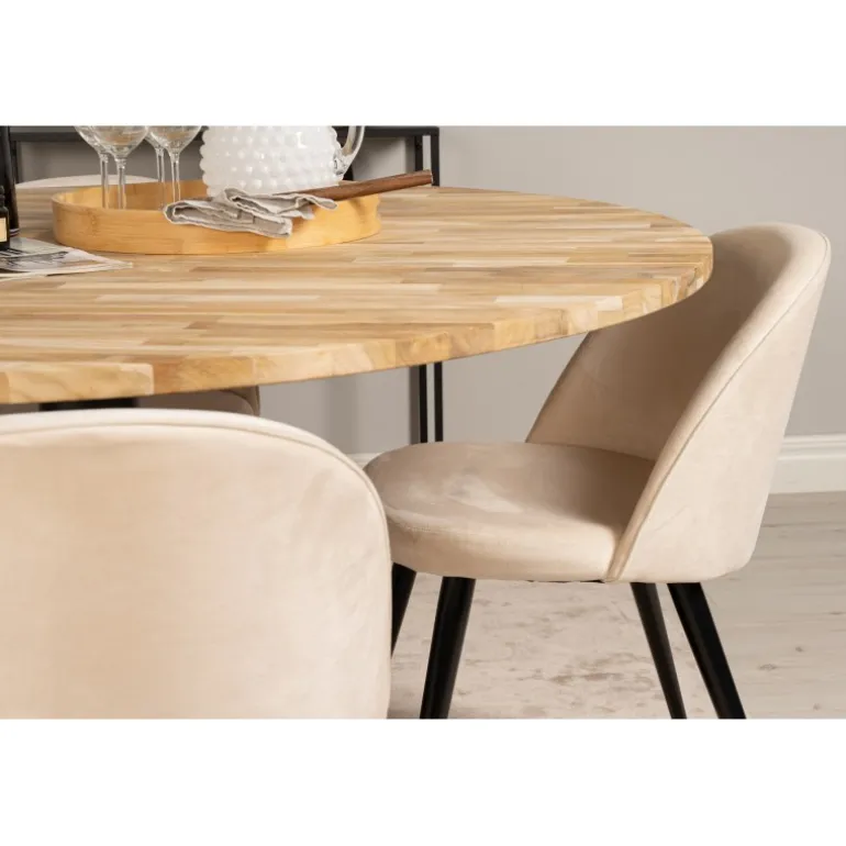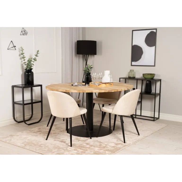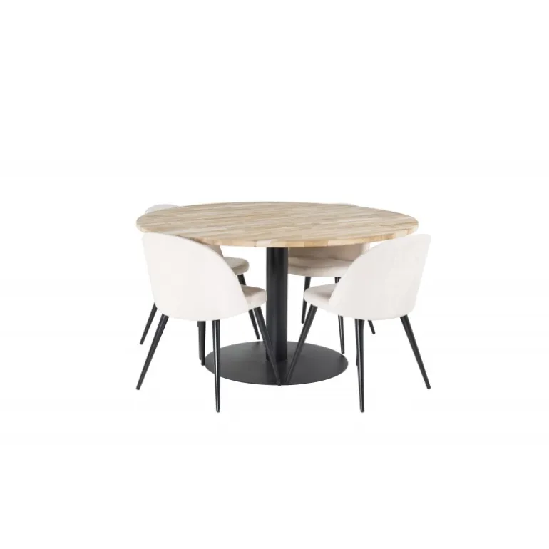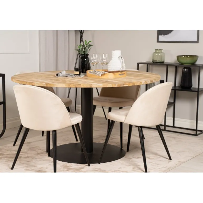 Vores Cirebon Rund Spisebordssæt kombinerer en teakbordplade med vores bløde og komfortable stole i Velvet-serien. Denne kombination giver en hyggelig og luksuriøs fornemmelse i hjemmet. Spisebordet har en naturlig farve, og stolene fås i både beige og sort. Materialerne, der anvendes, omfatter bøjet træ, skum, stål og teak, hvilket sikrer både holdbarhed og komfort. Perfekt til dem, der ønsker at tilføje en elegant touch til deres spisestue.