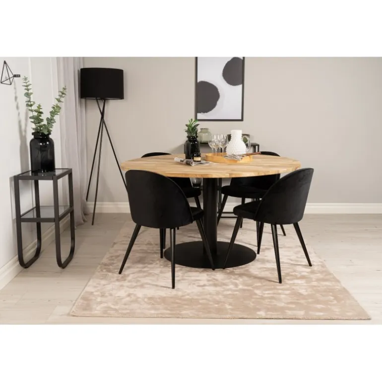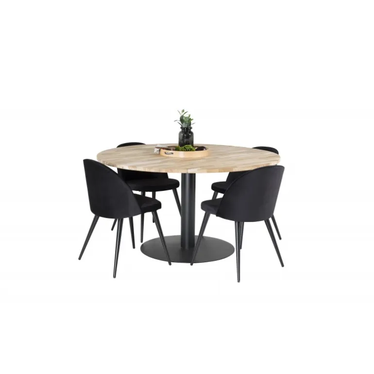 Cirebon, et moderne og pænt Spisebordssæt, der inkluderer en spisebord og stole fra Velvet-serien. Skab en elegant og social atmosfære med plads til god mad og hygge. Dette sæt kombinerer stil og funktionalitet, hvilket gør det ideelt til enhver spisestue. Bordpladen er lavet af teaktræ, der tilføjer et naturligt og varmt udseende, mens stolene er designet med bøgetræ, skum og stål for maksimal komfort og holdbarhed.