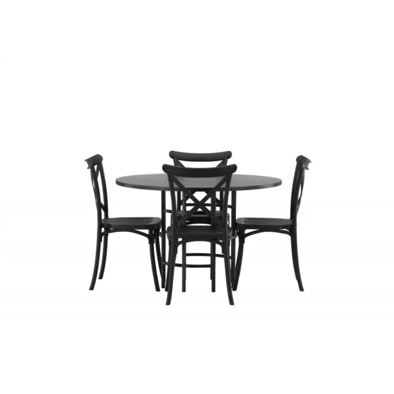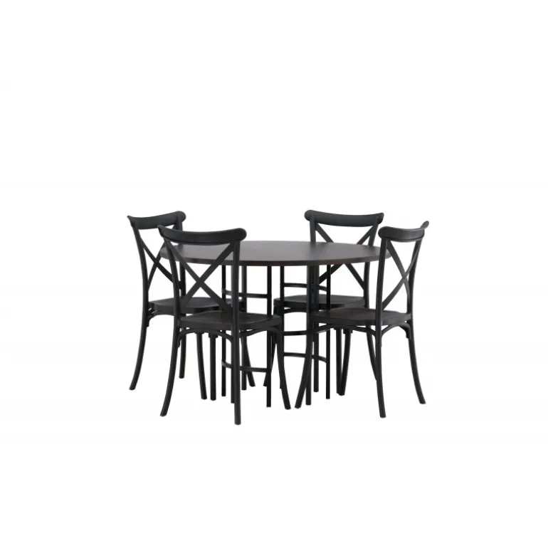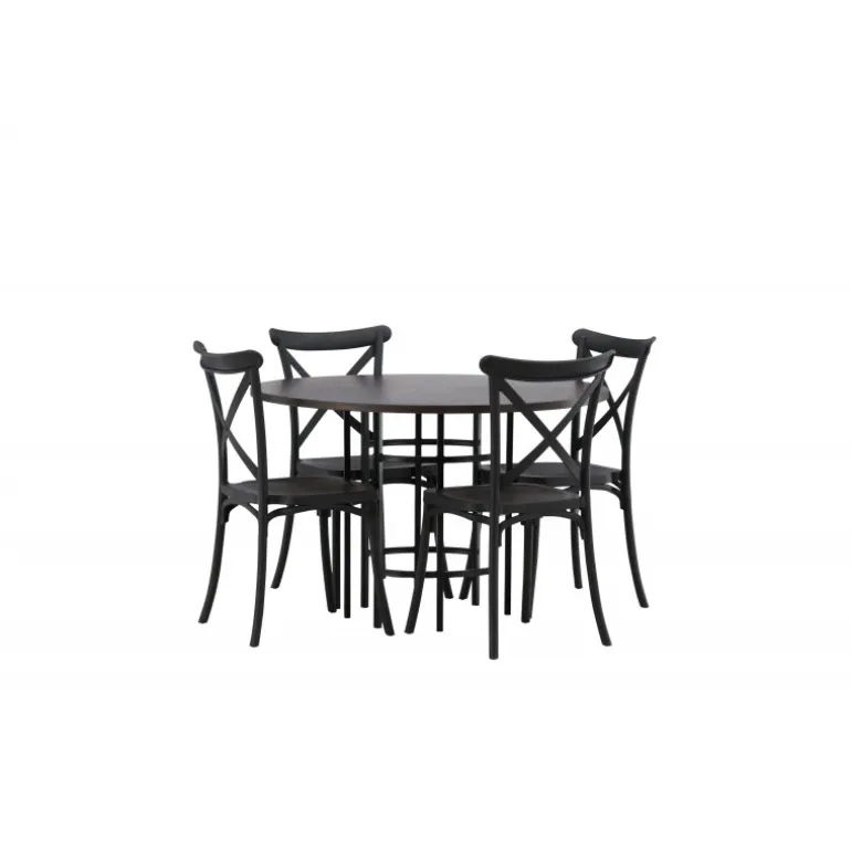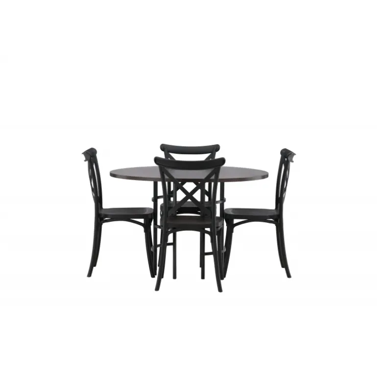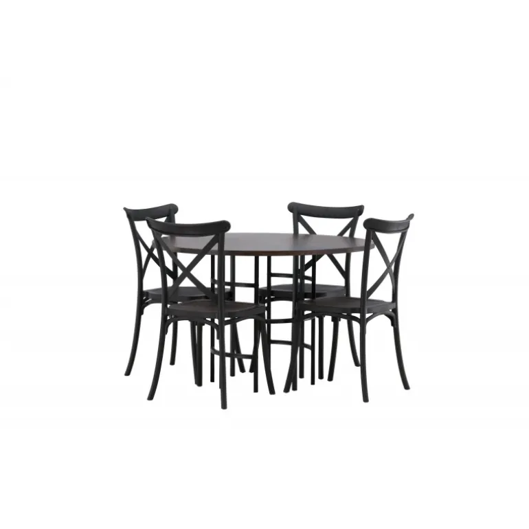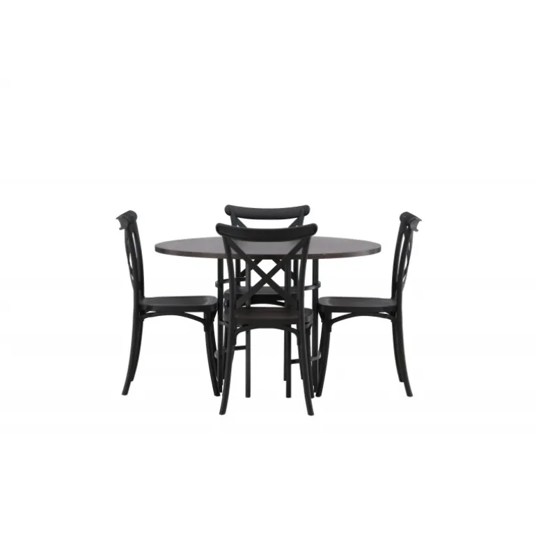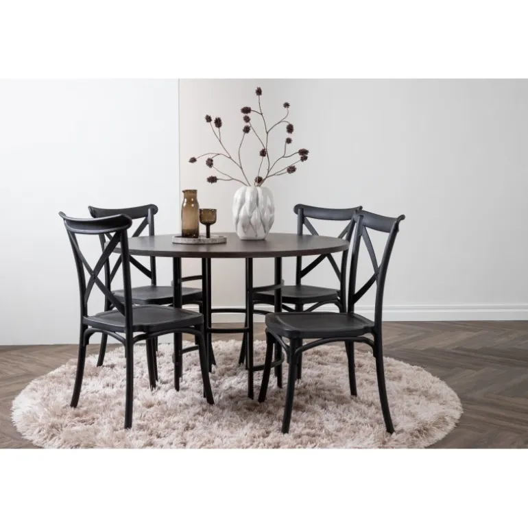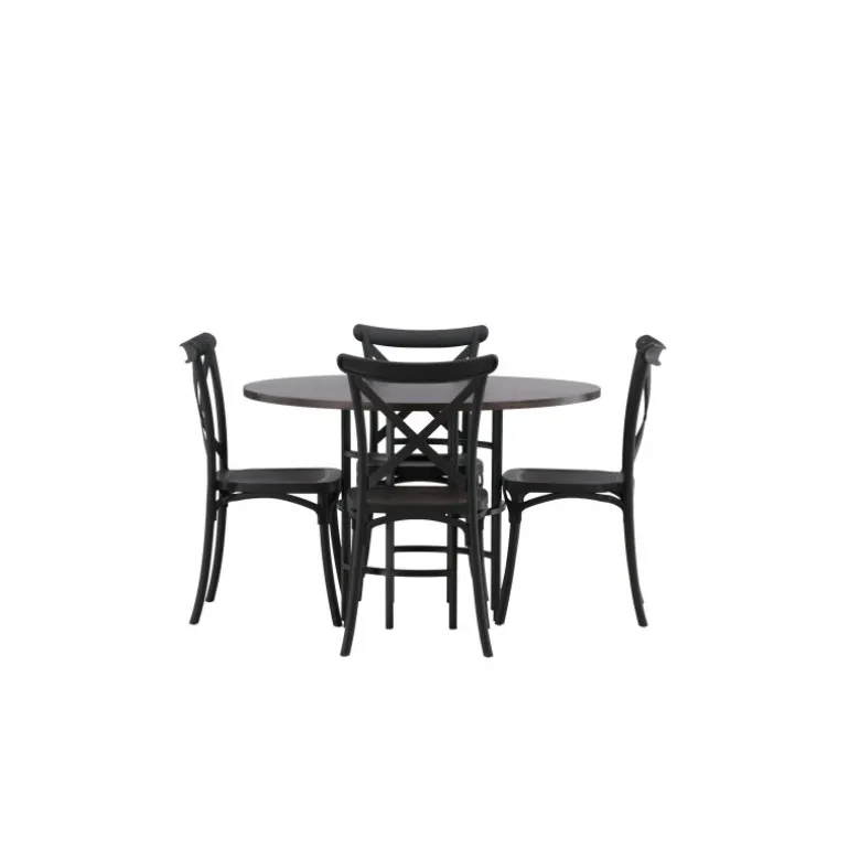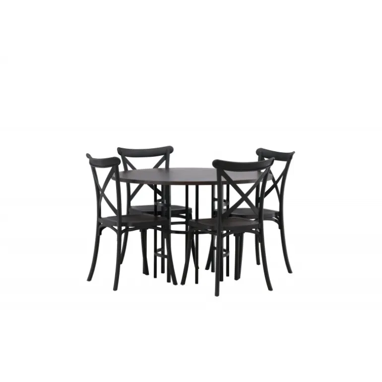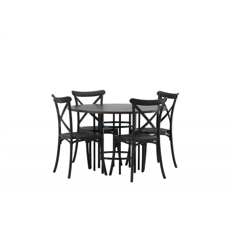 En spisestuegruppe, der kombinerer klassisk design og moderne former! Det runde spisebord fra Copenhagen-serien tilhører Furniture Fashion-kollektionen og har en smuk brunfarvet bordplade i MDF med finer og en dekorativ, cylinderformet base i sort metal. Sammen med spisebordsstole fra Crosett-serien får du her en stilfuld Spisebordssæt til at dekorere dit hjem med. Stolene har et nostalgisk design med krydsryg og lige linjer, lavet i sort plast.