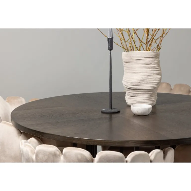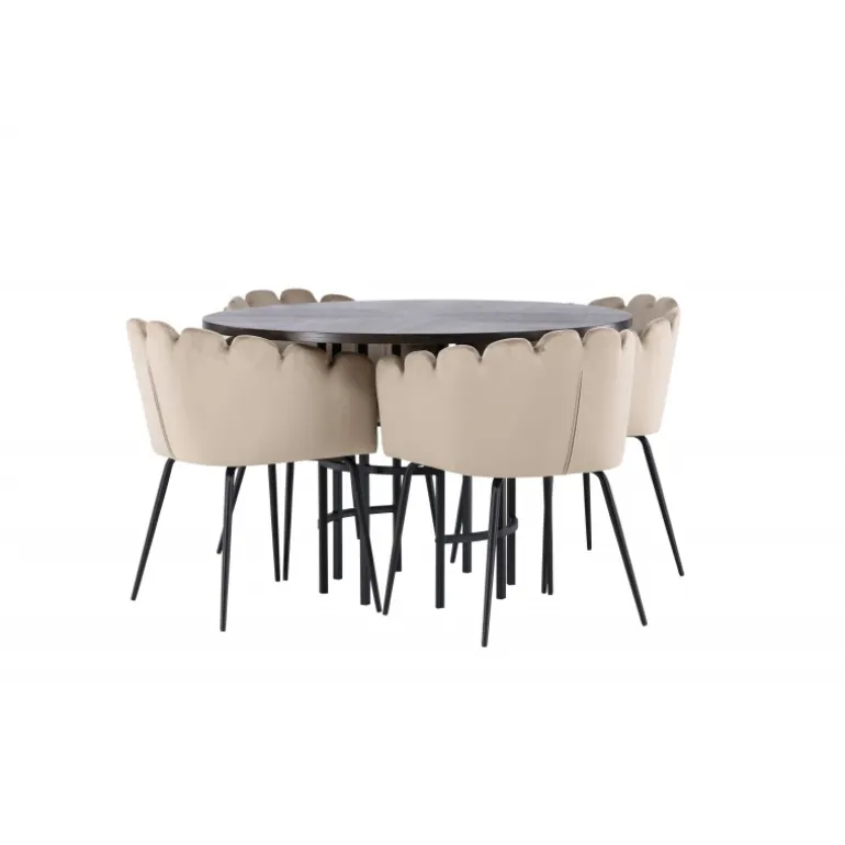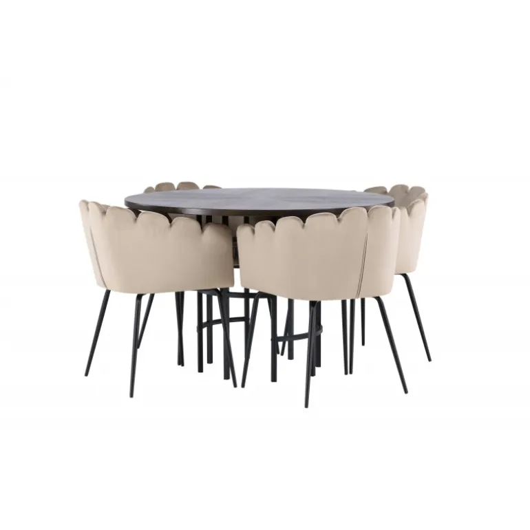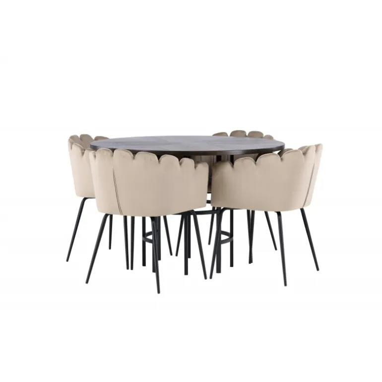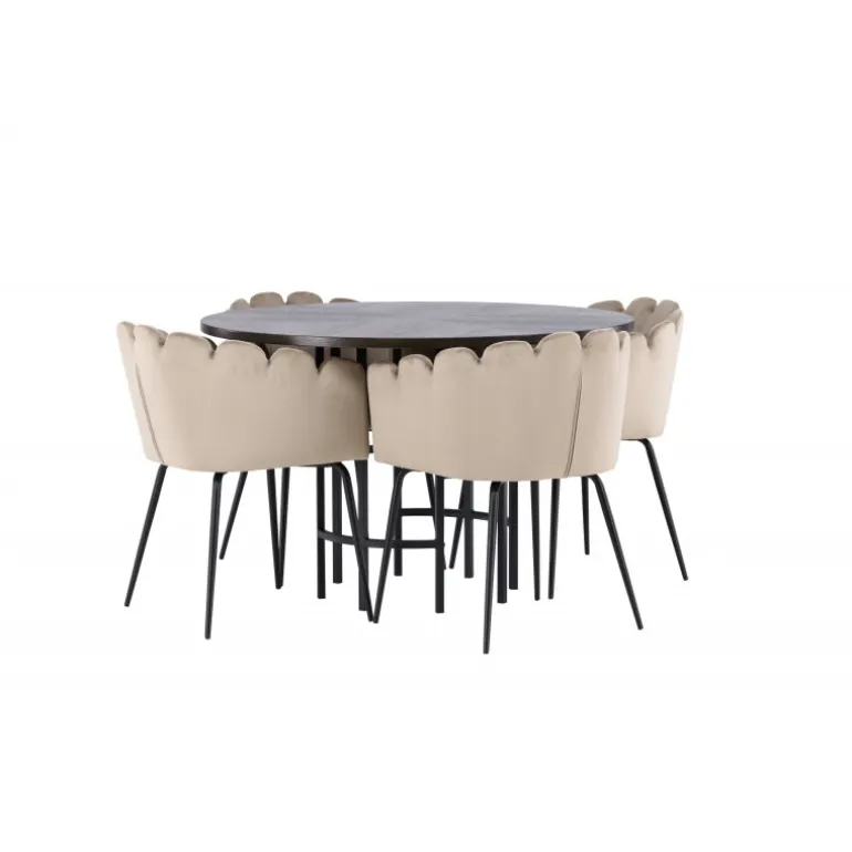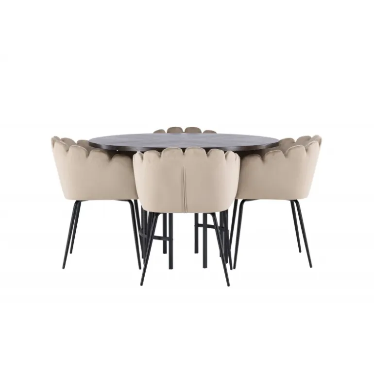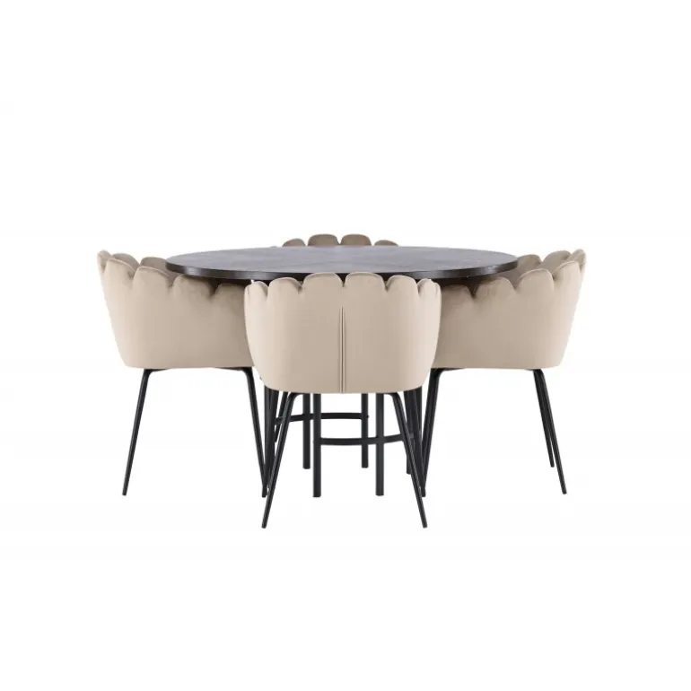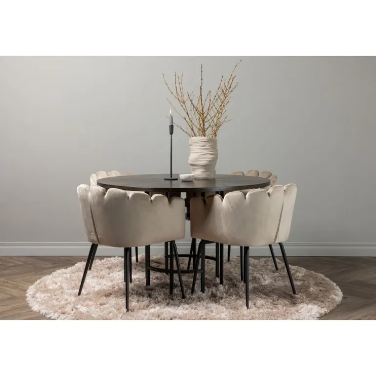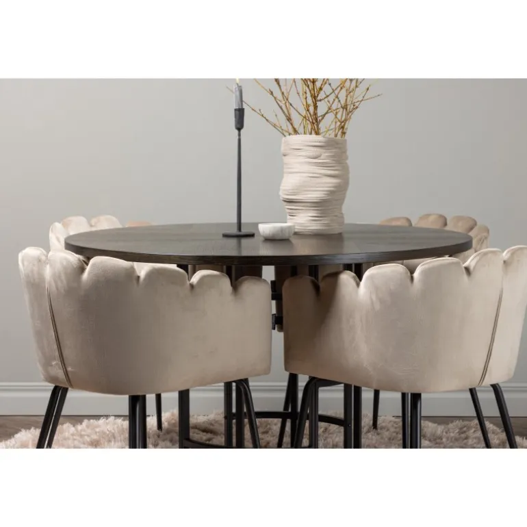 Skab en luksuriøs blikfang! Vores runde spisebord Copenhagen har en smuk brun bordplade i MDF med finer og en dekorativ, cylinderformet base i sort metal. Sammen med vores populære Limhamn spisebordsstole. Stolen har et indbydende design med dekorativ skalformet ryg med dekorative syninger og et rundt sæde i smagfuldt beige velourstof. Benene er i sort pulverlakeret metal. Sid komfortabelt og elegant fremadrettet! Bordets dimensioner: 115 cm.