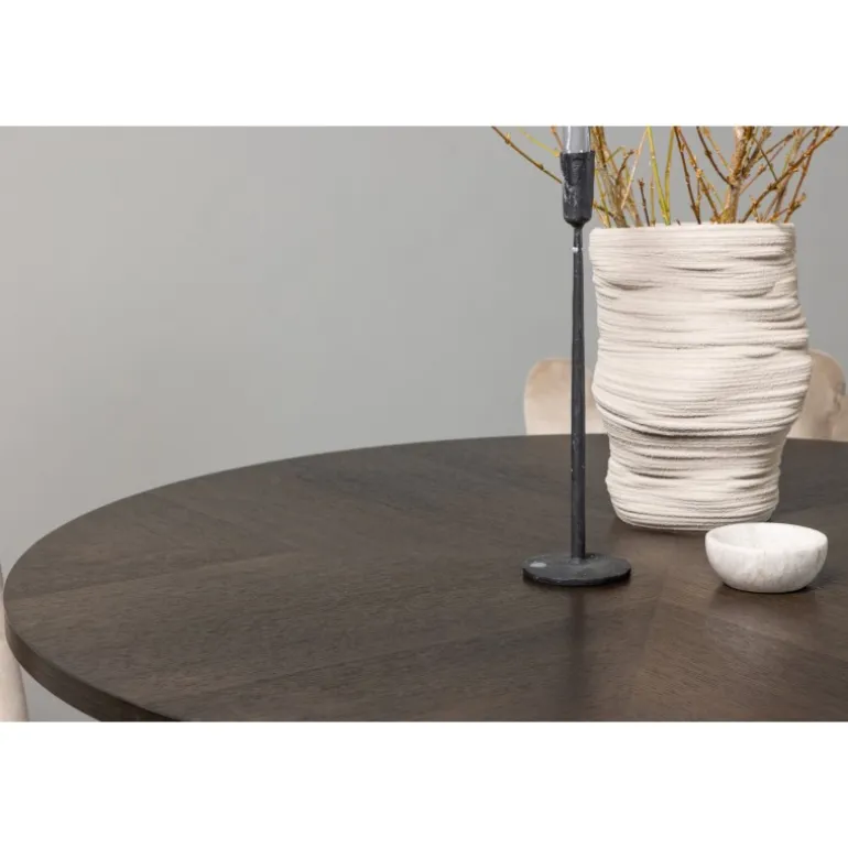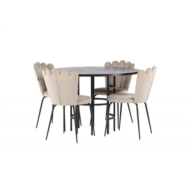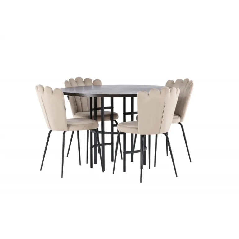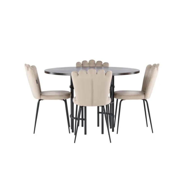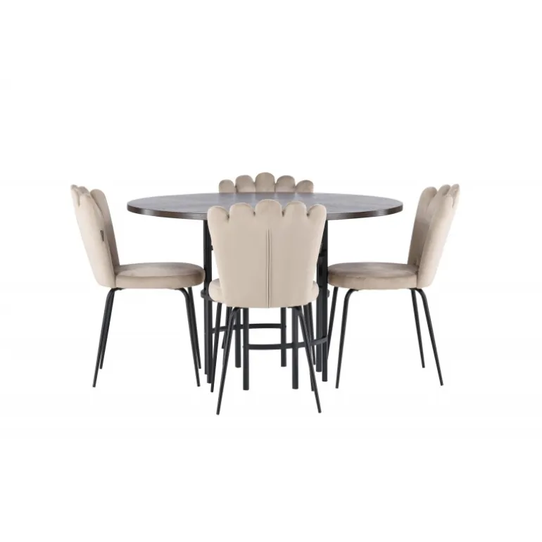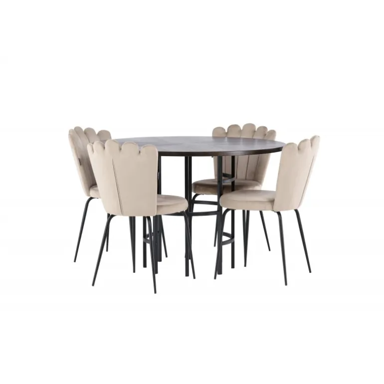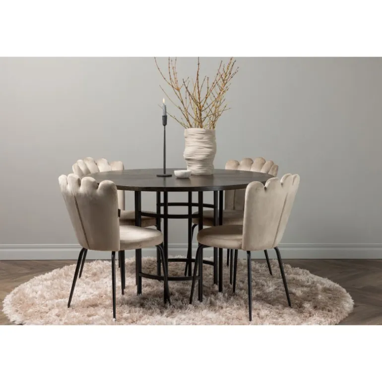 Grand og stilfuld! Vores runde spisebord Copenhagen har en smuk brunfarvet bordplade i MDF med finer og en dekorativ, cylinderformet base i sort metal. Her i en moderne kombination med beige spiseborde fra Limhamn-serien. Stolen har et indbydende design med en dekorativ muslingeformet ryg med dekorative syninger og et rundt sæde i smagfuldt beige fløjlsstof. Benene er i sort pulverlakeret metal. Det skal føles luksuriøst at sætte sig her! Bordmål: 115 cm.
