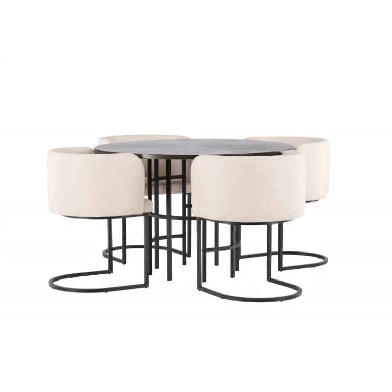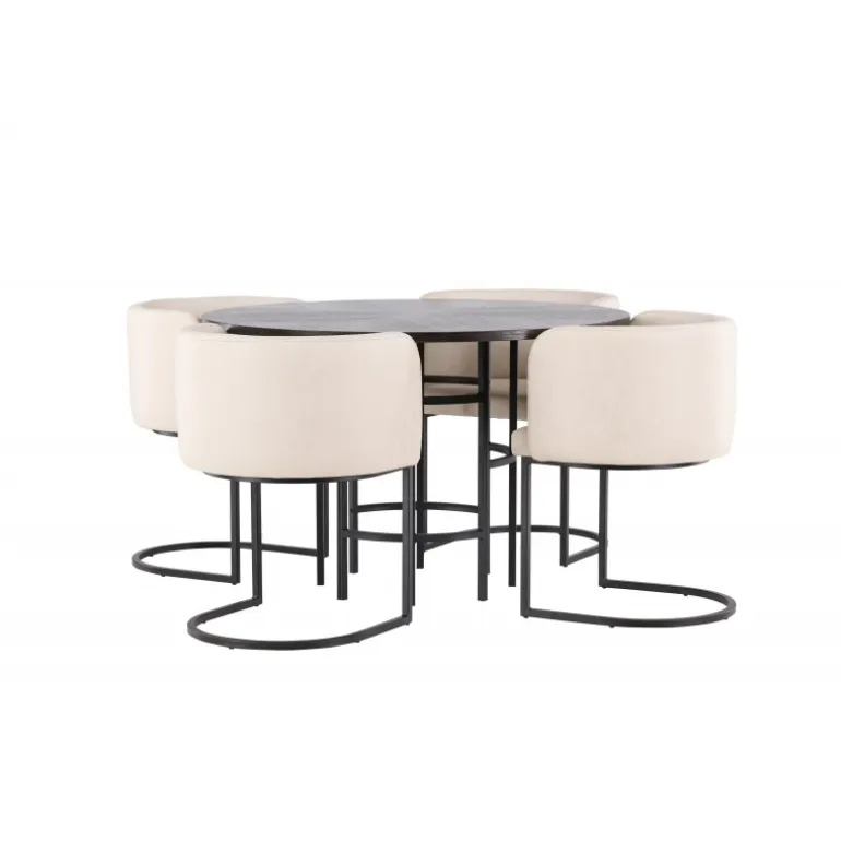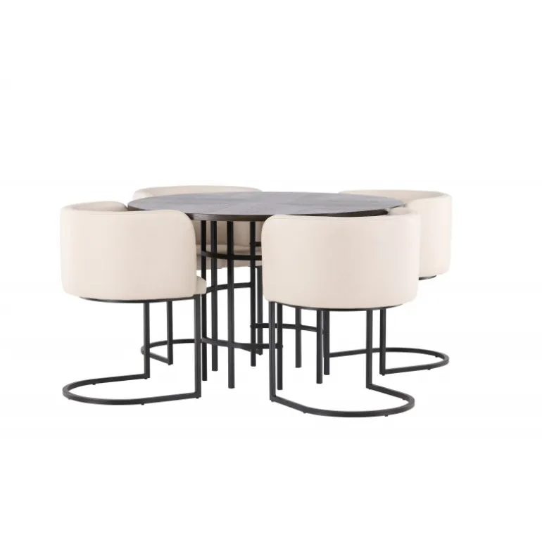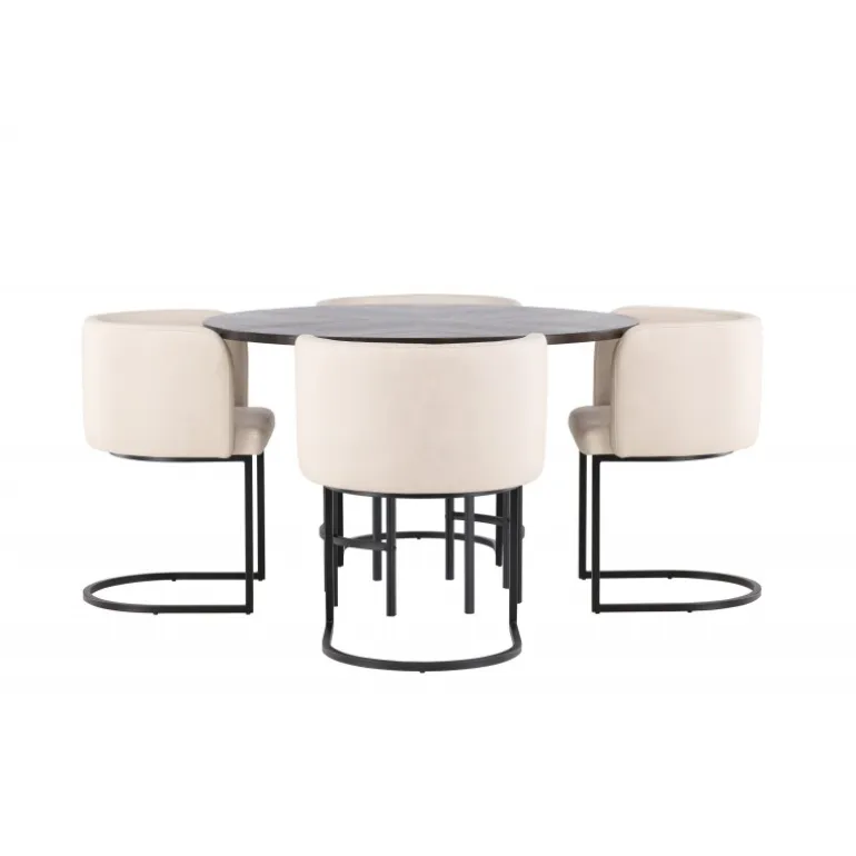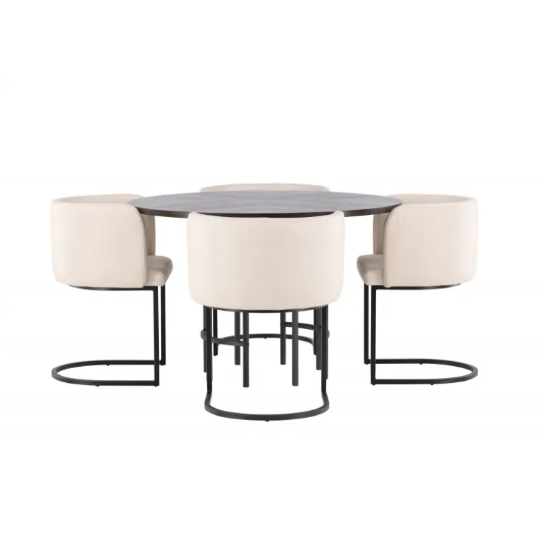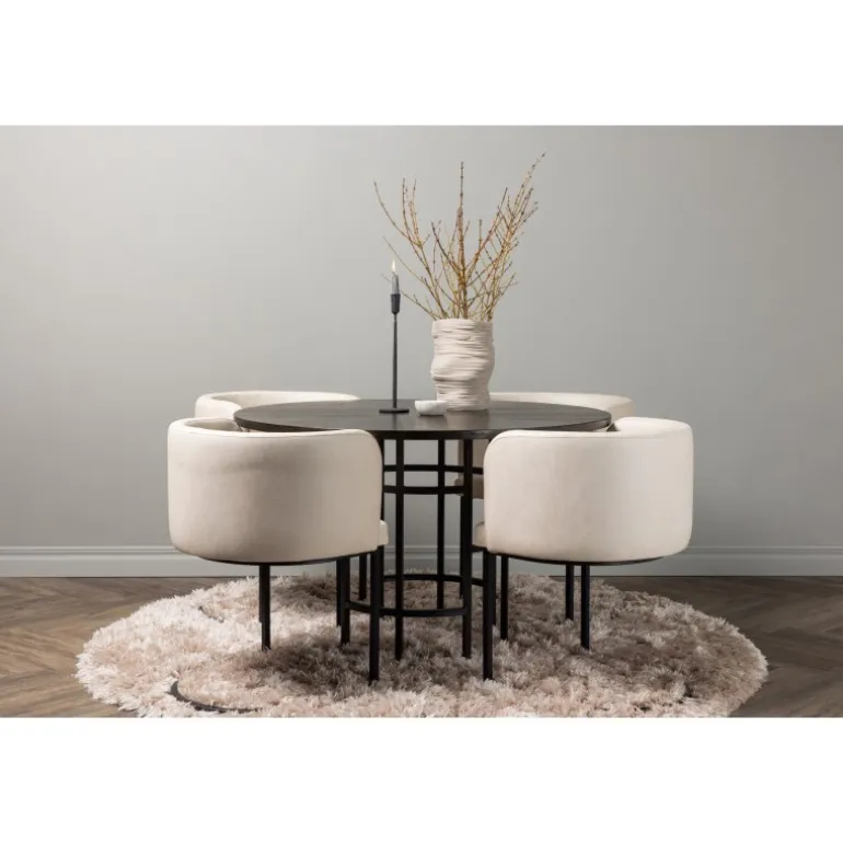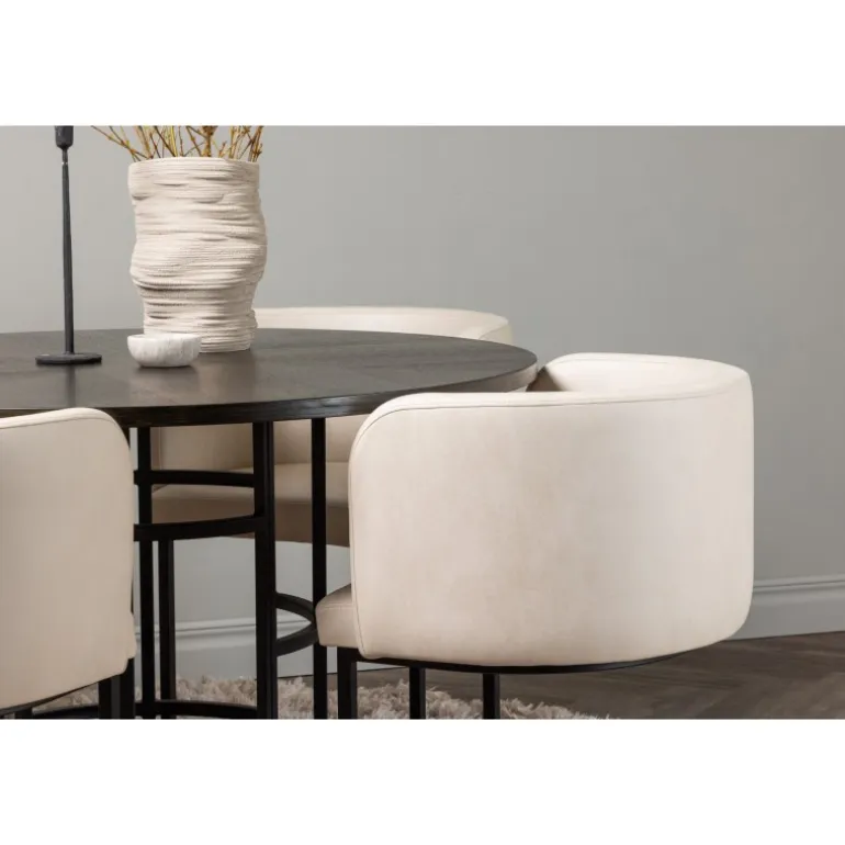 Møbler dit hjem luksuriøst og storslået! Vores runde spisebord Copenhagen har en smuk brun bordplade i MDF med finer og en dekorativ, cylinderformet base i sort metal. Her sammen med vores elegante spisebordsstole fra Simrishamn-serien. Stolen har et fuldt polstret sæde med en rund ryglæn i beige TC-stof og dekorative, minimalistiske ben i sort stål. Sid komfortabelt og nyd måltider med dine kære! Borddimensioner: 115 cm.