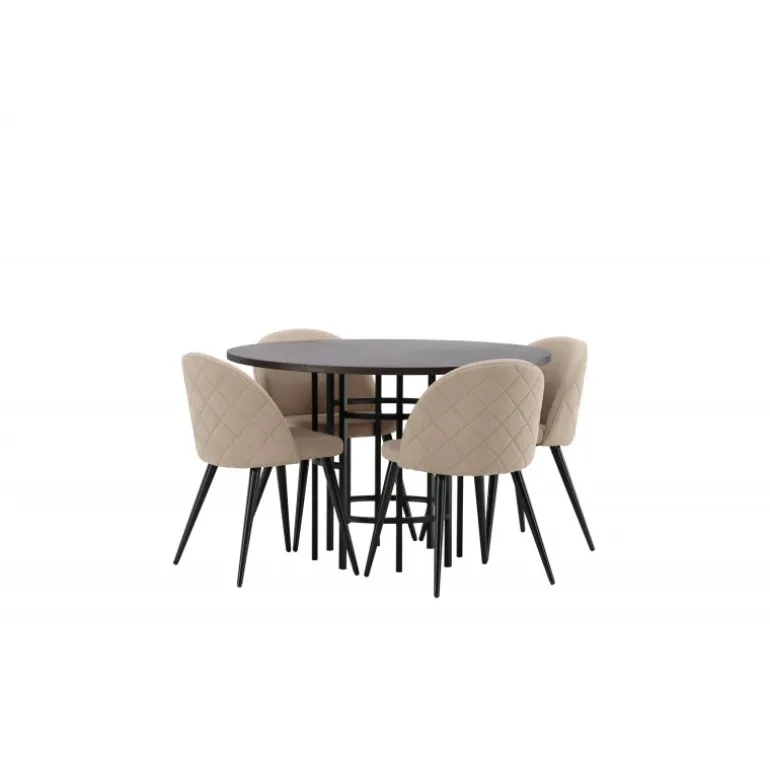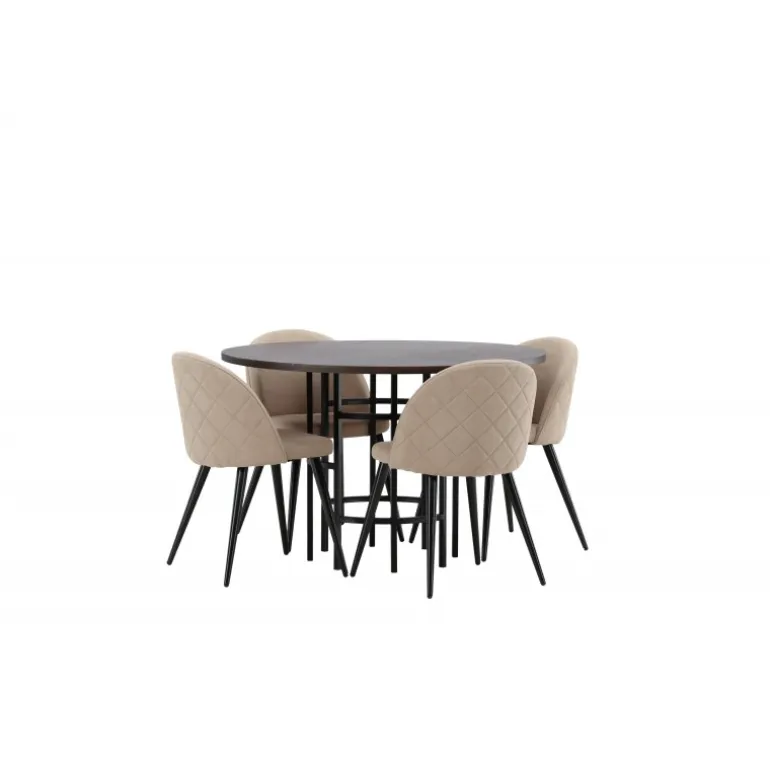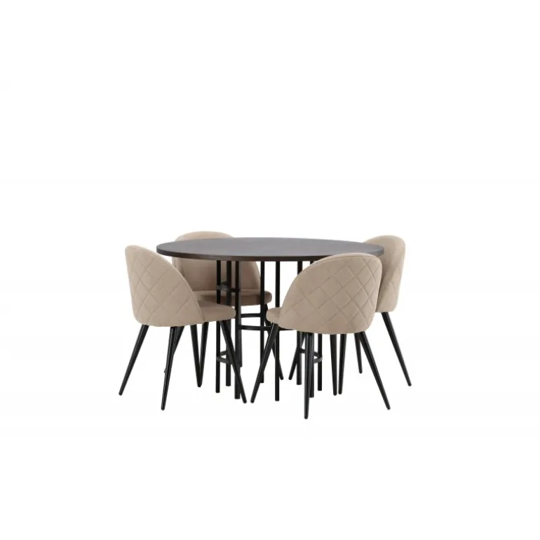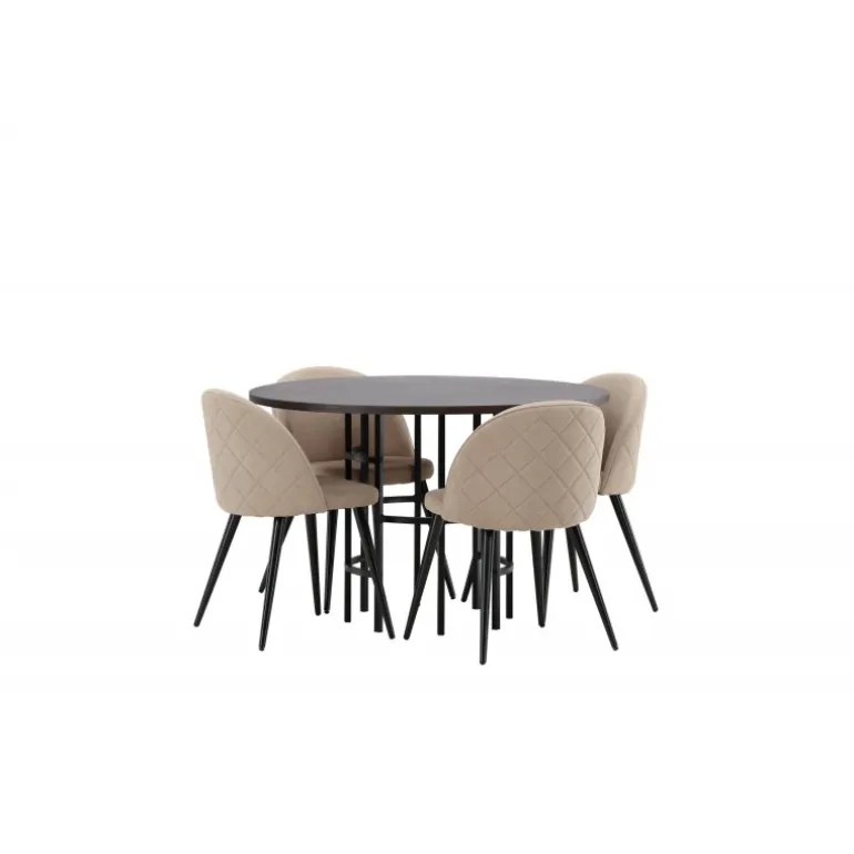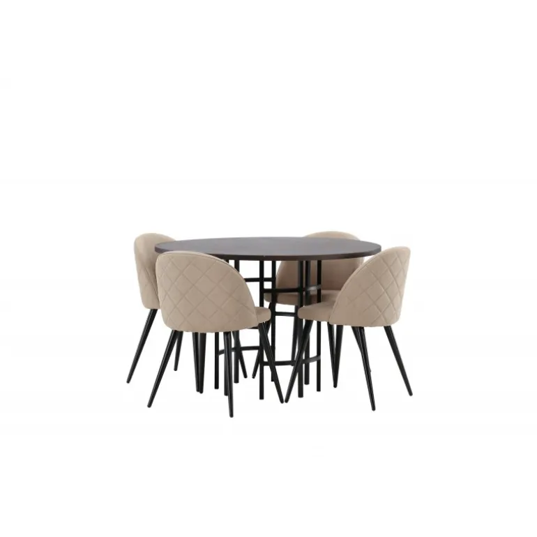 En komfortabel Spisebordssæt, der tåler tidens tand! Dette tidsløse spisebord fra Copenhagen-serien tilhører Furniture Fashion-kollektionen og har en smuk brun bordplade i MDF med finer og en dekorativ, cylinderformet base i sort metal. Her sammen med en moderne stol fra Velvet Stitches-serien i varm beige farve. Denne spisestol har et fuldt polstret design med en let rundet ryg og sæde i blødt polyesterstof og ben i sort pulverlakeret metal. Skab et charmerende midtpunkt til at samle familien omkring!