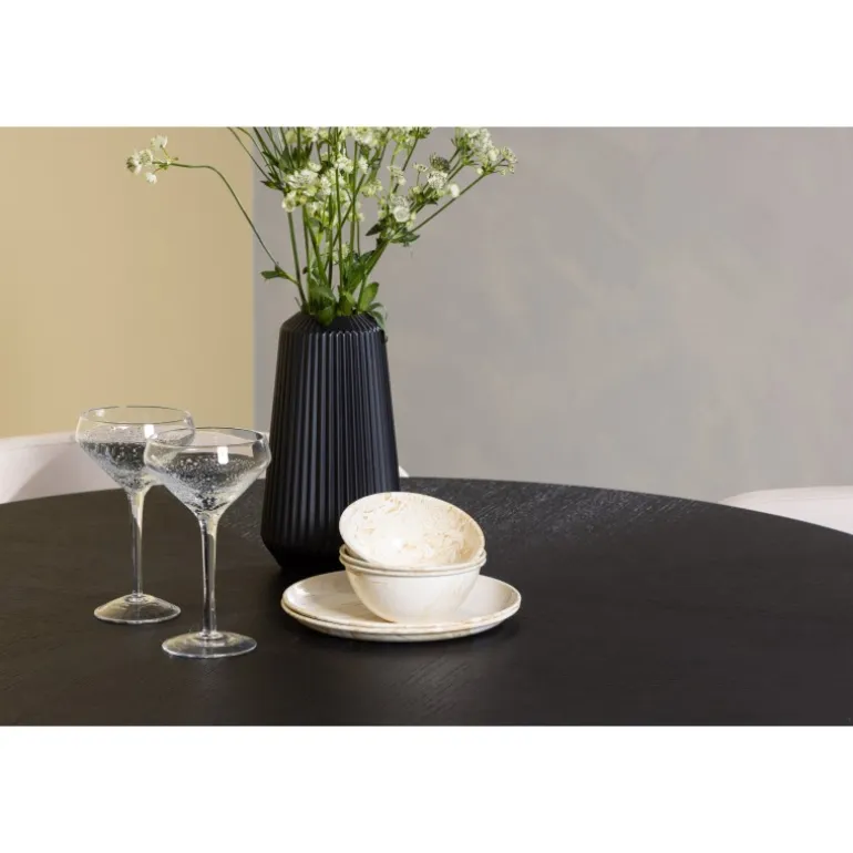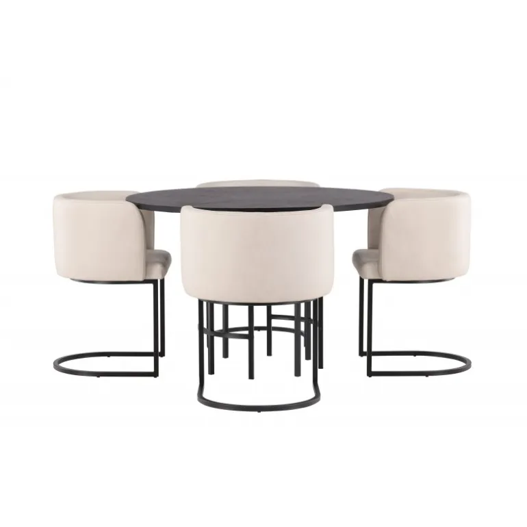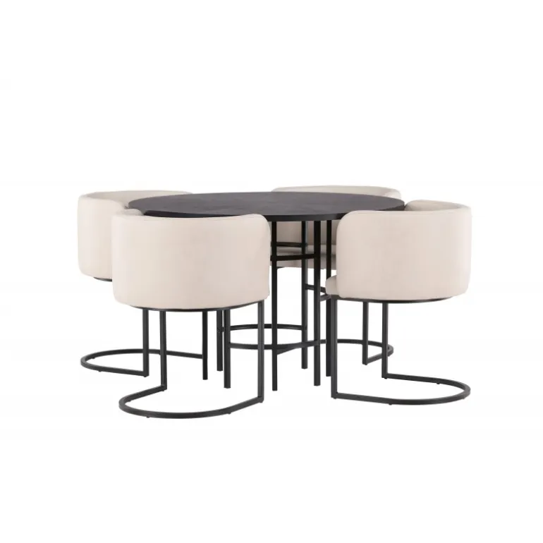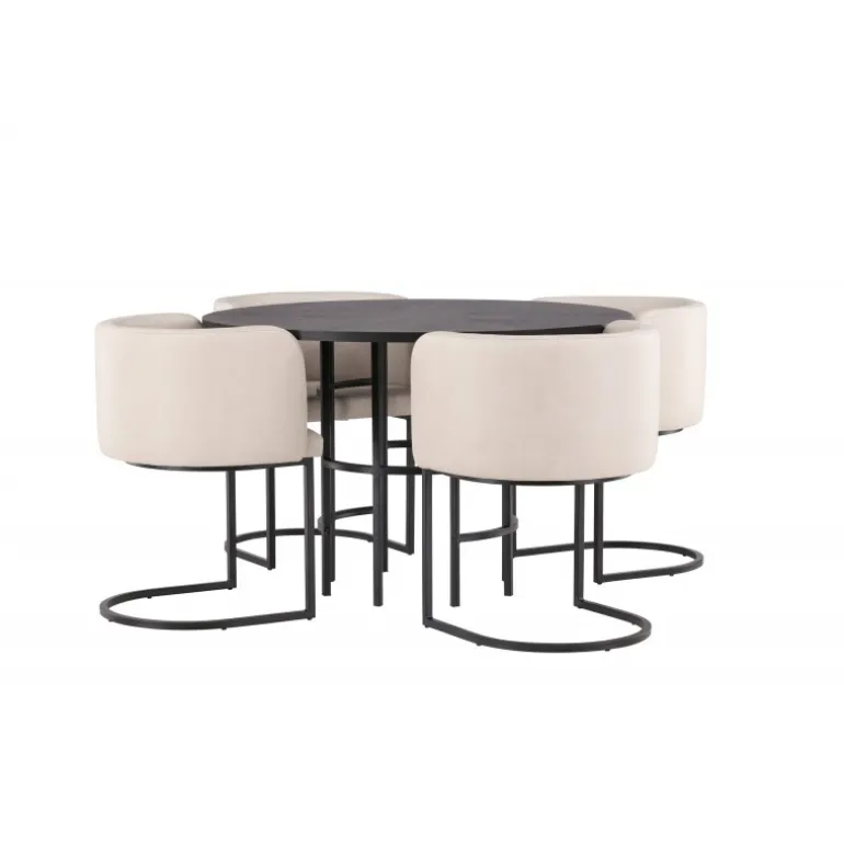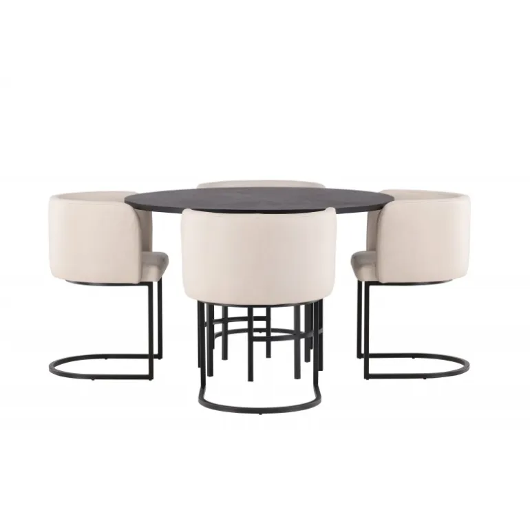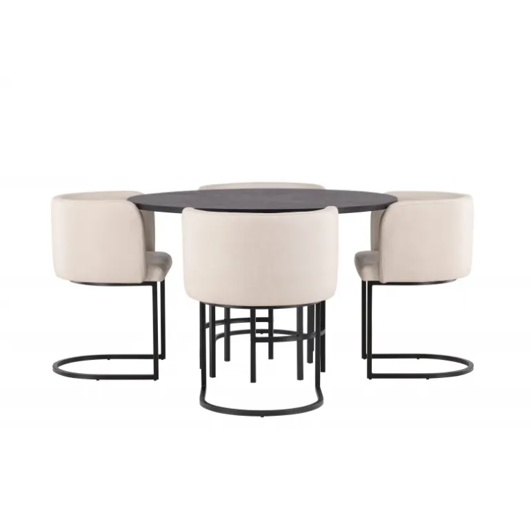 Det skal føles festligt at sætte sig ned til et lækkert måltid! Vores runde spisebord Copenhagen har en elegant, sort MDF bordplade og en dekorativ, cylinderformet base i sort metal. Her sammen med vores elegante spisebordsstole fra Simrishamn-serien. Stolen har et fuldt polstret sæde med en rundet ryglæn i beige TC stof og dekorative, minimalistiske ben i sort stål. Dette Spisebordssæt imponerer med sin luksuriøse karisma! Bordets dimensioner: 115 cm.