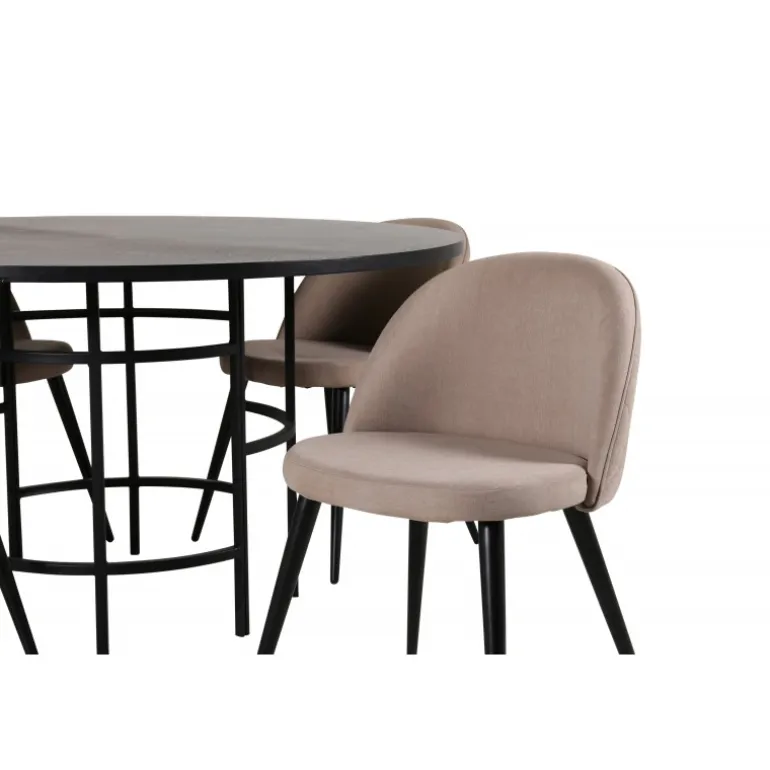 Gør din stue indbydende og tidløs med Copenhagen rundt Spisebordssæt! Copenhagen spisebord har et tidløst design i konsekvent sort farve med en bordplade i MDF med finer og et dekorativt, cylinderformet metalunderstel. Bordets diameter: 140 cm, højde: 74 cm. Her i en lækker kombination med 4 Velvet Stitches spisebordsstole. Stolens ben er let udsvinget i jern, og sæderne er betrukket med beige polyesterlinned med stilfulde dekorative stikninger. Stolens dimensioner: Højde: 76,5 cm, sædehøjde: 46,5 cm, bredde: 50 cm, dybde: 57 cm. Lige så godt for øjet som behageligt at sidde på!