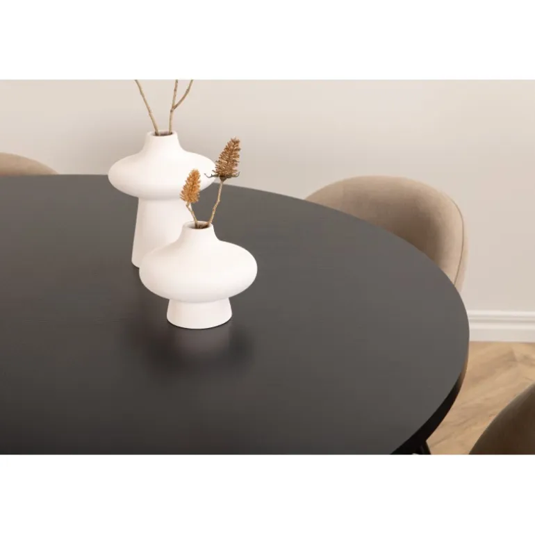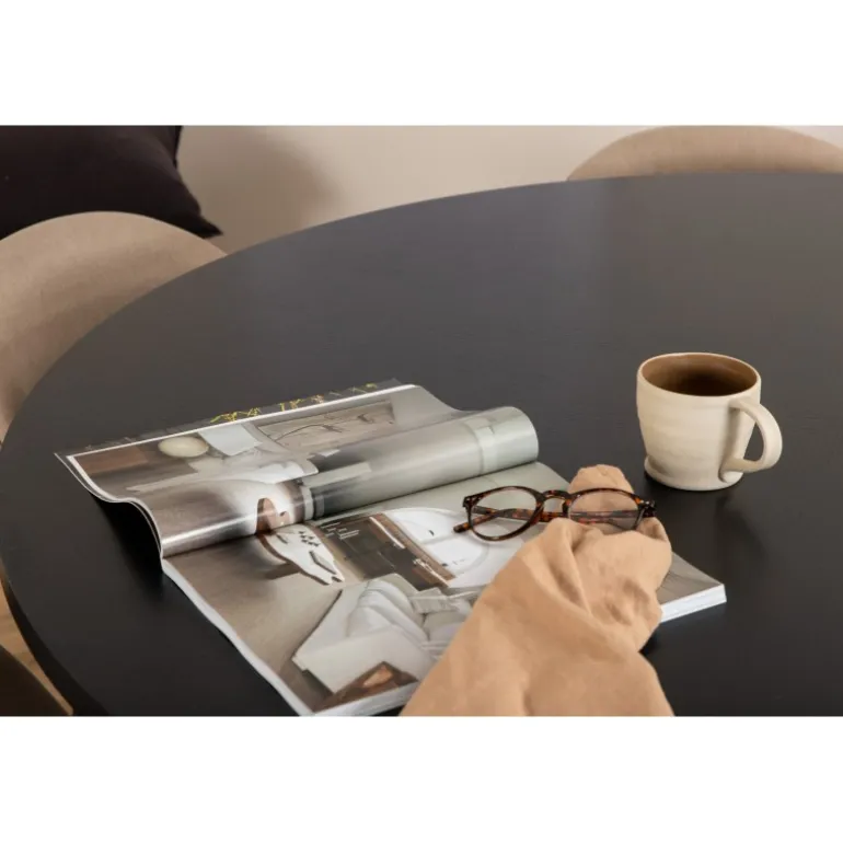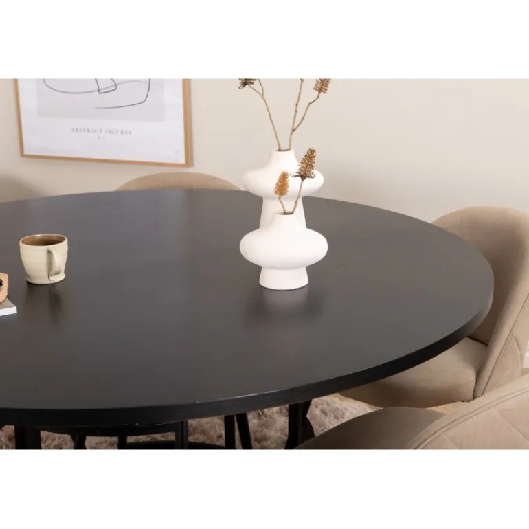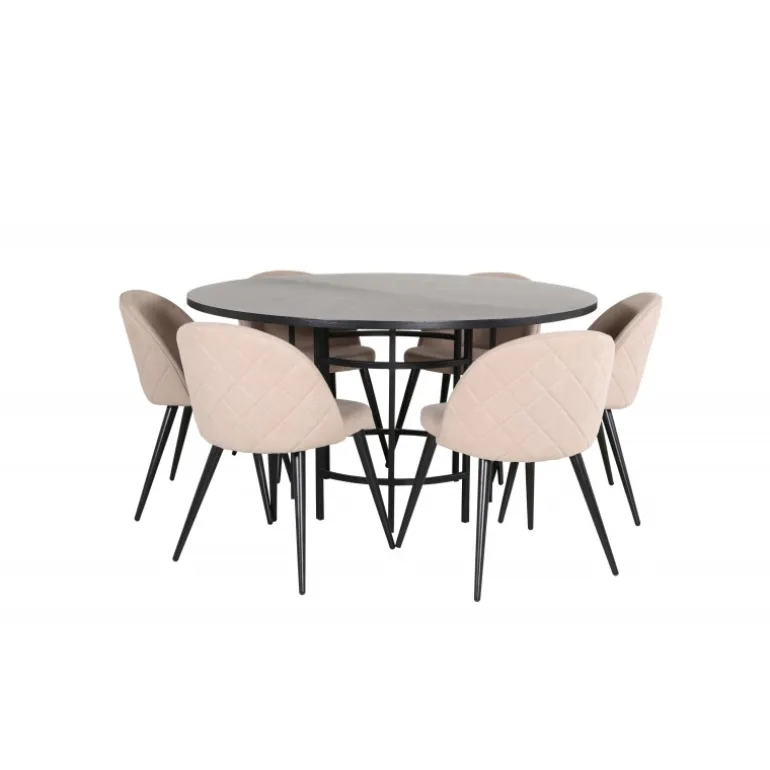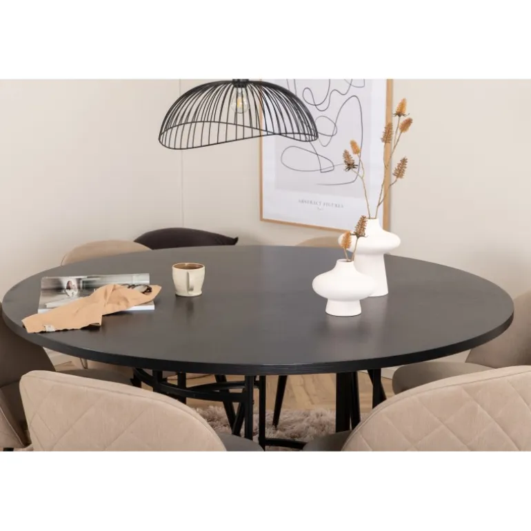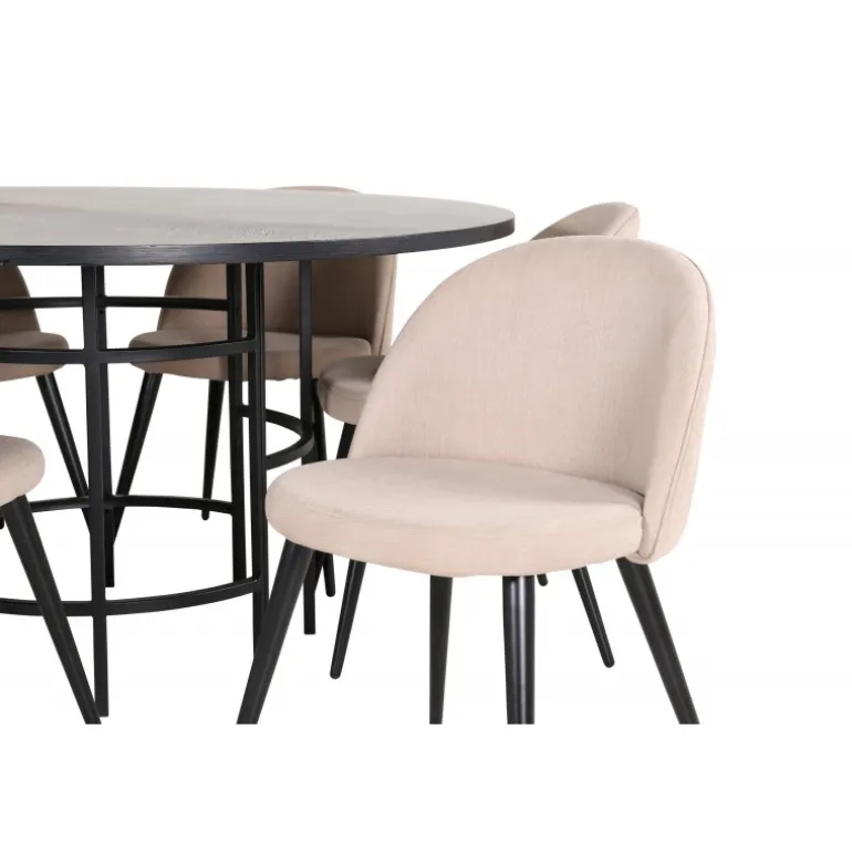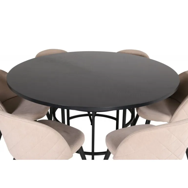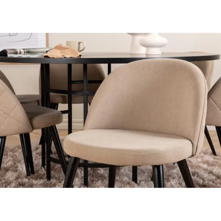 Giv din stue en indbydende og tidløs indretning med Copenhagen Rundt Spisebordssæt. Dette sæt har et trend-sikret design i en konsekvent sort farve med en bordplade i MDF med finer og en dekorativ, cylindrisk formet metalunderdel. Bordets diameter: 140 cm, højde: 74 cm. Sættet inkluderer også 6 Velvet Stitches spisestole. Stolens ben er let skrånende i jern, og sæderne er i beige polyester linnestof med stilfulde dekorative syninger. Stoldimensioner: Højde: 76,5 cm, sædehøjde: 46,5 cm, bredde: 50 cm, dybde: 57 cm. Lige så flot at se på, som det er behageligt at sidde på!