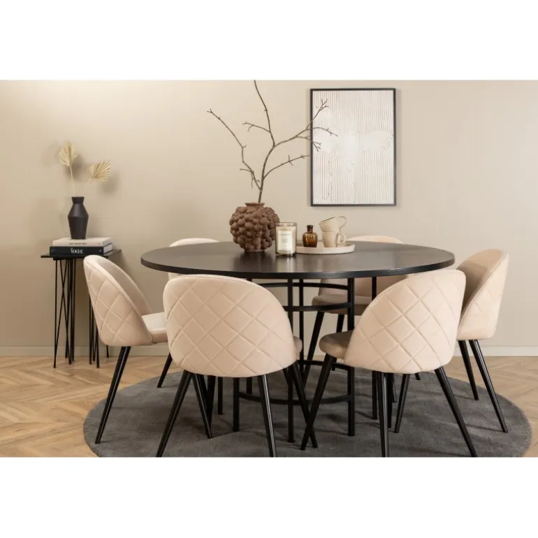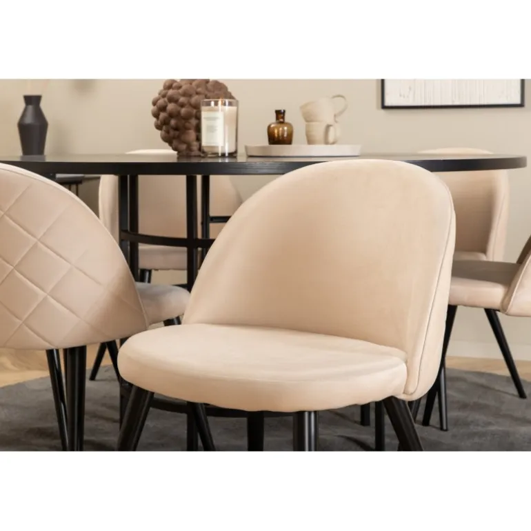Inviterende, bekvemt og iøjnefaldende! Copenhagen Rundt Spisebordssæt har et tidløst design i gennemgående sort farve med en bordplade i MDF med finer og en dekorativ, cylindrisk formet metalunderdel. Bord Diameter: Diameter: 140cm, Højde: 74cm. Her i lækker kombination med 6 Velvet Stitches spisestole. Stolens ben er let flarede i jern, og sæderne er i beige velourstof med stilfuldt dekorativt syning. Stoledimensioner: Højde: 76,5cm, sædehøjde: 46,5cm, bredde: 50cm, dybde: 57cm. Indret stuen hjemligt og moderne!