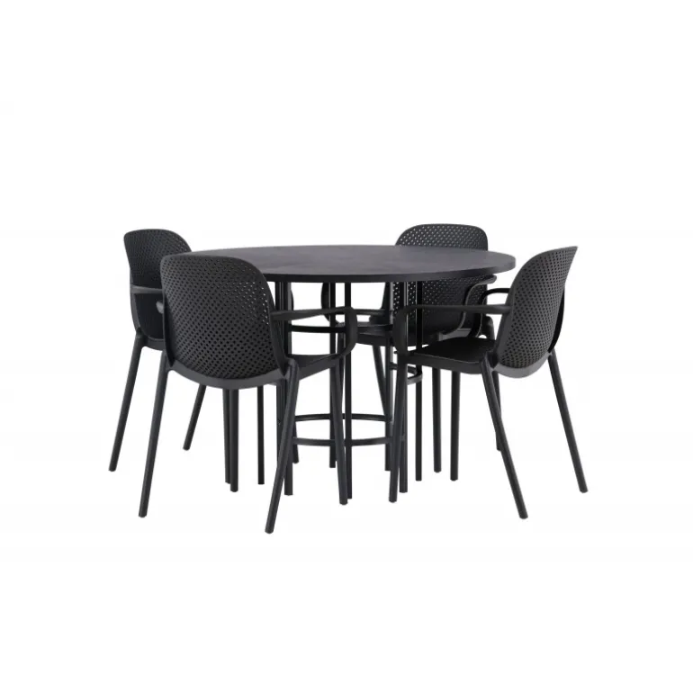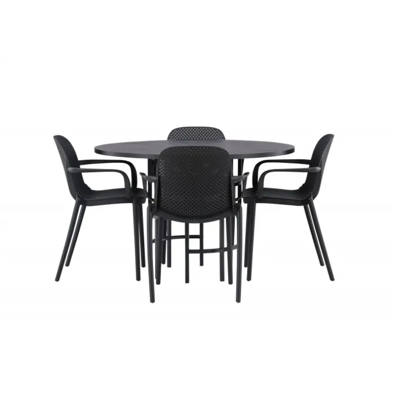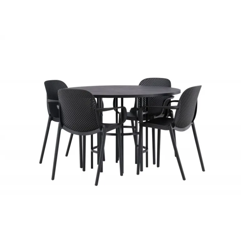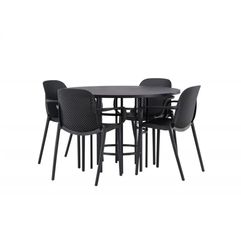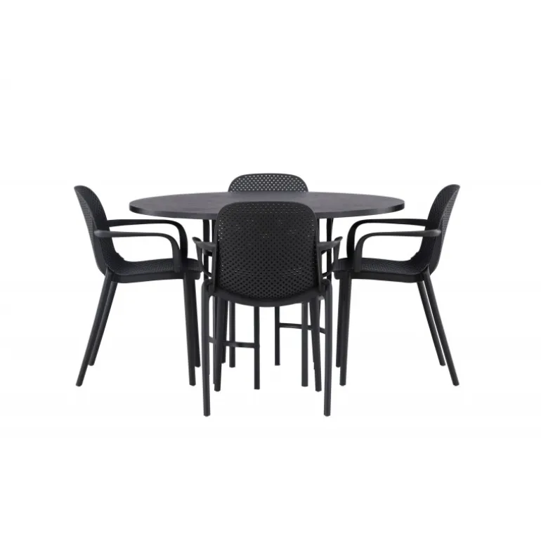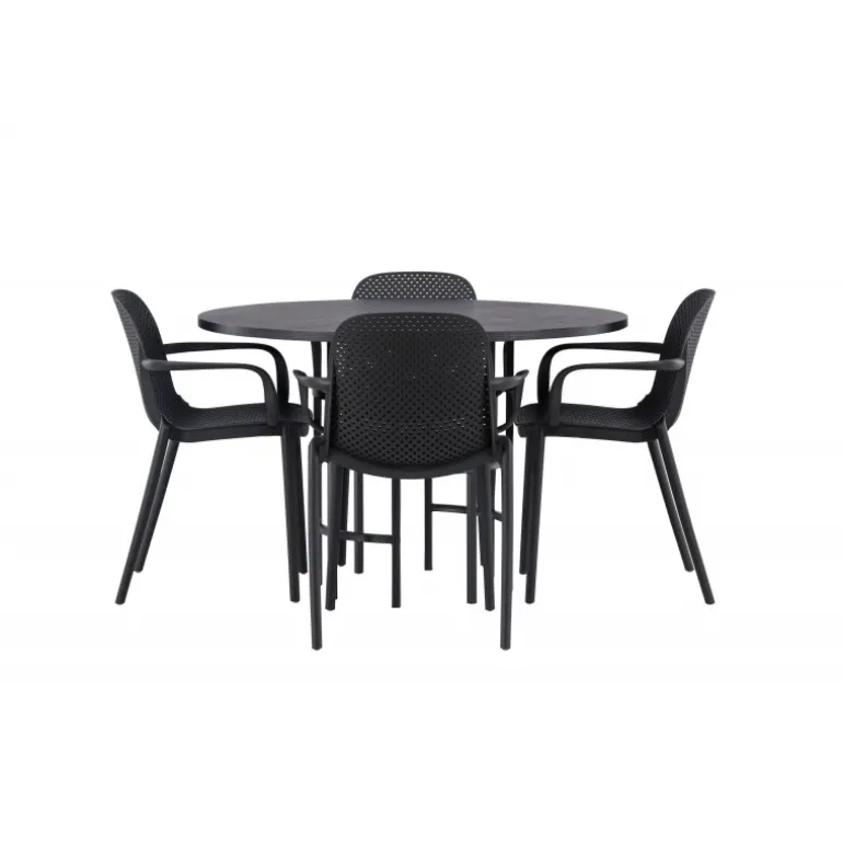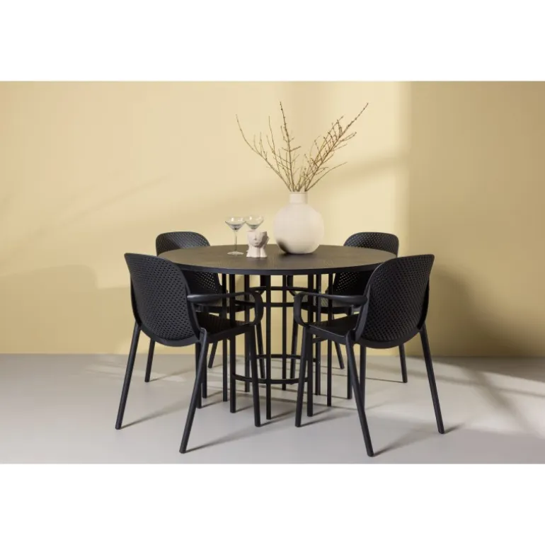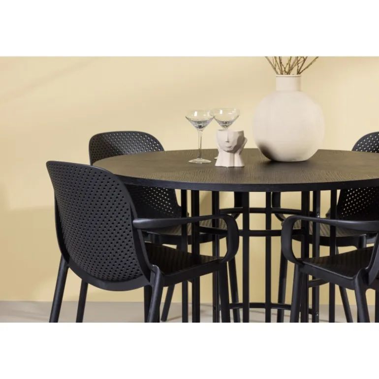 Her mødes industrielt design med bløde former! Vores runde spisebord, Copenhagen, har en elegant, sort bordplade i MDF og en dekorativ, cylinderformet base i sort metal. Her sammen med vores smarte spisebordsstole fra Baltimore-serien. Stolen er lavet af sort plastik og designet er trendy med lige nordiske former og integrerede armlæn for ekstra komfort. Sid komfortabelt og stilfuldt fremover! Bordets dimensioner: 115cm.