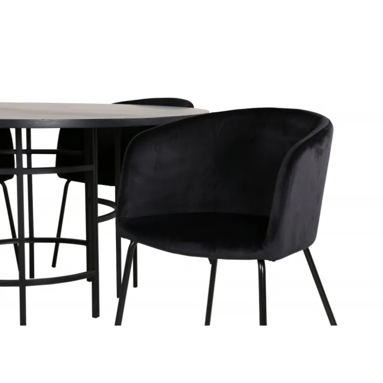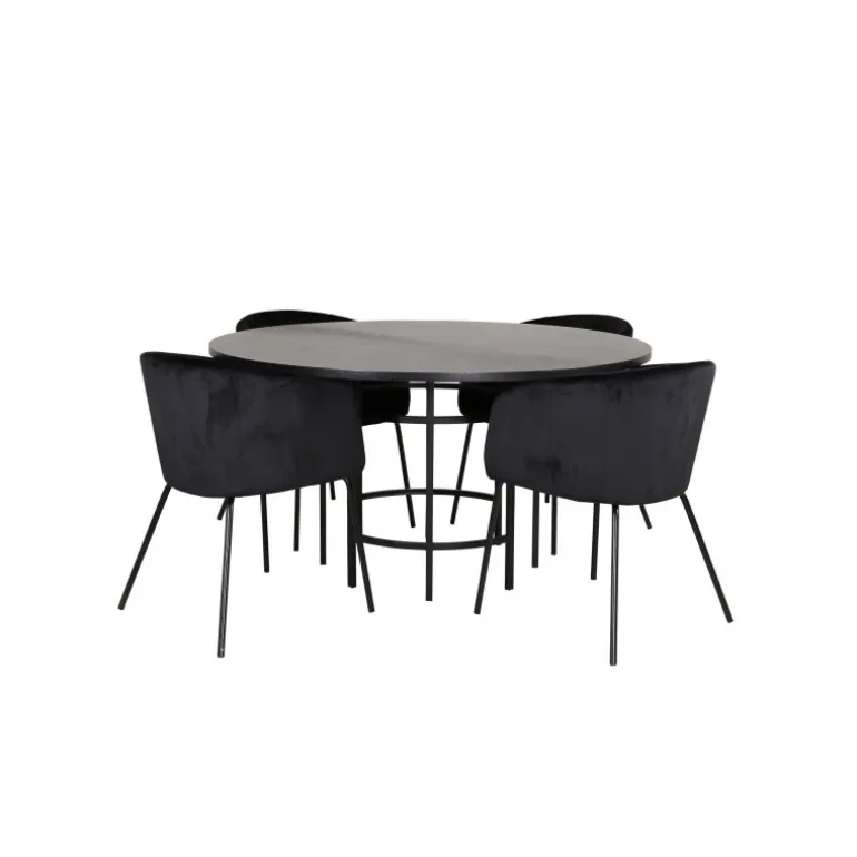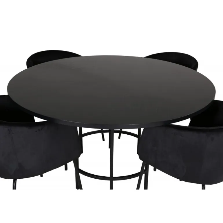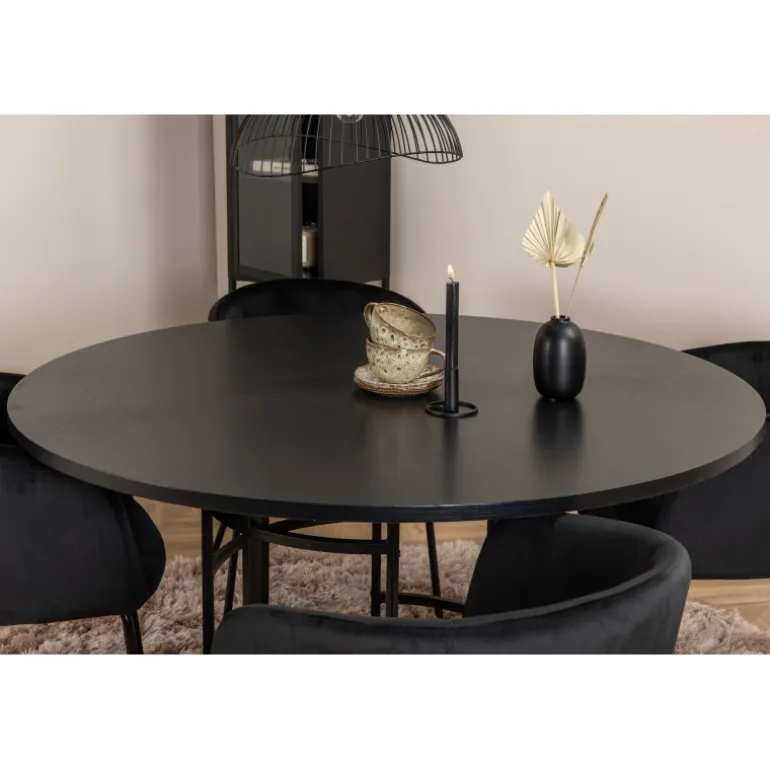 Skab et charmerende midtpunkt i hjemmets hjerte med et rundt spisebordssæt i moderne look! Copenhagen spisebord har et trend-sikkert design i ensartet sort farve med en bordplade i MDF med finer og et dekorativt, cylindrisk formet metalunderstel. Borddiameter: Diameter: 140cm, Højde: 74cm. Her er det matchet med 4 Berit spisebordsstole i luksuriøst design. Stolene har en behagelig sædehynde i sort fløjl og stilfulde, slanke ben i jern. Stoledimensioner: Højde: 78cm, sædehøjde: 49cm, bredde: 55cm, dybde: 55cm. Indret for en hyggelig middagstid!