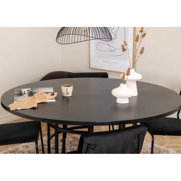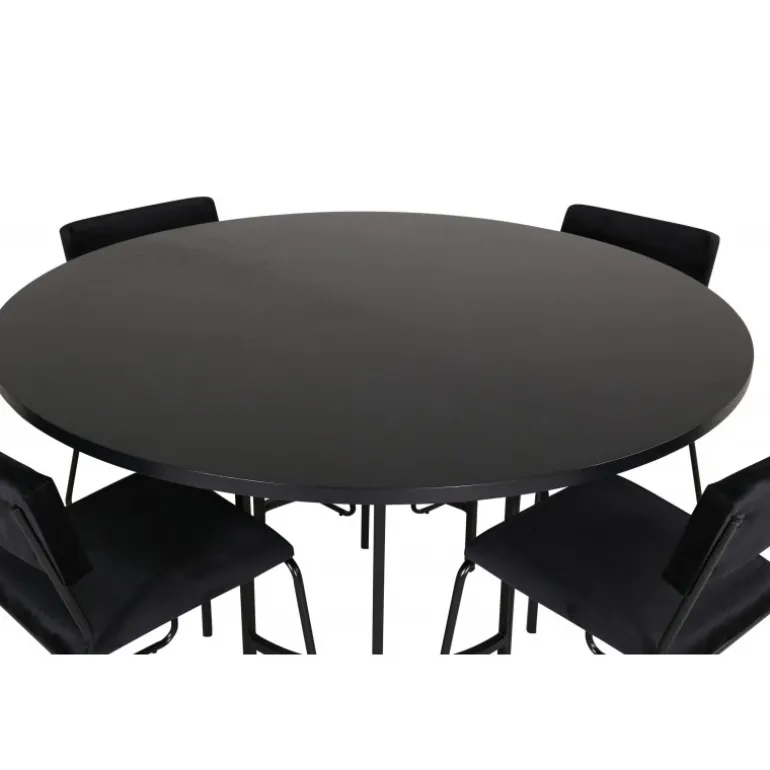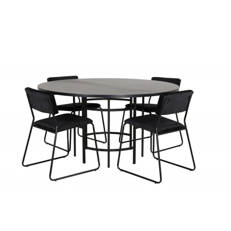 Kombiner det industrielle look med minimalistisk indretning! Copenhagen Spisebordssæt har et trend-sikkert design i konsekvent sort farve med en bordplade i MDF med finer og en dekorativ, cylindrisk formet metal underdel. Bordets diameter: 140 cm, højde: 74 cm. Matchet her med 4 stilfulde spisebordsstole fra Kenth-serien. Stolens ben er smalle i jern og sæderne er behagelige i sort velourstof. Stolens dimensioner: Højde: 76 cm, sædehøjde: 48,5 cm, bredde: 40 cm, dybde: 52 cm. Skab et charmerende midtpunkt til at samle familie og venner!