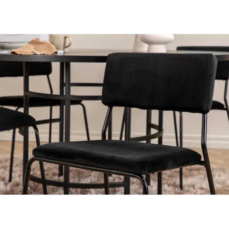 - Komfortable stole: Sæder i blød, sort velourstof og smalle jernben.