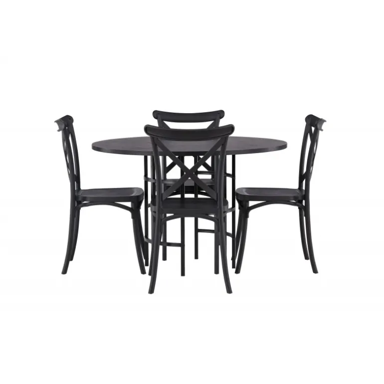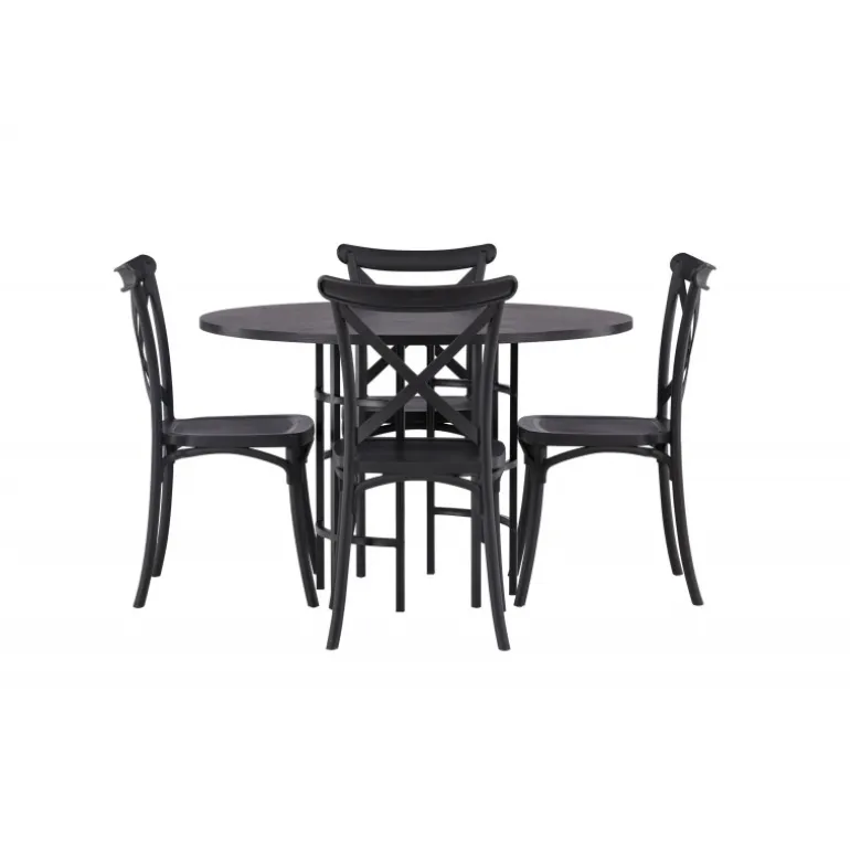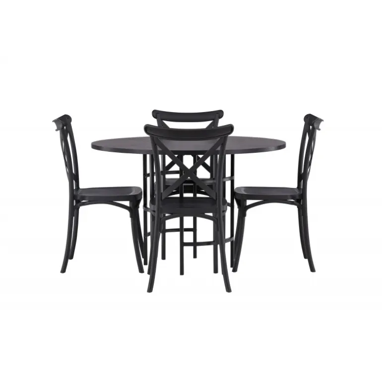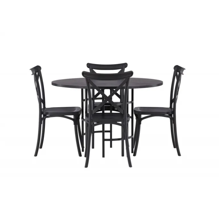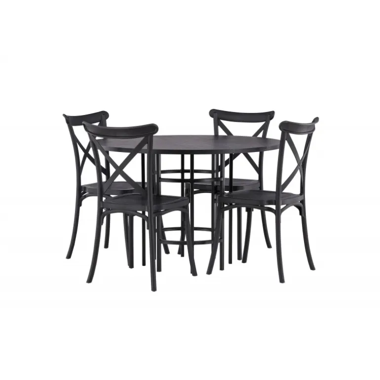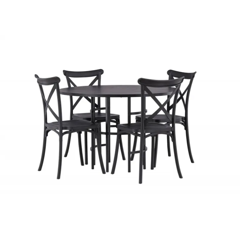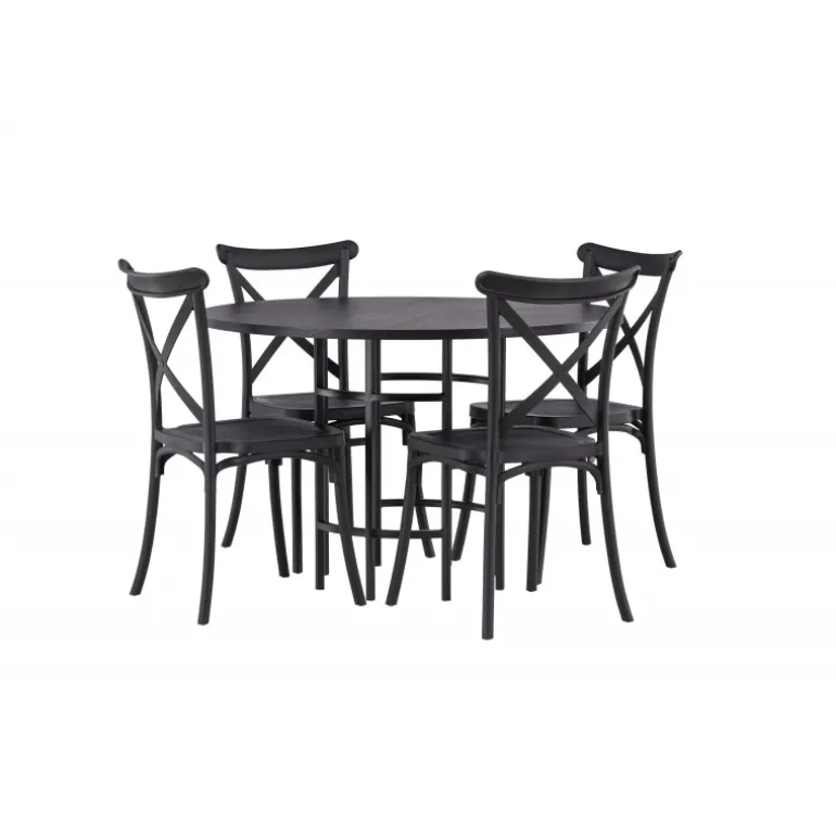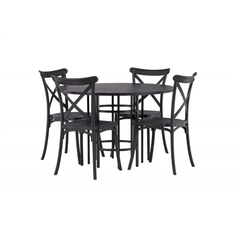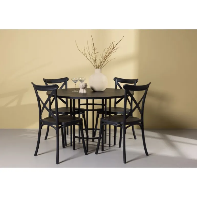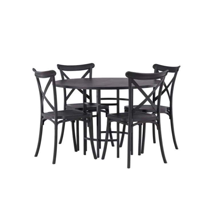 Det industrielle design beskriver dette Spisebordssæt perfekt! Vores runde spisebord Copenhagen har en elegant, sort bordplade i MDF og en dekorativ, cylinderformet base i sort metal. Her i stilfuld kombination med sorte spisebordsstole fra Crosett-serien. Stolen er konsekvent lavet af det praktiske materiale plastik og har en mat sort farve, der står tidens prøve. Lad tiden her være dagens højdepunkt! Bordets dimensioner: 115 cm.