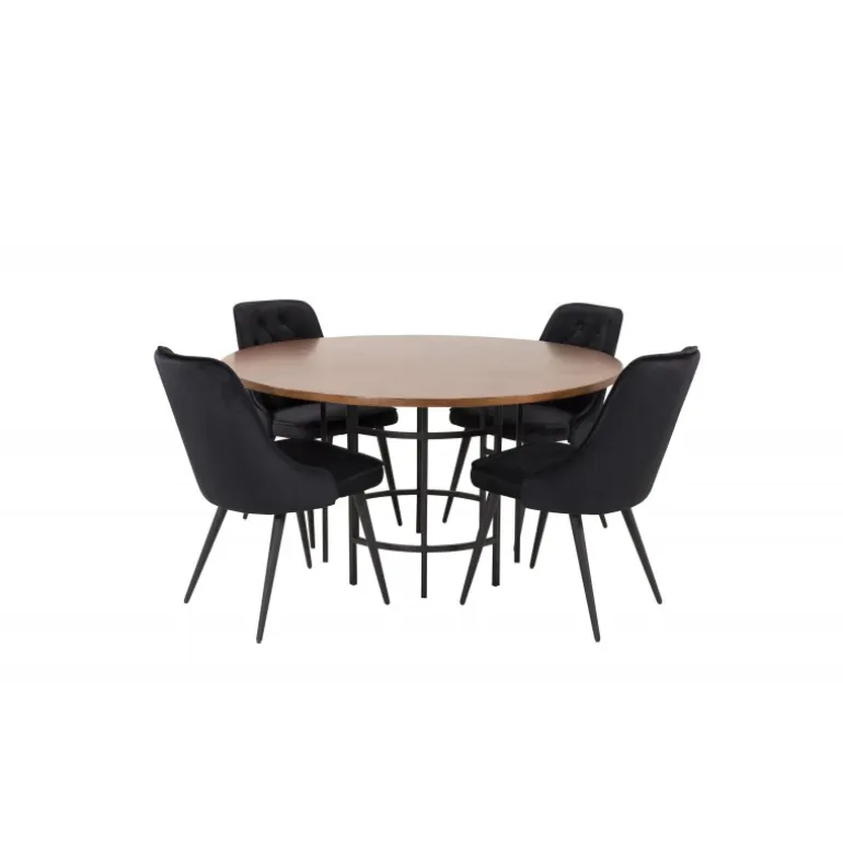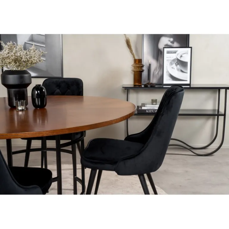 Oplev en moderne Spisebordssæt, der skaber en luksuriøs følelse. Vores runde spisebord Copenhagen kombineret med de bløde og komfortable stole i serien Velvet Inger tilføjer direkte luksus og elegance til dit hjem. Med et stilfuldt design og kvalitetsmaterialer som MDF, krydsfiner, stål og finer, er dette sæt både holdbart og æstetisk tiltalende. Fås i sort og brun farve, med en naturfarvet bordplade, der komplementerer enhver indretning.