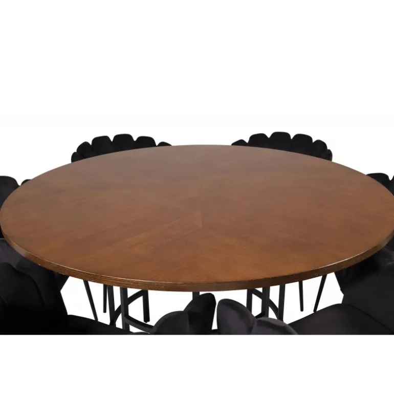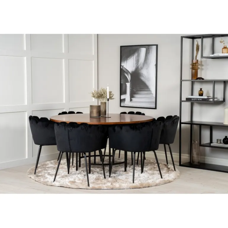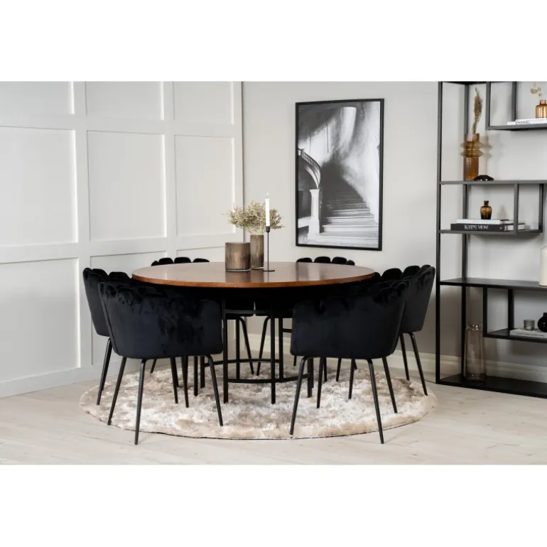 Elegant og pompøs! Rundt Spisebordssæt fra Furniture Fashion kollektionen. Gennemført sort udtryk, hvor de velourbetrukne stole møder en mørk trælignende bordplade, hvilket giver en luksuriøs følelse. Bordet Copenhagen sammen med de sorte velourstole i Limhamn-serien. Inviter til mange hyggelige familiemiddage!