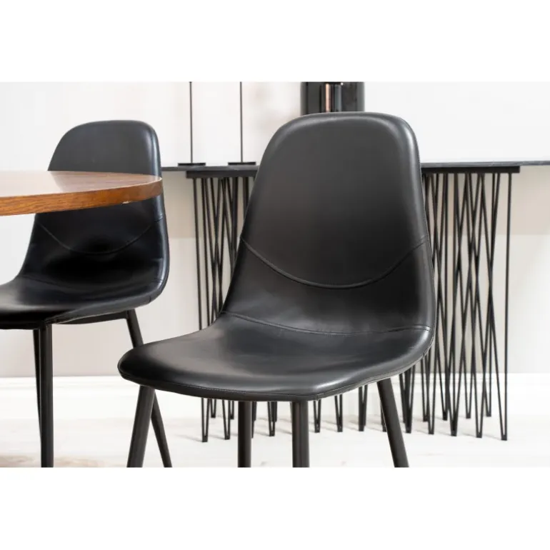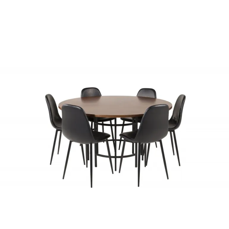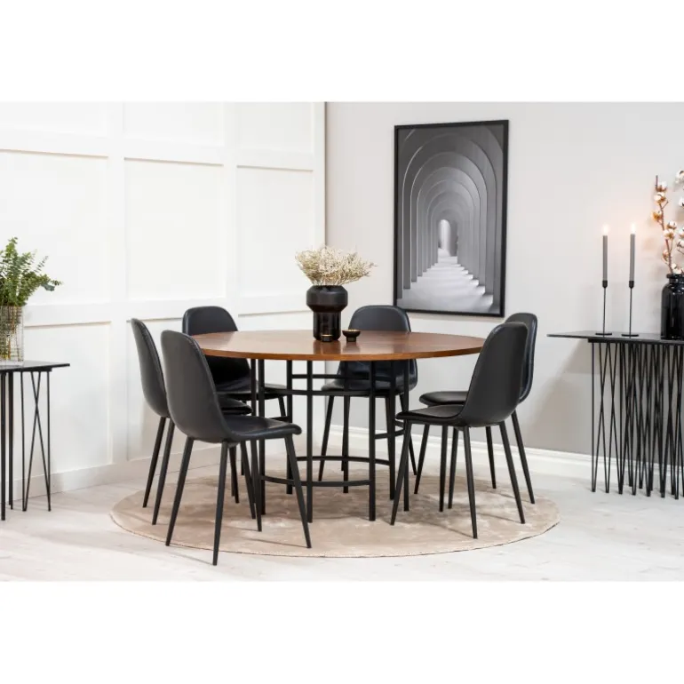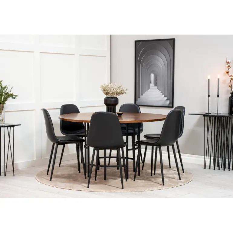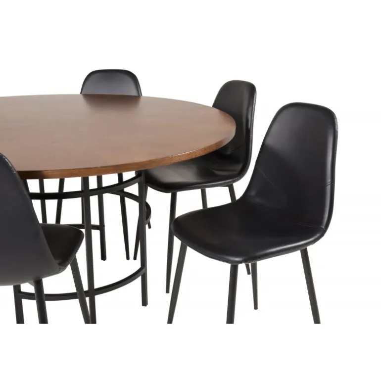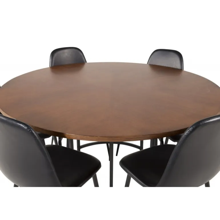 Copenhagen Rundt Spisebordssæt er den perfekte kombination af moderne, hyggelig og tidløs stil. Spisebordet har en smuk brun bordplade og et dekorativt understel i sort metal. Sammen med spisestolene fra Polar-serien får du et sæt, der er ideelt til enhver spisestue. Copenhagen Rundt Spisebordssæt er designet til at passe ind i både moderne og traditionelle hjem, hvilket gør det til en alsidig tilføjelse til din boligindretning.