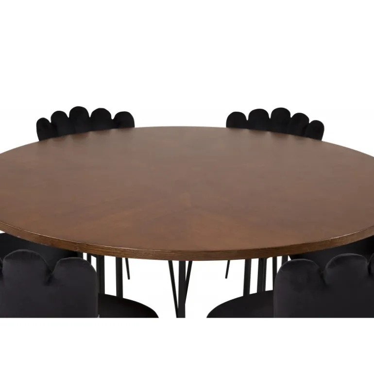 Oplev den elegante og pompøse charme ved Copenhagen Rundt Spisebordssæt! En del af den eksklusive Furniture Fashion-kollektion, der kombinerer sorte velourstole med en mørkebrun bordplade lavet af MDF, stål og finer. Dette sæt skaber en luksuriøs atmosfære i dit hjem. Bordet Copenhagen og de sorte velourstole fra Limhamn-serien tilbyder plads til mange gæster – perfekt til hyggelige familiemiddage.