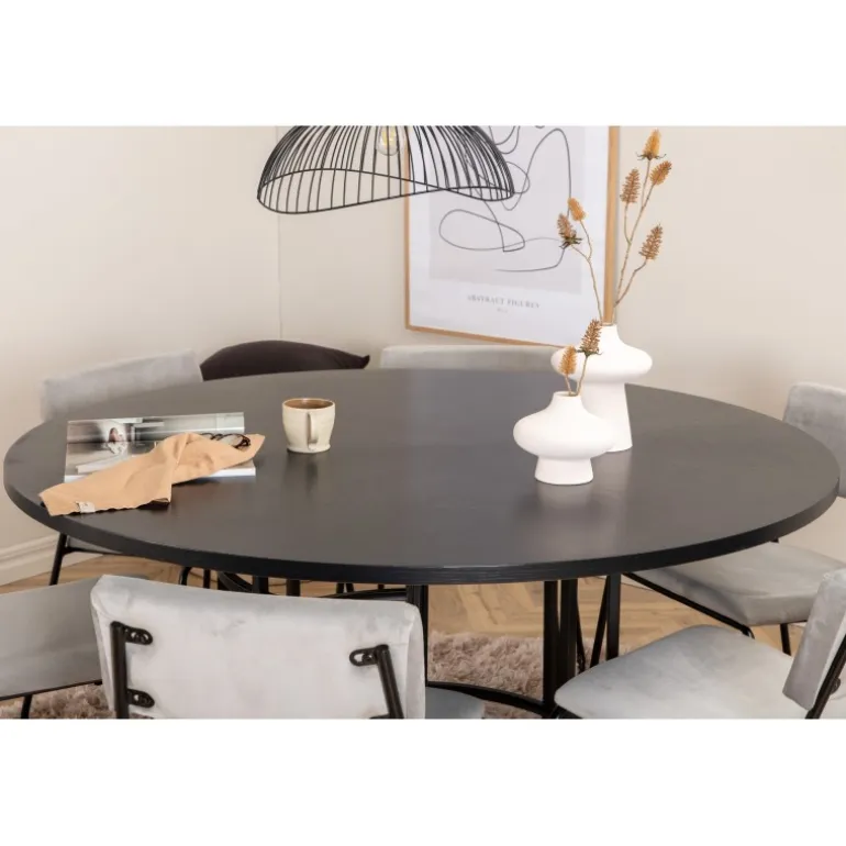 Kombiner det industrielle look med minimalistisk indretning! Copenhagen Spisebordssæt har et tidsløst design i konsekvent sort farve med en bordplade i MDF med finer og en dekorativ, cylindrisk formet metalunderstel. Bordets diameter: 140cm, Højde: 74cm. Matchet her med 6 stilfulde spisestole fra Kenth-serien. Stolens ben er smalle i jern, og de komfortable sæder er i lysegråt fløjlsstof. Stolens dimensioner: Højde: 76cm, sædehøjde: 48,5cm, bredde: 40cm, dybde: 52cm. Skab et charmerende midtpunkt at samle familie og venner omkring!